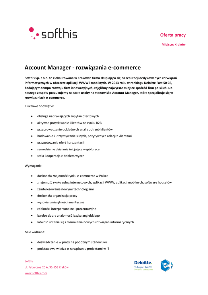 Oferta pracy Miejsce: Kraków Account Manager - rozwiązania e-commerce Softhis Sp. z o.o. to zlokalizowana w Krakowie firma skupiająca się na realizacji dedykowanych rozwiązań informatycznych w obszarze aplikacji WWW i mobilnych. W 2013 roku w rankingu Deloitte Fast 50 CE, badającym tempo rozwoju firm innowacyjnych, zajęliśmy najwyższe miejsce spośród firm polskich. Do naszego zespołu poszukujemy na stałe osoby na stanowisko Account Manager, która specjalizuje się w rozwiązaniach e-commerce. Kluczowe obowiązki: obsługa napływających zapytań ofertowych aktywne pozyskiwanie klientów na rynku B2B przeprowadzanie dokładnych analiz potrzeb klientów budowanie i utrzymywanie silnych, pozytywnych relacji z klientami przygotowanie ofert i prezentacji samodzielne działania inicjujące współpracę stała kooperacja z działem wycen Wymagania: doskonała znajomość rynku e-commerce w Polsce znajomość rynku usług internetowych, aplikacji WWW, aplikacji mobilnych, software house’ów zainteresowanie nowymi technologiami doskonała organizacja pracy wysokie umiejętności analityczne zdolności interpersonalne i prezentacyjne bardzo dobra znajomość języka angielskiego łatwość uczenia się i rozumienia nowych rozwiązań informatycznych Mile widziane: doświadczenie w pracy na podobnym stanowisku podstawowa wiedza o zarządzaniu projektami w IT Softhis ul. Fabryczna 20 A, 31-553 Kraków www.softhis.com Oferujemy: pracę w jednym z najszybciej rozwijających się i perspektywicznych sektorów gospodarki atrakcyjne wynagrodzenie ubezpieczenie zdrowotne i pakiet Multisport możliwość rozwoju zawodowego pracę w świetnej, przyjaznej atmosferze i przy ciekawych projektach Jeśli jesteś zainteresowany/a pracą w Softhis oraz spełniasz powyższe wymagania, wyślij do nas CV na adres: [email protected] z dopiskiem w tytule maila – „AM/EC”. Zapraszamy! Softhis ul. Fabryczna 20 A, 31-553 Kraków www.softhis.com
