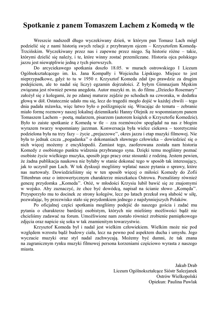 Spotkanie z panem Tomaszem Lachem z Komedą w tle Wreszcie nadszedł długo wyczekiwany dzień, w którym pan Tomasz Lach mógł podzielić się z nami historią swych relacji z przybranym ojcem – Krzysztofem KomedąTrzcińskim. Wyczekiwany przez nas i zapewne przez niego. Są historie różne – takie, którymi dzielić się należy, i te, które winny zostać przemilczane. Historia ojca polskiego jazzu jest niewątpliwie jedną z tych pierwszych. Do arcyciekawego spotkania doszło 18.05. w murach ostrowskiego I Liceum Ogólnokształcącego im. ks. Jana Kompałły i Wojciecha Lipskiego. Miejsce to jest nieprzypadkowe, gdyż to tu w 1950 r. Krzysztof Komeda zdał (po prawdzie za drugim podejściem, ale to nadal się liczy) egzamin dojrzałości. Z byłym Gimnazjum Męskim związana jest również pewna anegdota. Autor muzyki m. in. do filmu ,,Dziecko Rosemary’’ założył się z kolegami, że po zdanej maturze zejdzie po schodach na czworaka, w dodatku głową w dół. Ostatecznie udało mu się, lecz do tragedii mogło dojść w każdej chwili – tego dnia padała mżawka, więc łatwo było o poślizgnięcie się. Wracając do tematu – zebranie miało formę rozmowy naszej lokalnej dziennikarki Hanny Olejnik ze wspomnianym panem Tomaszem Lachem – poetą, malarzem, pisarzem (autorem książek o Krzysztofie Komedzie). Było to zaiste spotkanie z Komedą w tle – zza rozmówców spoglądał na nas z błogim wyrazem twarzy wspomniany jazzman. Konwersacja była wielce ciekawa – teoretycznie podzielona była na trzy fazy – życie ,,prejazzowe’’, okres jazzu i etap muzyki filmowej. Nie była to jednak czcza ,,pogadanka’’ o dokonaniach sławnego człowieka – dowiedzieć się o nich więcej możemy z encyklopedii. Zamiast tego, zaoferowana została nam historia Komedy z osobistego punktu widzenia przybranego syna. Dzięki temu mogliśmy poznać osobiste życie wielkiego muzyka, sposób jego pracy oraz stosunki z rodziną. Jestem pewien, że żadna publikacja naukowa nie byłaby w stanie dokonać tego w sposób tak interesujący, jak to uczynił pan Lach. W tok dyskusji mogliśmy wplatać nasze pytania o sprawy, które nas nurtowały. Dowiedzieliśmy się w ten sposób więcej o miłości Komedy do Zofii Tittenbrun oraz o introwertycznym charakterze mieszkańca Ostrowa. Poznaliśmy również genezę przydomka ,,Komeda’’. Otóż, w młodości Krzysiu lubił bawić się ze znajomymi w wojsko. Aby zaznaczyć, że chce być dowódcą, napisał na ścianie słowo ,,Komęda’’. Przysporzyło mu to docinek ze strony kolegów, lecz po latach przekuł swą słabość w siłę, pozwalając, by przezwisko stało się przydomkiem jednego z najsłynniejszych Polaków. Po oficjalnej części spotkania mogliśmy podejść do naszego gościa i zadać mu pytania o charakterze bardziej osobistym, których nie mieliśmy możliwości bądź nie chcieliśmy zadawać na forum. Umożliwione nam zostało również zrobienie pamiątkowego zdjęcia oraz napicie się soku w tak znamienitym towarzystwie. Krzysztof Komeda był i nadal jest wielkim człowiekiem. Wielkim może nie pod względem wzrostu bądź budowy ciała, lecz na pewno pod aspektem ducha i umysłu. Jego wyczucie muzyki oraz styl nadal zachwycają. Możemy być dumni, że tak znana na zagranicznym rynku muzyki filmowej persona korzeniami częściowo wyrasta z naszego miasta. Jakub Drab Liceum Ogólnokształcące Sióstr Salezjanek Ostrów Wielkopolski Opiekun: Paulina Pawlak
