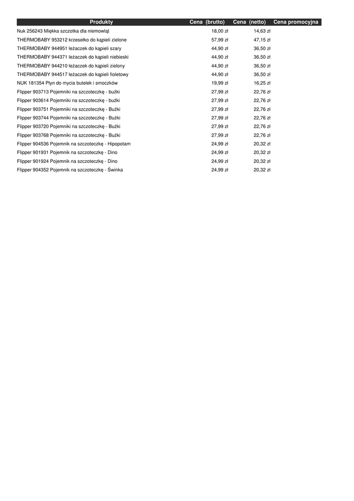 Produkty Cena (brutto) Cena (netto) Nuk 256243 Miękka szczotka dla niemowląt 18,00 zł 14,63 zł THERMOBABY 953212 krzesełko do kąpieli zielone 57,99 zł 47,15 zł THERMOBABY 944951 leżaczek do kąpieli szary 44,90 zł 36,50 zł THERMOBABY 944371 leżaczek do kąpieli niebieski 44,90 zł 36,50 zł THERMOBABY 944210 leżaczek do kąpieli zielony 44,90 zł 36,50 zł THERMOBABY 944517 leżaczek do kąpieli fioletowy 44,90 zł 36,50 zł NUK 181354 Płyn do mycia butelek i smoczków 19,99 zł 16,25 zł Flipper 903713 Pojemniki na szczoteczkę - buźki 27,99 zł 22,76 zł Flipper 903614 Pojemniki na szczoteczkę - buźki 27,99 zł 22,76 zł Flipper 903751 Pojemniki na szczoteczkę - Buźki 27,99 zł 22,76 zł Flipper 903744 Pojemniki na szczoteczkę - Buźki 27,99 zł 22,76 zł Flipper 903720 Pojemniki na szczoteczkę - Buźki 27,99 zł 22,76 zł Flipper 903768 Pojemniki na szczoteczkę - Buźki 27,99 zł 22,76 zł Flipper 904536 Pojemnik na szczoteczkę - Hipopotam 24,99 zł 20,32 zł Flipper 901931 Pojemnik na szczoteczkę - Dino 24,99 zł 20,32 zł Flipper 901924 Pojemnik na szczoteczkę - Dino 24,99 zł 20,32 zł Flipper 904352 Pojemnik na szczoteczkę - Świnka 24,99 zł 20,32 zł Cena promocyjna