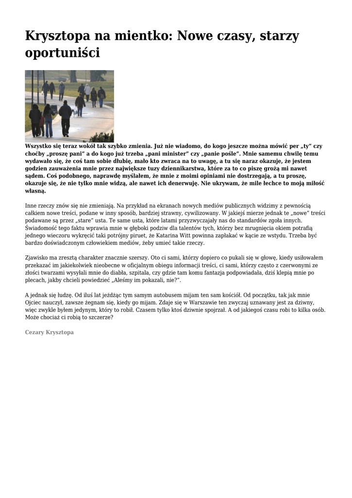 Krysztopa na mientko: Nowe czasy, starzy oportuniści Wszystko się teraz wokół tak szybko zmienia. Już nie wiadomo, do kogo jeszcze można mówić per „ty” czy choćby „proszę pani” a do kogo już trzeba „pani minister” czy „panie pośle”. Mnie samemu chwilę temu wydawało się, że coś tam sobie dłubię, mało kto zwraca na to uwagę, a tu się naraz okazuje, że jestem godzien zauważenia mnie przez największe tuzy dziennikarstwa, które za to co piszę grożą mi nawet sądem. Coś podobnego, naprawdę myślałem, że mnie z moimi opiniami nie dostrzegają, a tu proszę, okazuje się, że nie tylko mnie widzą, ale nawet ich denerwuję. Nie ukrywam, że mile łechce to moją miłość własną. Inne rzeczy znów się nie zmieniają. Na przykład na ekranach nowych mediów publicznych widzimy z pewnością całkiem nowe treści, podane w inny sposób, bardziej strawny, cywilizowany. W jakiejś mierze jednak te „nowe” treści podawane są przez „stare” usta. Te same usta, które latami przyzwyczajały nas do standardów zgoła innych. Świadomość tego faktu wprawia mnie w głęboki podziw dla talentów tych, którzy bez mrugnięcia okiem potrafią jednego wieczoru wykręcić taki potrójny piruet, że Katarina Witt powinna zapłakać w kącie ze wstydu. Trzeba być bardzo doświadczonym człowiekiem mediów, żeby umieć takie rzeczy. Zjawisko ma zresztą charakter znacznie szerszy. Oto ci sami, którzy dopiero co pukali się w głowę, kiedy usiłowałem przekazać im jakiekolwiek nieobecne w oficjalnym obiegu informacji treści, ci sami, którzy często z czerwonymi ze złości twarzami wysyłali mnie do diabła, szpitala, czy gdzie tam komu fantazja podpowiadała, dziś klepią mnie po plecach, jakby chcieli powiedzieć „Aleśmy im pokazali, nie?”. A jednak się łudzę. Od iluś lat jeżdżąc tym samym autobusem mijam ten sam kościół. Od początku, tak jak mnie Ojciec nauczył, zawsze żegnam się, kiedy go mijam. Zdaje się w Warszawie ten zwyczaj uznawany jest za dziwny, więc zwykle byłem jedynym, który to robił. Czasem tylko ktoś dziwnie spojrzał. A od jakiegoś czasu robi to kilka osób. Może chociaż ci robią to szczerze? Cezary Krysztopa