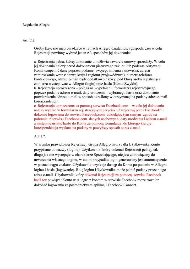 Regulamin Allegro Art. 2.2. Osoby fizyczne nieprowadzące w ramach Allegro działalności gospodarczej w celu Rejestracji powinny wybrać jeden z 3 sposobów jej dokonania: a. Rejestracja pełna, której dokonanie umożliwia zawarcie umowy sprzedaży. W celu jej dokonania należy przed dokonaniem pierwszego zakupu lub podczas Aktywacji Konta uzupełnić dane poprzez podanie: swojego imienia i nazwiska, adresu zamieszkania wraz z nazwą kraju i regionu (województwa), numeru telefonu kontaktowego, adresu e-mail bądź dodatkowo nazwy, pod którą osoba rejestrująca zamierza występować w Allegro (login) oraz hasła (Konta Zwykłe); b. Rejestracja uproszczona – polega na wypełnieniu formularza rejestracyjnego poprzez podanie adresu e-mail, daty urodzenia i wybranego hasła oraz dokonanie potwierdzenia adresu e-mail w sposób określony w otrzymanej na podany adres e-mail korespondencji; c. Rejestracja uproszczona za pomocą serwisu Facebook.com – w celu jej dokonania należy wybrać w formularzu rejestracyjnym przycisk „Zarejestruj przez Facebook” i dokonać logowania do serwisu Facebook.com udzielając tym samym zgody na pobranie z serwisu Facebook.com danych osobowych: daty urodzenia i adresu e-mail a następnie ustalić hasło do Konta za pomocą formularza, do którego kieruje korespondencja wysłana na podany w powyższy sposób adres e-mail. Art. 2.7. W wyniku prawidłowej Rejestracji Grupa Allegro tworzy dla Użytkownika Konto przypisane do nazwy (loginu). Użytkownik, który dokonał Rejestracji pełnej, tak długo jak nie występuje w charakterze Sprzedającego, nie jest zobowiązany do utworzenia własnego loginu, w takim przypadku login generowany jest automatycznie w postaci ciągu znaków. Użytkownik uzyskuje dostęp do Konta po podaniu w Allegro loginu i hasła (logowanie). Rolę loginu Użytkownika może pełnić podany przez niego adres e-mail. Użytkownik, który dokonał Rejestracji za pomocą serwisu Facebook bądź też powiązał Konto w Allegro z kontem w serwisie Facebook może również dokonać logowania za pośrednictwem aplikacji Facebook Connect.