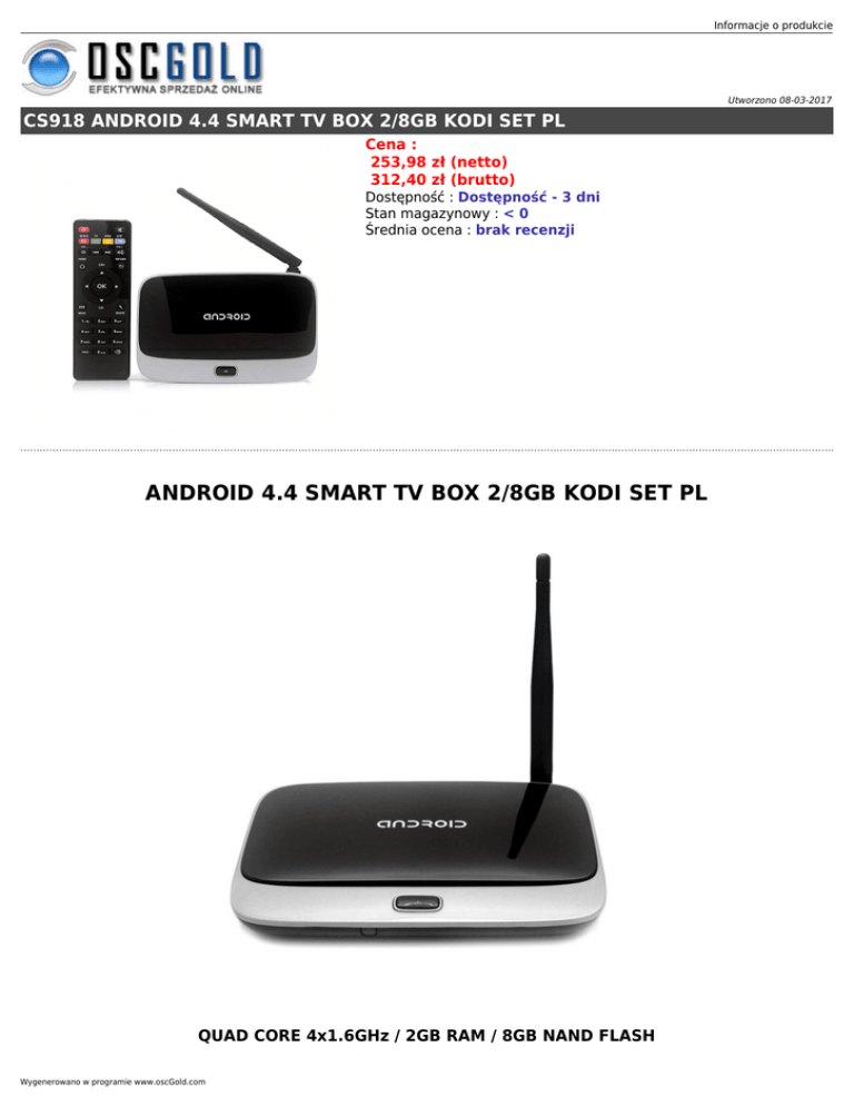 Informacje o produkcie Utworzono 08-03-2017 CS918 ANDROID 4.4 SMART TV BOX 2/8GB KODI SET PL Cena : 253,98 zł (netto) 312,40 zł (brutto) Dostępność : Dostępność - 3 dni Stan magazynowy : < 0 Średnia ocena : brak recenzji ANDROID 4.4 SMART TV BOX 2/8GB KODI SET PL QUAD CORE 4x1.6GHz / 2GB RAM / 8GB NAND FLASH Wygenerowano w programie www.oscGold.com Opis produktu: CS918 jest to lekkie i smukłe urządzenie multimedialne z jedną zwiększającą zasięg anteną WiFi. Jest to jedno z najbardziej popularnych urządzeń typu android box na rynku. Jego zaletą jest czterordzeniowy procesor RockChip RK3188 o taktowaniu 1.6GHz. RK3188 to bardzo szybki i bezawaryjny procesor montowany w wielu tabletach i urządzeniach mobilnych. Towarzyszy mu wydajna czterordzeniowa grafika MALI 400, która pozwala na sprawne funkcjonowanie boxa bez żadnych opóźnień. W CS918 zamontowano również 2GB pamięci RAM DDR3. W zupełności wystarcza nawet przy wymagających grach i aplikacjach. Ponadto, 8GB swobodnie dostępnej pamięci wewnętrznej pozwoli cieszyć się setkami aplikacji. Obecność Bluetootha pozwala na szybką bezprzewodową komunikację z klawiaturą, myszą czy telefonem komórkowym lub innymi urządzeniami, które są wyposażone w tą technologię. Najnowsza wersja systemu Android 4.4 idealnie sprawdzi się na ekranie TV. Posiada jeszcze bardziej intuicyjny interfejs oraz unowocześnioną obsługę widgetów. Zapewnia jeszcze szybsze i płynniejsze działanie. ANDROID TV BOX pozwala na czatowanie ze znajomymi, korzystanie z aplikacji społecznościowych, oglądanie filmów z youtube, przeglądanie stron internetowych, słuchanie muzyki. Dzięki zamontowanemu slotowi na karty microSD można również odtwarzać materiały zapisane na karcie w praktycznie wszystkich dostępnych formatach dla plików video i audio. Dostosujesz pulpit do własnych potrzeb korzystając z aplikacji oraz widgetów, które możesz ściągnąć ze sklepu GOOGLE Play. Znajdziesz też tam GRY, KSIĄŻKI, APLIKACJE Tylko u nas dostajecie Państwo urządzenie, które jest już przygotowane do pracy zaraz po uruchomieniu. Na TV BOX'ie zainstalowana jest najnowsza wersja XBMC - KODI 14. W KODI wgrane są wszystkie najważniejsze, najlepsze wtyczki z muzyką, filmami, serialami, programami telewizyjnymi i telewizją online. Wgrana jest też repozytorium z Polską telewizją, która pozwoli na oglądanie wielu programów online, seriali i filmów online. Wszystkie TV BOXy są przez nas sprawdzane i konfigurowane pod klienta. Informacje o produkcie Do obsługi boxa polecamy nasze AirMousy, które są z nimi kompatybilne. Jest to pilot, klawiatura i myszka w jednym urządzeniu. Znacznie usprawnia poruszanie się po menu urządzenia. Wygenerowano w programie www.oscGold.com Informacje o produkcie W zestawie: ● ● ● ● ● ● ● ● CS918 ANDROID 4.4 SMART TV BOX Zasilacz sieciowy 5V Kabel HDMI Kabel AV Pilot Instrukcja obsługi j. angielski Gwarancja 24 miesiące Paragon lub na życzenie faktura VAT 23% Wygenerowano w programie www.oscGold.com