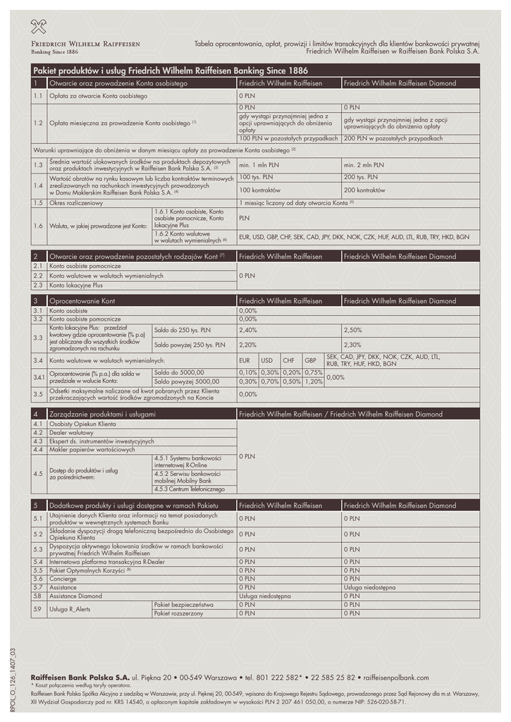 Tabela oprocentowania, opłat, prowizji i limitów transakcyjnych dla klientów bankowości prywatnej Friedrich Wilhelm Raiffeisen w Raiffeisen Bank Polska S.A. Pakiet produktów i usług Friedrich Wilhelm Raiffeisen Banking Since 1886 1 Otwarcie oraz prowadzenie Konta osobistego Friedrich Wilhelm Raiffeisen 1.1 Opłata za otwarcie Konta osobistego 0 PLN 1.2 Opłata miesięczna za prowadzenie Konta osobistego 0 PLN gdy wystąpi przynajmniej jedna z opcji uprawniających do obniżenia opłaty 100 PLN w pozostałych przypadkach (1) Warunki uprawniające do obniżenia w danym miesiącu opłaty za prowadzenie Konta osobistego 1.3 Średnia wartość ulokowanych środków na produktach depozytowych oraz produktach inwestycyjnych w Raiffeisen Bank Polska S.A. (3) 1.4 Wartość obrotów na rynku kasowym lub liczba kontraktów terminowych 100 tys. PLN zrealizowanych na rachunkach inwestycyjnych prowadzonych 100 kontraktów w Domu Maklerskim Raiffeisen Bank Polska S.A. (4) 1.5 Okres rozliczeniowy 1.6 0 PLN gdy wystąpi przynajmniej jedna z opcji uprawniających do obniżenia opłaty 200 PLN w pozostałych przypadkach (2) min. 1 mln PLN min. 2 mln PLN 200 tys. PLN 200 kontraktów 1 miesiąc liczony od daty otwarcia Konta 1.6.1 Konto osobiste, Konto osobiste pomocnicze, Konto lokacyjne Plus 1.6.2 Konto walutowe w walutach wymienialnych (6) EUR, USD, GBP, CHF, SEK, CAD, JPY, DKK, NOK, CZK, HUF, AUD, LTL, RUB, TRY, HKD, BGN Otwarcie oraz prowadzenie pozostałych rodzajów Kont 2.1 Konto osobiste pomocnicze 2.2 Konto walutowe w walutach wymienialnych 2.3 Konto lokacyjne Plus 3 Oprocentowanie Kont Friedrich Wilhelm Raiffeisen 3.1 3.2 Konto osobiste Konto osobiste pomocnicze Konto lokacyjne Plus: przedział kwotowy gdzie oprocentowanie (% p.a) jest obliczane dla wszystkich środków zgromadzonych na rachunku 0,00% 0,00% (7) (5) PLN 2 3.3 Friedrich Wilhelm Raiffeisen Friedrich Wilhelm Raiffeisen Diamond 0 PLN Saldo do 250 tys. PLN 2,40% Saldo powyżej 250 tys. PLN 2,20% 2,50% 2,30% 3.4.1 Oprocentowanie (% p.a.) dla salda w przedziale w walucie Konta: 3.5 Odsetki maksymalne naliczane od kwot pobranych przez Klienta przekraczających wartość środków zgromadzonych na Koncie 0,00% 4 Zarządzanie produktami i usługami Friedrich Wilhelm Raiffeisen / Friedrich Wilhelm Raiffeisen Diamond 4.1 4.2 4.3 4.4 Osobisty Opiekun Klienta Dealer walutowy Ekspert ds. instrumentów inwestycyjnych Makler papierów wartościowych 0,10% 0,30% 0,20% 0,75% 0,30% 0,70% 0,50% 1,20% 4.5.1 Systemu bankowości internetowej R-Online 4.5.2 Serwisu bankowości mobilnej Mobilny Bank 4.5.3 Centrum Telefonicznego 5 Dodatkowe produkty i usługi dostępne w ramach Pakietu 5.9 GBP Saldo powyżej 5000,00 Dostęp do produktów i usług za pośrednictwem: 5.4 5.5 5.6 5.7 5.8 CHF Saldo do 5000,00 4.5 5.3 USD SEK, CAD, JPY, DKK, NOK, CZK, AUD, LTL, RUB, TRY, HUF, HKD, BGN Konto walutowe w walutach wymienialnych: 5.2 EUR Friedrich Wilhelm Raiffeisen Diamond 3.4 5.1 RPOL_O_126_1407_03 Waluta, w jakiej prowadzone jest Konto: Friedrich Wilhelm Raiffeisen Diamond Utajnienie danych Klienta oraz informacji na temat posiadanych produktów w wewnętrznych systemach Banku Składanie dyspozycji drogą telefoniczną bezpośrednio do Osobistego Opiekuna Klienta Dyspozycja aktywnego lokowania środków w ramach bankowości prywatnej Friedrich Wilhelm Raiffeisen Internetowa platforma transakcyjna R-Dealer Pakiet Optymalnych Korzyści (8) Concierge Assistance Assistance Diamond Pakiet bezpieczeństwa Usługa R_Alerts Pakiet rozszerzony 0,00% 0 PLN Friedrich Wilhelm Raiffeisen Friedrich Wilhelm Raiffeisen Diamond 0 PLN 0 PLN 0 PLN 0 PLN 0 PLN 0 PLN 0 PLN 0 PLN 0 PLN 0 PLN Usługa niedostępna 0 PLN 0 PLN 0 PLN 0 PLN 0 PLN Usługa niedostępna 0 PLN 0 PLN 0 PLN Raiffeisen Bank Polska S.A. ul. Piękna 20 • 00-549 Warszawa • tel. 801 222 582* • 22 585 25 82 • raiffeisenpolbank.com * Koszt połączenia według taryfy operatora. Raiffeisen Bank Polska Spółka Akcyjna z siedzibą w Warszawie, przy ul. Pięknej 20, 00-549, wpisana do Krajowego Rejestru Sądowego, prowadzonego przez Sąd Rejonowy dla m.st. Warszawy, XII Wydział Gospodarczy pod nr. KRS 14540, o opłaconym kapitale zakładowym w wysokości PLN 2 207 461 050,00, o numerze NIP: 526-020-58-71. Tabela oprocentowania, opłat, prowizji i limitów transakcyjnych dla klientów bankowości prywatnej Friedrich Wilhelm Raiffeisen w Raiffeisen Bank Polska S.A. 6 Karty do Kont osobistych, pomocniczych i walutowych Friedrich Wilhelm Raiffeisen / Friedrich Wilhelm Raiffeisen Diamond Karty do Kont osobistych, pomocniczych Visa Classic 6.1 Rodzaj Karty 6.2 6.3 6.4 6.5 Opłata za wydanie oraz korzystanie z Karty Wydanie Karty w miejsce Karty zastrzeżonej Wypłata gotówki Kartą we wszystkich bankomatach w kraju Wypłata gotówki Kartą we wszystkich bankomatach za granicą Wypłata gotówki Kartą w oddziałach innych banków w kraju i za granicą 6.6 oraz transakcje zrealizowane w urzędach pocztowych lub innych instytucjach finansowych Dodatkowa prowizja za przewalutowanie transakcji w walucie innej niż PLN 6.7 i USD (10) Dzienny limit wypłat gotówki za pomocą Kart dla jednej Karty w ramach 6.8 środków dostępnych (11) Maksymalny dzienny limit wypłat gotówki dokonywanych za pomocą Kart 6.9 debetowych dla jednej Karty (12) 6.10 Ubezpieczenie „R-Twoja Karta Bez Ryzyka” MasterCard Debit Class&Club 0 PLN 2 EUR 3% wartości transakcji Brak Brak 10 000 PLN 15 000 PLN 15 000 PLN 20 000 PLN 0 PLN Opłaty transakcyjne dla: Kont osobistych, Kont osobistych pomocniczych, Friedrich Wilhelm Raiffeisen Kont walutowych w walutach wymienialnych oraz Kont lokacyjnych Plus 7.1 Jednorazowy przelew wewnętrzny w walucie PLN oraz innej niż PLN (dotyczy również przelewów predefiniowanych oraz przelewów z datą przyszłą) realizowany: 7.2 7.3 7.4 7.5 Jednorazowy przelew krajowy do innego banku (dotyczy również przelewów predefiniowanych oraz przelewów z datą przyszłą) realizowany: Jednorazowy przelew do i