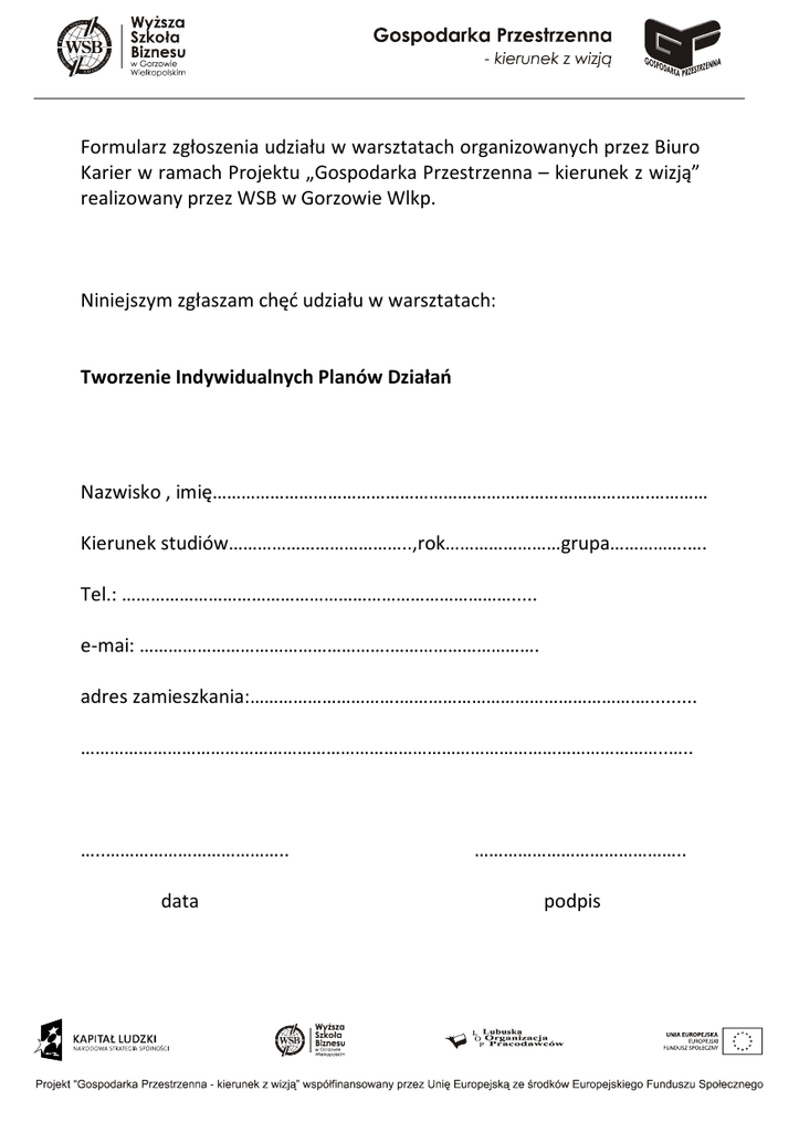 Formularz zgłoszenia udziału w warsztatach organizowanych przez Biuro Karier w ramach Projektu „Gospodarka Przestrzenna – kierunek z wizją” realizowany przez WSB w Gorzowie Wlkp. Niniejszym zgłaszam chęć udziału w warsztatach: Tworzenie Indywidualnych Planów Działań Nazwisko , imię……………………………………………………………………………….………… Kierunek studiów………………………………..,rok……………………grupa…………….…. Tel.: ………………………………………………………………………..... e-mai: …………………………………………….…………………………. adres zamieszkania:………………………….………………………………………….…......... …………………………………………………………………………………………………………..….. …..……………………………….. data …………………………………….. podpis