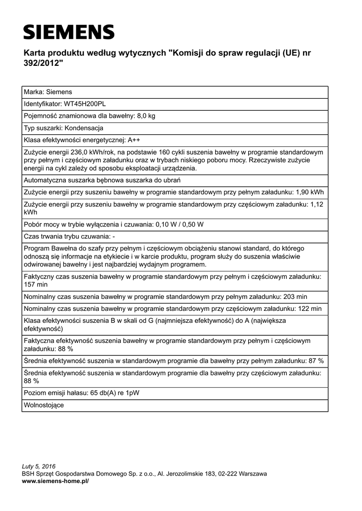 Karta produktu według wytycznych "Komisji do spraw regulacji (UE) nr 392/2012" Marka: Siemens Identyfikator: WT45H200PL Pojemność znamionowa dla bawełny: 8,0 kg Typ suszarki: Kondensacja Klasa efektywności energetycznej: A++ Zużycie energii 236,0 kWh/rok, na podstawie 160 cykli suszenia bawełny w programie standardowym przy pełnym i częściowym załadunku oraz w trybach niskiego poboru mocy. Rzeczywiste zużycie energii na cykl zależy od sposobu eksploatacji urządzenia. Automatyczna suszarka bębnowa suszarka do ubrań Zużycie energii przy suszeniu bawełny w programie standardowym przy pełnym załadunku: 1,90 kWh Zużycie energii przy suszeniu bawełny w programie standardowym przy częściowym załadunku: 1,12 kWh Pobór mocy w trybie wyłączenia i czuwania: 0,10 W / 0,50 W Czas trwania trybu czuwania: Program Bawełna do szafy przy pełnym i częściowym obciążeniu stanowi standard, do którego odnoszą się informacje na etykiecie i w karcie produktu, program służy do suszenia właściwie odwirowanej bawełny i jest najbardziej wydajnym programem. Faktyczny czas suszenia bawełny w programie standardowym przy pełnym i częściowym załadunku: 157 min Nominalny czas suszenia bawełny w programie standardowym przy pełnym załadunku: 203 min Nominalny czas suszenia bawełny w programie standardowym przy częściowym załadunku: 122 min Klasa efektywności suszenia B w skali od G (najmniejsza efektywność) do A (największa efektywność) Faktyczna efektywność suszenia bawełny w programie standardowym przy pełnym i częściowym załadunku: 88 % Średnia efektywność suszenia w standardowym programie dla bawełny przy pełnym załadunku: 87 % Średnia efektywność suszenia w standardowym programie dla bawełny przy częściowym załadunku: 88 % Poziom emisji hałasu: 65 db(A) re 1pW Wolnostojące Luty 5, 2016 BSH Sprzęt Gospodarstwa Domowego Sp. z o.o., Al. Jerozolimskie 183, 02-222 Warszawa www.siemens-home.pl/