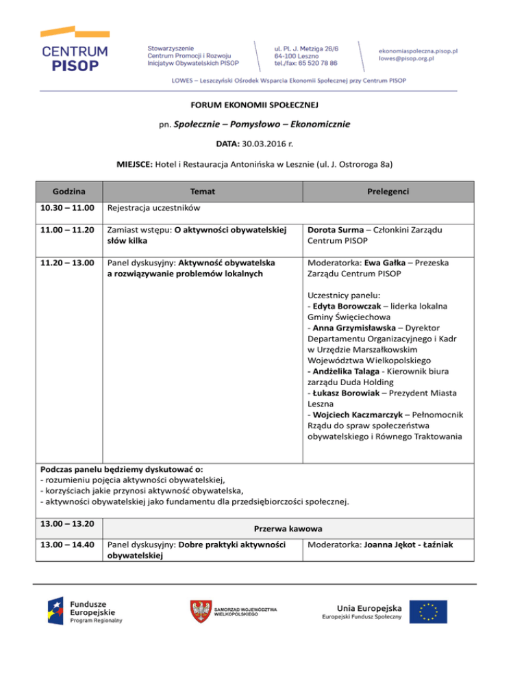 FORUM EKONOMII SPOŁECZNEJ pn. Społecznie – Pomysłowo – Ekonomicznie DATA: 30.03.2016 r. MIEJSCE: Hotel i Restauracja Antonińska w Lesznie (ul. J. Ostroroga 8a) Godzina Temat Prelegenci 10.30 – 11.00 Rejestracja uczestników 11.00 – 11.20 Zamiast wstępu: O aktywności obywatelskiej słów kilka Dorota Surma – Członkini Zarządu Centrum PISOP 11.20 – 13.00 Panel dyskusyjny: Aktywność obywatelska a rozwiązywanie problemów lokalnych Moderatorka: Ewa Gałka – Prezeska Zarządu Centrum PISOP Uczestnicy panelu: - Edyta Borowczak – liderka lokalna Gminy Święciechowa - Anna Grzymisławska – Dyrektor Departamentu Organizacyjnego i Kadr w Urzędzie Marszałkowskim Województwa Wielkopolskiego - Andżelika Talaga - Kierownik biura zarządu Duda Holding - Łukasz Borowiak – Prezydent Miasta Leszna - Wojciech Kaczmarczyk – Pełnomocnik Rządu do spraw społeczeństwa obywatelskiego i Równego Traktowania Podczas panelu będziemy dyskutować o: - rozumieniu pojęcia aktywności obywatelskiej, - korzyściach jakie przynosi aktywność obywatelska, - aktywności obywatelskiej jako fundamentu dla przedsiębiorczości społecznej. 13.00 – 13.20 13.00 – 14.40 Przerwa kawowa Panel dyskusyjny: Dobre praktyki aktywności obywatelskiej Moderatorka: Joanna Jękot - Łaźniak Uczestnicy panelu: - Dorota Błoniewska – Prezeska Spółdzielni Socjalnej Filar - Władysława Czajkowska – Dyrektor Miejsko-Gminnego Ośrodka Pomocy Społecznej w Rawiczu - Marlena Pujsza-Kunikowska – Prezeska Fundacji Centrum Aktywności Twórczej - Renata Turbańska – Prezeska Zarządu Stowarzyszenia Łaciata Wieś - Wiesława Woś – Dyrektor Zespołu Szkolno - Przedszkolnego w Starkowie prowadzonego przez Stowarzyszenie Gospodarczo-Edukacyjne „Przyjaciele Szkoły” - Krystian Dulski – asystent ds. promocji Szlachetnej Paczki w Lesznie Podczas panelu porozmawiamy o: - prowadzeniu szkoły przez organizację pozarządową, - budowania wioski tematycznej, - włączaniu ludzi w wolontariat, - łączeniu działań społecznych z rynkowymi, - różnicowania środków na działania organizacji pozarządowych. 14.40 – 14.50 14.50 Podsumowanie spotkania Ewa Gałka – Prezeska Zarządu Centrum PISOP Poczęstunek