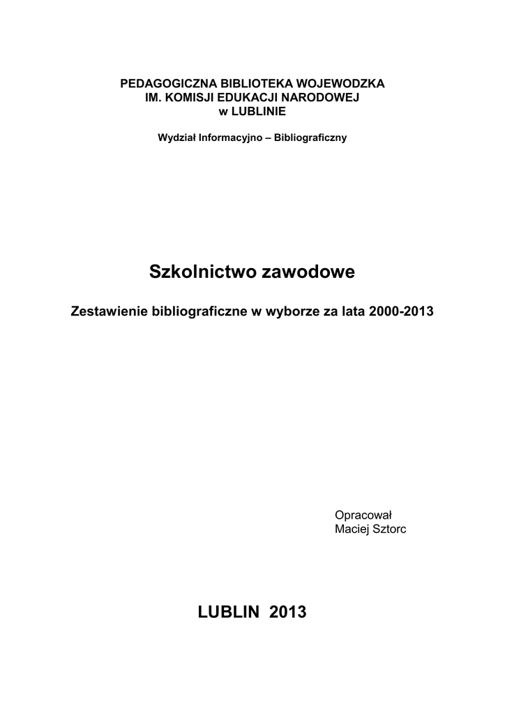 PEDAGOGICZNA BIBLIOTEKA WOJEWODZKA IM. KOMISJI EDUKACJI NARODOWEJ w LUBLINIE Wydział Informacyjno – Bibliograficzny Szkolnictwo zawodowe Zestawienie bibliograficzne w wyborze za lata 2000-2013 Opracował Maciej Sztorc LUBLIN 2013 Wydawnictwa zwarte 1. Absolwenci szkół zawodowych na regionalnym rynku pracy pomiędzy teorią a praktyką : badanie przedsiębiorstw i instytucji : diagnoza potrzeb edukacyjnych szkolnictwa zawodowego a kierunki rozwoju regionalnego rynku pracy : projekt realizowany w ramach Działania 9.2 Programu Operacyjnego Kapitał Ludzki na lata 20072013 : raport / pod red. Ewy Sikory-Wiśniewskiej. – Olsztyn : Pracownia Wydawnicza Elset, 2010. – 206 s. 2. Akademickie biura karier w procesie kształcenia zawodowego studentów : kontekst socjologiczny / Sabina Krawiec // W: Andragogika w ujęciu interdyscyplinarnym / pod red. Wojciecha Horynia i Jana Maciejewskiego. – Wrocław : Wydaw. Uniwersytetu Wrocławskiego, 2007. – S. 145-149 3. Amerykański Community College a reforma szkolnictwa zawodowego w Polsce : pomyłka czy szansa? / Ryszard Kucha // W: Możliwości i zagrożenia reform edukacyjnych : praca zbiorowa / pod red. Mariana Ochmańskiego. – Warszawa. – [Radom : Instytut Technologii Eksploatacji], 1997. – S. 91-99 4. Autorskie programy nauczania w szkołach ponadgimnazjalnych / Jolanta Ładyżyńska. – Warszawa : IBE - Instytut Badań Edukacyjnych, 2005. – 173 s. 5. Bezpieczeństwo społeczne a bezpieczeństwo państwa / Marek Leszczyński. – Kielce : Wydaw. Uniwersytetu HumanistycznoPrzyrodniczego Jana Kochanowskiego, 2009. – S. 111-124 6. Budowa standardów kwalifikacji zawodowych w Polsce : metodologia tworzenia standardów kwalifikacji zawodowych / red. Stefan M. Kwiatkowski, Zofia Sepkowska ; Europejska Fundacja Kształcenia Zawodowego [et al.]. – Warszawa : Instytut Badań Edukacyjnych ; Radom : Instytut Technologii Eksploatacji, 2000. – 115 s. 7. Czy patronat jest rozwiązaniem? : współpraca szkół zawodowych z pracodawcami w regionie łódzkim / red. nauk. Piotr Chomczyński, Tomasz Kamiński. – Łódź : Wyższa Szkoła Pedagogiczna, cop. 2012. – 223 s. 8. Dostosowanie struktury i treści kształcenia zawodowego do potrzeb rynku pracy w kontekście zmian w systemie edukacji / Stefan M. Kwiatkowski. – Warszawa : Instytut Badań Edukacyjnych, 2002. – 62 s. 9. Dyrektor szkoły zawodowej jako menedżer i przywódca w okresie zmian / Mirosław Cholewiński // W: Współczesne problemy poradnictwa i edukacji zawodowej / pod red. nauk. Barbary Baraniak. – Warszawa : Instytut Badań Edukacyjnych. – Radom : Instytut Technologii Eksploatacji - Państwowy Instytut Badawczy , cop. 2007. – S. 155-166 10. Edukacja w przygotowaniu człowieka do pracy zawodowej / Barbara Baraniak. – Warszawa : Instytut Badań Edukacyjnych, 2008. – 207 s. 11. Edukacja wobec rynku pracy : realia, możliwości, perspektywy / pod red. Ryszarda Gerlacha. – Bydgoszcz : Wydaw. Akademii Bydgoskiej im. Kazimierza Wielkiego, 2003. – 425 s. 12. Edukacja zawodowa kluczem do jednoczącej się Europy / Jadwiga Serkowska-Mąka. – Toruń : Wydaw. Adam Marszałek, cop. 2003. – 277 s. 13. Edukacja zawodowa kluczem do jednoczącej się Europy / Jadwiga Serkowska-Mąka. – Toruń : Wydaw. Adam Marszałek, cop. 2003. – 277 s. 14. Edukacja zawodowa w aspekcie przemian społeczno-gospodarczych : wyzwania, szanse, zagrożenia / pod red. Ryszarda Gerlacha. – Bydgoszcz : Wydaw. Uniwersytetu Kazimierza Wielkiego, 2007. – 240 s. 15. Edukacja zawodowa z perspektywy rynku pracy / Kazimierz Denek // W: Pedagogika pracy w kontekście integracji europejskiej / pod red. nauk. Zygmunta Wiatrowskiego, Urszuli Jeruszki i Henryka Bednarczyka. – Warszawa : Wydaw. WSP TWP, 2003. – S. 218-222 16. Efektywność kształcenia zawodowego : kształcenie zawodowe a rynek pracy / Urszula Jeruszka (red.). – Warszawa : Instytut Pracy i Spraw Socjalnych, 2000. – 319 s. 17. Gdzie ci fachowcy? : szkolnictwo zawodowe w Polsce wobec potrzeb rynku pracy / Krzysztof Bondyra, Wojciech Jagodziński // W: Zawirowania systemu edukacji : z perspektywy socjologicznych warsztatów badawczych / red. nauk. Marta Zahorska. – Warszawa : Wydaw. Uniwersytetu Warszawskiego, cop. 2012. – S. 97-112 18. Kompetencje zawodowe młodych : możliwości szkolnictwa zawodowego a potrzeby pracodawców / Marcin Kęsy. – Kraków : Wydaw. Uniwersytetu Jagiellońskiego, cop. 2008. – 108 s. 19. Kontynuacja przemian : raport o stanie edukacji 2011 / [red. merytoryczna Michał Federowicz, Anna Wojciuk. – Warszawa : Instytut Badań Edukacyjnych, 2012. – 249 s. 20. Kształcenie prozawodowe i zawodowe w kontekście integracji Europy / pod red. Ryszarda Gerlacha ; Akademia Bydgoska im. Kazimierza Wielkiego. – Bydgoszcz : Wydaw. AB, 2002. – 335 s. 21. Kształcenie zawodowe - wyzwania, priorytety, standardy / Stefan M. Kwiatkowski. – Wyd. 2 uzup. – Warszawa : Instytut Badań Edukacyjnych, 2008. – 94 s. 22. Kształcenie zawodowe "próg edukacyjny" / Jerzy Niemiec // W: Praca człowieka w XXI wieku : konteksty, wyzwania, zagrożenia / red. Ryszard Gerlach. – Bydgoszcz : Wydaw. Uniwersytetu Kazimierza Wielkiego, 2008. – S. 229-233 23. Kształcenie zawodowe i ustawiczne : założenia projektowanych zmian : informator / [Ministerstwo Edukacji Narodowej]. – Warszawa : Fundacja "Fundusz Współpracy", 2010. – 52 s. 24. Kształcenie zawodowe pielęgniarek instrumentariuszek : ujęcie socjologiczne / Krystyna Baszak // W:Andragogika w ujęciu interdyscyplinarnym / pod red. Wojciecha Horynia i Jana Maciejewskiego. – Wrocław : Wydaw. Uniwersytetu Wrocławskiego, 2007. – S. 165-176 25. Kształcenie zawodowe w reformie oświaty / Ryszard Szubański // W: Kształcenie zawodowe - rynek pracy - pracodawcy / pod red. Stefana M. Kwiatkowskiego. – Warszawa : Instytut Badań Edukacyjnych, 2000. – S. 51-75 26. Kształcenie zawodowe w świetle międzynarodowych raportów oświatowych - prior