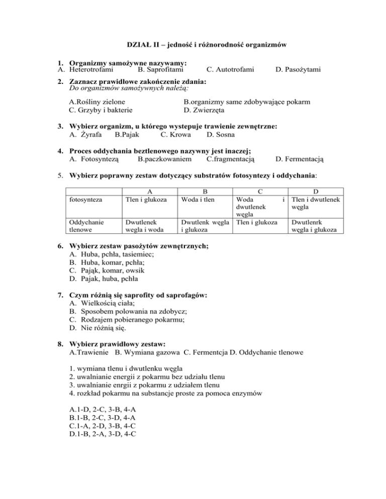 DZIAŁ II – jedność i róŜnorodność organizmów 1. Organizmy samoŜywne nazywamy: A. Heterotrofami B. Saprofitami C. Autotrofami D. PasoŜytami 2. Zaznacz prawidłowe zakończenie zdania: Do organizmów samoŜywnych naleŜą: A.Rośliny zielone C. Grzyby i bakterie B.organizmy same zdobywające pokarm D. Zwierzęta 3. Wybierz organizm, u którego wystepuje trawienie zewnętrzne: A. śyrafa B.Pajak C. Krowa D. Sosna 4. Proces oddychania beztlenowego nazywny jest inaczej; A. Fotosyntezą B.paczkowaniem C.fragmentacją D. Fermentacją 5. Wybierz poprawny zestaw dotyczący substratów fotosyntezy i oddychania: fotosynteza A Tlen i glukoza Oddychanie tlenowe Dwutlenek wegla i woda B Woda i tlen C Woda dwutlenek węgla Dwutlenk węgla Tlen i glukoza i glukoza D i Tlen i dwutlenek węgla Dwutlenrk węgla i glukoza 6. Wybierz zestaw pasoŜytów zewnętrznych; A. Huba, pchła, tasiemiec; B. Huba, komar, pchła; C. Pająk, komar, owsik D. Pajak, huba, pchła 7. Czym róŜnią się saprofity od saprofagów: A. Wielkością ciała; B. Sposobem polowania na zdobycz; C. Rodzajem pobieranego pokarmu; D. Nie róŜnią się. 8. Wybierz prawidłowy zestaw: A.Trawienie B. Wymiana gazowa C. Fermentcja D. Oddychanie tlenowe 1. wymiana tlenu i dwutlenku węgla 2. uwalnianie energii z pokarmu bez udziału tlenu 3. uwalnianie enrgii z pokarmu z udziałem tlenu 4. rozkład pokarmu na substancje proste za pomoca enzymów A.1-D, 2-C, 3-B, 4-A B.1-B, 2-C, 3-D, 4-A C.1-A, 2-D, 3-B, 4-C D.1-B, 2-A, 3-D, 4-C 9. Zaznacz równanie procesu fotosyntezy : A. B. C. D. Glukoza+tlen=dwutlenek węgla+woda+energia Glukoza=kwas mlekowy+energia Dwutlenek wegla+woda+energia=glukoza+tlen Dwutlenk wegla+ woda+energia=glukoza+ tlen 10. Do czynników zewnętrznych wpływających na fotosyntezę zaliczamy: A. wodę, temperaturę, B. chlorofil, energia świetlna, C. poziom enzymów, dostęp dwutlenku węgla, D. temperatura, chlorofil. 11. Fotosynteza przebiega w: A. mitochondriach, B. cytoplazmie, C. chloroplastach, D.poprawne odpowiedzi a i c. 12. W trakcie oddychania beztlenowego w mięśniach człowieka tworzy się: A. kwas masłowy, B. kwas mlekowy, C. glukoza, D. witamina D. 13. Głównym produktem fotosyntezy jest: A. tlen B.cukier prosty C. Białko D.tłuszcz 14. Jaki to typ fermentacji: Glukoza=kwas mlekowy+dwutlenek wegla+energia A.fermentacja octowa; B. fermentacja mlakowa; C. fermentacja alkoholowa; D. oddychanie tlenowe 15. Organizmy, dla których miejscem bytowania i zdobywania pokarmu są inne organizmy Ŝywe, to: A. pasoŜyty B. drapieŜniki C. konsumenci D. pasoŜyty i drapieŜniki 16. Organizmy pasoŜytnicze odznaczają się wysoką rozrodczością, poniewaŜ: A. szansa na przetrwanie i znalezienie Ŝywiciela jest bardzo mała B. mają duŜe zasoby pokarmów C. są obojnakami D. mają niewielkie rozmiary 17. Przykładem pasoŜyta jest: A. owad i kwiat B. huba C. gepard D. jeŜ 18. Przykładem saprobiontów nie są: A. bakterie B. dŜdŜownice C. glony D. grzyby pleśniowe 19. Ciasto droŜdŜowe moŜe wyrosnąć dzięki temu, Ŝe w komórkach droŜdŜy odbywa się: A. Fotosynteza; B. Oddychanie beztlenowe C. Fermentacja D. Odpowiedzi B i C są poprawne 20. Wybierz zestaw organizmów rozmnaŜających się przez zarodniki; A. Mech płonnik, sosna, tulipan B. Mech płonnik, borowik, sosna C. Mech płonnik, borowik, paprotka D. DroŜdŜe, pantofelek, sosna 21. Który zestaw prawidłowo opisuje sposoby bezpłciowego rozmnaŜnia się podanych organizmów: Typ rozmnaŜnia pączkowanie podział komórki zarodniki A droŜdŜe borowik sosna B stułbia pantofelek mech C pantofelek mech tulipan D droŜdŜe sosna stułbia 22. Który zestaw prawidłowo opisuje sposoby bezpłciowego rozmnaŜnia się roślin okrytonasiennych: Typ rozmnaŜania kłącza rozłogi cebule bulwy A perz truskawka tulipan ziemniak B truskawka perz tulipan ziemniak 23.Który zestaw wymienia tylko obojnaki; A. tasiemiec, glista ludzka, pchła B. tasiemiec, stułbia, komar C. tasiemiec, slimak, dŜdzownica D. dŜdŜownica, ślimak, biedronka C truskawka perz ziemniak tulipan D ziemniak truskawka tulipan perz 24. Który zestaw wymienia tylko kręgowce o zapłodnieniu zewnętrznym: A. karp, sowa, krowa, Ŝaba B. karp, sum, ropucha, Ŝaba C, Ŝółw, Ŝaba, rekin, bocian D.szczupak, Ŝaba, kobra, jaszczurka 25. Wybierz zestaw organizmów o rozwoju złoŜonym: A. B. C. D. Ŝaba, człowiek, wróbel, Ŝaba, ślimak, dŜdŜownica, Ŝaba, tasiemiec, motyl sowa, Ŝółw, koza 26. Wybierz zestaw dotyczacy informacji na temat rozmnaŜania płciowego: A.potomstwo losowo otrzymuje wybrane cechy obojga rodziców, osobnik postaje z fragmentów ciała jednego organizmu; B.osobniki potomne są identyczne jak rodzicielski, osobnik powstaje po płączeniu komórek rozrodczych C. potomstwo losowo otrzymuje wybrane cechy obojga rodziców, osobnik powstaje po płączeniu komórek rozrodczych D. osobniki potomne są identyczne jak rodzicielski, osobnik postaje z fragmentów ciała jednego organizmu; 27. Wybierz poprawną definicję Ŝyworodności: A. rozwój jaja w organiźmie samicy; B. rozwój jaja poza organizmem samicy; C. rozwój zarodka w organiźmie samicy-samica go odŜywia; D.rozwój zarodka w wodzie poza organizmem samicy 28. Oddychanie tlenowe dostarcza: A. więcej energii niŜ beztlenowe; B. tyle samo energii co beztlenowe; C .mniej energii co beztlenowe D. nie dostarcza energii 29. Który zestaw prawidłowo opisuje charakterystykę grupy pod względem odŜywiania: Typ rozmnaŜania Związki organiczne pobieram z organizmu roslinnego Związki organiczne pobiera z martwej materii Związki organiczne pobiera Ŝyjąc kosztem innego organizmu Związki organiczne wytwarza z dwutlenku węgla i wody przy udziale energii świetlej A B C D roślinoŜerca roślinoŜerca roślinoŜerca pasoŜyt saprobiont saprobiont drapieŜnik drapieŜnik pasoŜyt drapieŜnik pasoŜyt producent producent pasoŜyt producent saprobiont 30. Który zestaw prawidłowo opisuje miejsce podanego procesu