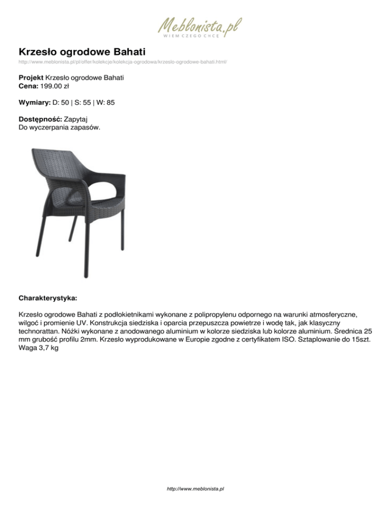 Krzesło ogrodowe Bahati http://www.meblonista.pl/pl/offer/kolekcje/kolekcja-ogrodowa/krzeslo-ogrodowe-bahati.html/ Projekt Krzesło ogrodowe Bahati Cena: 199.00 zł Wymiary: D: 50 | S: 55 | W: 85 Dostępność: Zapytaj Do wyczerpania zapasów. Charakterystyka: Krzesło ogrodowe Bahati z podłokietnikami wykonane z polipropylenu odpornego na warunki atmosferyczne, wilgoć i promienie UV. Konstrukcja siedziska i oparcia przepuszcza powietrze i wodę tak, jak klasyczny technorattan. Nóżki wykonane z anodowanego aluminium w kolorze siedziska lub kolorze aluminium. Średnica 25 mm grubość profilu 2mm. Krzesło wyprodukowane w Europie zgodne z certyfikatem ISO. Sztaplowanie do 15szt. Waga 3,7 kg http://www.meblonista.pl Dostępne wersje produktu: nazwa produktu Krzesło ogrodowe Bahati warianty kolor antracyt cena 199.00zł dostępne Dostępny Krzesło ogrodowe Bahati kolor biały 199.00zł Niedostępny Krzesło ogrodowe Bahati kolor brązowy 199.00zł Dostępny Krzesło ogrodowe Bahati kolor jasno brązowy 199.00zł Niedostępny http://www.meblonista.pl Zdjęcia produktu: http://www.meblonista.pl Powered by TCPDF (www.tcpdf.org)