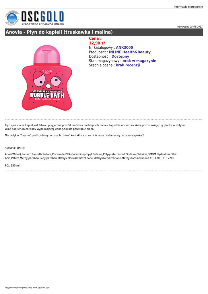 Informacje o produkcie Utworzono 08-03-2017 Anovia - Płyn do kąpieli (truskawka i malina) Cena : 12,90 zł Nr katalogowy : ANK3000 Producent : INLINE Health&Beauty Dostępność : Dostępny Stan magazynowy : brak w magazynie Średnia ocena : brak recenzji Płyn sprawia,że kapiel jest łatwa i przyjemna pośród mnóstwa pachnących baniek.Łagodnie oczyszcza skórę pozostawiając ją gładką w dotyku. Wlać pod strumień wody wypełniającej wannę,dokoła powstanie piana. Nie połykać.Trzymać pod kontrolą dorosłych.Unikać kontaktu z oczami.W razie dostania się do oczu wypłukać! Składniki (INCI): Aqua(Water),Sodium Laureth Sulfate,Cocamide DEA,Cocamidopropyl Betaine,Polyquaternium-7,Sodium Chloride,DMDM Hydantoin,Citric Acid,Pafum,Methylparaben,Popylparaben,Methylchloroisathiazolinone,Methylisothiazolinone,Methylisothiazolinone,CI 14700, CI 17200 POJ. 250 ml Wygenerowano w programie www.oscGold.com
