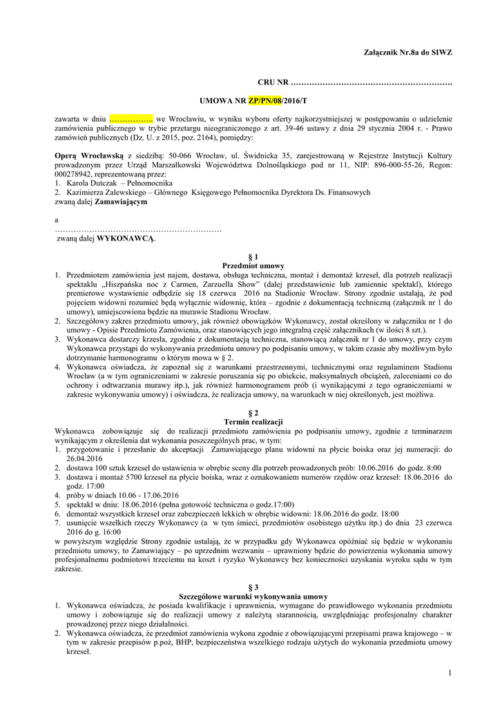 Załącznik Nr.8a do SIWZ CRU NR ……………………………………………………. UMOWA NR ZP/PN/08/2016/T zawarta w dniu …………….. we Wrocławiu, w wyniku wyboru oferty najkorzystniejszej w postępowaniu o udzielenie zamówienia publicznego w trybie przetargu nieograniczonego z art. 39-46 ustawy z dnia 29 stycznia 2004 r. - Prawo zamówień publicznych (Dz. U. z 2015, poz. 2164), pomiędzy: Operą Wrocławską z siedzibą: 50-066 Wrocław, ul. Świdnicka 35, zarejestrowaną w Rejestrze Instytucji Kultury prowadzonym przez Urząd Marszałkowski Województwa Dolnośląskiego pod nr 11, NIP: 896-000-55-26, Regon: 000278942, reprezentowaną przez: 1. Karola Dutczak – Pełnomocnika 2. Kazimierza Zalewskiego – Głównego Księgowego Pełnomocnika Dyrektora Ds. Finansowych zwaną dalej Zamawiającym a ……………………………………………………… zwaną dalej WYKONAWCĄ. 1. 2. 3. 4. §1 Przedmiot umowy Przedmiotem zamówienia jest najem, dostawa, obsługa techniczna, montaż i demontaż krzeseł, dla potrzeb realizacji spektaklu „Hiszpańska noc z Carmen, Zarzuella Show” (dalej przedstawienie lub zamiennie spektakl), którego premierowe wystawienie odbędzie się 18 czerwca 2016 na Stadionie Wrocław. Strony zgodnie ustalają, że pod pojęciem widowni rozumieć będą wyłącznie widownię, która – zgodnie z dokumentacją techniczną (załącznik nr 1 do umowy), umiejscowiona będzie na murawie Stadionu Wrocław. Szczegółowy zakres przedmiotu umowy, jak również obowiązków Wykonawcy, został określony w załączniku nr 1 do umowy - Opisie Przedmiotu Zamówienia, oraz stanowiących jego integralną część załącznikach (w ilości 8 szt.). Wykonawca dostarczy krzesła, zgodnie z dokumentacją techniczna, stanowiącą załącznik nr 1 do umowy, przy czym Wykonawca przystąpi do wykonywania przedmiotu umowy po podpisaniu umowy, w takim czasie aby możliwym było dotrzymanie harmonogramu o którym mowa w § 2. Wykonawca oświadcza, że zapoznał się z warunkami przestrzennymi, technicznymi oraz regulaminem Stadionu Wrocław (a w tym ograniczeniami w zakresie poruszania się po obiekcie, maksymalnych obciążeń, zaleceniami co do ochrony i odtwarzania murawy itp.), jak również harmonogramem prób (i wynikającymi z tego ograniczeniami w zakresie wykonywania umowy) i oświadcza, że realizacja umowy, na warunkach w niej określonych, jest możliwa. §2 Termin realizacji Wykonawca zobowiązuje się do realizacji przedmiotu zamówienia po podpisaniu umowy, zgodnie z terminarzem wynikającym z określenia dat wykonania poszczególnych prac, w tym: 1. przygotowanie i przesłanie do akceptacji Zamawiającego planu widowni na płycie boiska oraz jej numeracji: do 26.04.2016 2. dostawa 100 sztuk krzeseł do ustawienia w obrębie sceny dla potrzeb prowadzonych prób: 10.06.2016 do godz. 8:00 3. dostawa i montaż 5700 krzeseł na płycie boiska, wraz z oznakowaniem numerów rzędów oraz krzeseł: 18.06.2016 do godz. 17:00 4. próby w dniach 10.06 - 17.06.2016 5. spektakl w dniu: 18.06.2016 (pełna gotowość techniczna o godz.17:00) 6. demontaż wszystkich krzeseł oraz zabezpieczeń lekkich w obrębie widowni: 18.06.2016 do godz. 18:00 7. usunięcie wszelkich rzeczy Wykonawcy (a w tym śmieci, przedmiotów osobistego użytku itp.) do dnia 23 czerwca 2016 do g. 16:00 w powyższym względzie Strony zgodnie ustalają, że w przypadku gdy Wykonawca opóźniać się będzie w wykonaniu przedmiotu umowy, to Zamawiający – po uprzednim wezwaniu – uprawniony będzie do powierzenia wykonania umowy profesjonalnemu podmiotowi trzeciemu na koszt i ryzyko Wykonawcy bez konieczności uzyskania wyroku sądu w tym zakresie. §3 Szczegółowe warunki wykonywania umowy 1. Wykonawca oświadcza, że posiada kwalifikacje i uprawnienia, wymagane do prawidłowego wykonania przedmiotu umowy i zobowiązuje się do realizacji umowy z należytą starannością, uwzględniając profesjonalny charakter prowadzonej przez niego działalności. 2. Wykonawca oświadcza, że przedmiot zamówienia wykona zgodnie z obowiązującymi przepisami prawa krajowego – w tym w zakresie przepisów p.poż, BHP, bezpieczeństwa wszelkiego rodzaju użytych do wykonania przedmiotu umowy krzeseł. 1 3. Wykonawca oświadcza, że posiada aktualną polisę ubezpieczenia odpowiedzialności cywilnej w zakresie prowadzonej działalności związanej z realizacją zamówienia, z sumą ubezpieczenia nie niższą niż 1.000.000,00 zł na wszystkie i jedno zdarzenie; zapewniającą wypłatę odszkodowania płatnego w złotych polskich, bez ograniczeń, obejmującą swym zakresem co najmniej: - szkody poniesione przez osoby trzecie w wyniku śmierci, uszkodzenia ciała, rozstroju zdrowia (szkoda osobowa) lub w wyniku utraty, zniszczenia lub uszkodzenia mienia własnego lub osób trzecich, a także szkody spowodowane błędami (szkoda rzeczowa), powstałe w związku z wykonywaniem przedmiotu umowy i innych prac objętych przedmiotem umowy, - ubezpieczenia pracowników Wykonawcy oraz każdego Podwykonawcy, a także wszelkich innych osób realizujących w imieniu Wykonawcy lub Podwykonawcy przedmiot umowy. Kopia polisy OC, wraz z dowodem opłacenia składki, stanowi załącznik do umowy. W powyższym zakresie strony zgodnie ustalają, że Wykonawca zobowiązany będzie do utrzymania ubezpieczenia – co najmniej na warunkach jak w polisie stanowiącej załącznik do umowy - w całym okresie trwania umowy. W przypadku gdyby w trakcie trwania umowy umowa ubezpieczenia zakończyła się Wykonawca zobowiązany jest do zawarcie nowej umowy, co najmniej na warunkach jak w zdaniu poprzedzającym, i przedstawienia Zamawiającemu nowej polisy OC wraz z dowodem opłacenia składki. O ile Wykonawca nie przedstawi nowej polisy OC wraz z dowodem jej opłacenia, to Zamawiający uprawniony będzie do zawarcia takiej umowy i potrącenia składki z wynagrodzenia Wykonawcy. 4. Wykonawca jest obowiązany zapewnić min. 2 