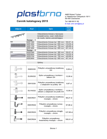 AMR Robert Turban ul. Batalionów Chłopskich 19/11 06-400 Ciechanów Cennik katalogowy 2015 Zdjęcie Kod Tel. 668 69 51 92 E-mail; [email protected] Opis Cena netto Odwodnienia liniowe z tworzywa komplet:rynna, ruszt, nóżki,klucz do rusztu, taśma uszczelniająca Design – 1 SZE1390 SZE1650 SZE1750 SZE1850 Design – 2 SZE2390 SZE2650 SZE2750 SZE2850 Odwodnienie liniowe kpl. 390 mm Odwodnienie liniowe kpl. 655 mm Odwodnienie liniowe kpl. 755 mm Odwodnienie liniowe kpl. 855 mm 334,61 zł 418,55 zł 429,89 zł 451,44 zł Odwodnienie liniowe kpl. 390 mm Odwodnienie liniowe kpl. 655 mm Odwodnienie liniowe kpl. 755 mm Odwodnienie liniowe kpl. 855 mm 334,61 zł 418,55 zł 429,89 zł 451,44 zł Syfony EM05330 Półsyfon umywalkowy butelkowy 5/4 8,56 zł EU0N332 Syfon umywalkowy z korkiem i sitkiem 5/4 12,08 zł EM15330 Półsyfon umywalkowy butelkowy z odejściem na pralkę 5/4 9,97 zł EU1N332 Syfon umywalkowy z korkiem i sitkiem z odejściem do pralki 5/4 13,59 zł EMCR001 Półsyfon umywalkowy butelkowy mosiądz – chrom 68,27 zł EMCR002 Półsyfon umywalkowy rurowy mosiądz – chrom 97,98 zł EMCR003 Półsyfon umywalkowy okrągły mosiądz – chrom 127,99 zł EMCR004 Półsyfon umywalkowy kwadratowy mosiądz – chrom 160,01 zł Strona 1 EUVCR01 Spust umywalkowy KLIK-KLAK mosiężny okrągły mały 43,30 zł EUVCR02 Spust umywalkowy KLIK-KLAK mosiężny okrągły duży 48,33 zł EUVCR03 Spust umywalkowy KLIK-KLAK mosiężny kwadrat 57,40 zł EV11042 Syfon wannowy z korkiem gumowym 26,58 zł EVSC141 Syfon wannowy automat – ABS chrom pokrętło, odpływ tworzywo chrom 63,44 zł EVS0141 Syfon wannowy automat pokrętło mosiądz chrom, odpływ mosiądz chrom 88,61 zł EVNE040 Syfon wannowy automat z napełnianiem eco dł. 550mm 0,00 zł EV00742 Syfon brodzikowy z korkiem gumowym 23,96 zł EWN0541 Syfon brodzikowy 50 niski INOX 45,92 zł EWNN942G Syfon brodzikowy 90 „niski” 52l/min wys.6cm INOX 65,01 zł EK1P000 Syfon do kondensatu fi32 14,63 zł ED10340 Syfon zlewozmywakowy butelkowy pojedynczy z korkiem odejściem na pralkę 22,04 zł ET10340 Syfon zlewozmywakowy butelkowy podwójny z korkiem odejściem na pralkę 44,30 zł ED50444 Syfon zlew.rurowy EKO pojedynczy z korkiem i odejściem na pralkę 34,13 zł ED70440 Syfon zlew.rurowy EKO podwójny 64,34 zł z korkiem i odejściem na pralkę EM36440 Półsyfon zlew.rurowy z odejściem na pralkę Strona 2 ? EM56440 Półsyfon zlew.pojedynczy rurowy EKO z odejściem na pralkę ? ET51441 Półsyfon zlew.rurowy podwójny EKO z odejściem na pralkę 35,74 zł EUV0000 Odpływ umywalkowy z korkiem 5/4 7,99 zł EDV1010 Odpływ zlewozmywakowy z korkiem 6/4 (dn46) 8,20 zł EDVA030 Odpływ zlewozmywakowy 115 6/4 28,35 zł EDVA130 Odpływ zlewozmywakowy 115 z przelewem „prostokąt” 33,39 zł EDVA230 Odpływ zlewozmywakowy 115 z przelewem „prostokątnym” poziomym 33,39 zł EDVA330 Odpływ zlewozmywakowy 115 z przelewem „okrągłym” ? GSP5400 Przyłącze elastyczne 5/4 x 32/40 7,69 zł GSP6500 Przyłącze elastyczne 6/4 x 40/50 8,53 zł GSD4400 Przyłącze elastyczne 40/32 x 32/40 10,57 zł GSD5500 Przyłącze elastyczne 50/40 x 40/50 12,00 zł ESO0550 Syfon pisuarowy poziomy 42,53 zł ESO0551 Syfon pisuarowy pionowy 42,53 zł ESO0341 Syfon pisuarowy natynkowy 31,77 zł EPPN450 Syfon pralkowy podtynkowy 40/50 11,34 zł Strona 3 EPVP000 OSS0000 Syfon natynkowy do pralki 9,26 zł Deska sedesowa twarda Sandra Duroplast wolnoopadająca z 120,03 zł systemem EASY FIX OSA0000 Deska sedesowa twarda Agata Duroplast wolnoopadająca z systemem EASY FIX 170,18 zł ONBP200 Zawór napełniający 3/8 plastik 16,21 zł ONBP250 Zawór napełniający ½ plastik 16,21 zł OVJC002 Zawór spustowy 6l 29,10 zł OVDC002 Zawór spustowy 3/6l 39,00 zł KR00000 Rozeta do WC 4,85 zł MCS0000 Manszeta do WC 6,00 zł MES0000 Manszeta mimośrodowa do WC 6,00 zł KE15000 Króciec mimośrodowy do WC 15,20 zł KP15000 Króciec do WC L-150 10,02 zł KP25000 Króciec do WC L-250 10,52 zł KP40000 Króciec do WC L-400 16,16 zł KK90000 Kolano do WC 90 11,19 zł IL250000 Złącze uniwersalne 250-400 24,84 zł Strona 4 IL270000 Złącze uniwersalne rozciągane do 20,95 zł WC SI5PC00 Wpust ściekowy pionowy DN50 40,26 zł SI50C00 Wpust ściekowy poziomy DN50 40,26 zł SI5TC01 Wpust ściekowy pionowy DN50 „suchy” 63,67 zł SI5PC01 Wpust ściekowy poziomy DN50 „suchy” 63,67 zł SI50D00 Wpust ściekowy poziomy DN50 pod płytkę 57,84 zł CRPAA00 Adapter kanalizacji 110x110 nypel/mufa 12,47 zł CRPA500 Adapter kanalizacji 110x50 nypel/mufa 10,77 zł CRPA700 Adapter kanalizacji 110x75 nypel/mufa 11,17 zł AVP5000 Napowietrzacz kanalizacyjny 50 8,16 zł AVP7000 Napowietrzacz kanalizacyjny 75 8,16 zł AVDA000 Napowietrzacz kanalizacyjny 110 15,65 zł FK10050 Zasuwa burzowa 50 62,95 zł FK100A0 Zasuwa burzowa 110 112,29 zł Strona 5