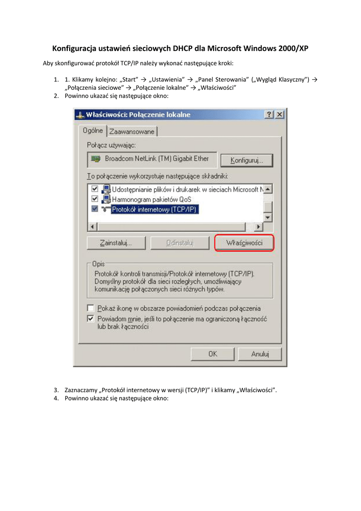 Konfiguracja ustawień sieciowych DHCP dla Microsoft Windows 2000/XP Aby skonfigurować protokół TCP/IP należy wykonać następujące kroki: 1. 1. Klikamy kolejno: „Start” → „Ustawienia” → „Panel Sterowania” („Wygląd Klasyczny”) → „Połączenia sieciowe” → „Połączenie lokalne” → „Właściwości” 2. Powinno ukazać się następujące okno: 3. Zaznaczamy „Protokół internetowy w wersji (TCP/IP)” i klikamy „Właściwości”. 4. Powinno ukazać się następujące okno: 5. Zaznaczamy „Uzyskaj adres IP automatycznie” oraz „Uzyskaj adres serwera DNS automatycznie”. 6. Jeśli wszystko zostało poprawnie skonfigurowane, po kliknięciu „OK” Internet powinien działać.