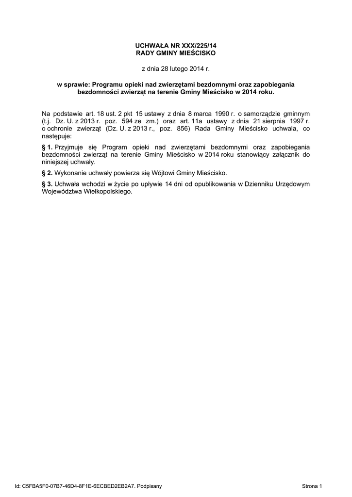 UCHWAŁA NR XXX/225/14 RADY GMINY MIEŚCISKO z dnia 28 lutego 2014 r. w sprawie: Programu opieki nad zwierzętami bezdomnymi oraz zapobiegania bezdomności zwierząt na terenie Gminy Mieścisko w 2014 roku. Na podstawie art. 18 ust. 2 pkt 15 ustawy z dnia 8 marca 1990 r. o samorządzie gminnym (t.j. Dz. U. z 2013 r. poz. 594 ze zm.) oraz art. 11a ustawy z dnia 21 sierpnia 1997 r. o ochronie zwierząt (Dz. U. z 2013 r., poz. 856) Rada Gminy Mieścisko uchwala, co następuje: § 1. Przyjmuje się Program opieki nad zwierzętami bezdomnymi oraz zapobiegania bezdomności zwierząt na terenie Gminy Mieścisko w 2014 roku stanowiący załącznik do niniejszej uchwały. § 2. Wykonanie uchwały powierza się Wójtowi Gminy Mieścisko. § 3. Uchwała wchodzi w życie po upływie 14 dni od opublikowania w Dzienniku Urzędowym Województwa Wielkopolskiego. Id: C5FBA5F0-07B7-46D4-8F1E-6ECBED2EB2A7. Podpisany Strona 1 Załącznik Nr 1 do Uchwały Nr XXX/225/14 Rady Gminy Mieścisko z dnia 28 lutego 2014 r. Program opieki nad zwierzętami bezdomnymi oraz zapobiegania bezdomności zwierząt na terenie Gminy Mieścisko w 2014 roku. § 1. 1. Celami programu są: a) zapewnienie bezdomnym zwierzętom miejsca w schronisku dla zwierząt. b) opiekę nad wolno żyjącymi kotami, w tym ich dokarmianie. c) odławianie bezdomnych zwierząt. d) obligatoryjną sterylizację albo kastrację zwierząt w schroniskach dla zwierząt. e) poszukiwanie właścicieli dla bezdomnych zwierząt. f) usypianie ślepych miotów. g) wskazanie gospodarstwa gospodarskich. rolnego w celu zapewnienia miejsca dla zwierząt h) zapewnienie całodobowej opieki weterynaryjnej w przypadkach zdarzeń drogowych z udziałem zwierząt. § 2. 1. Wykonawcami programu są: a) Gmina Mieścisko b) Schronisko VET – AGRO SERWIS z siedzibą ul. M. Konopnickiej 62, 64-980 Trzcianka w zakresie zawartej z Gminą Mieścisko umowy. § 3. Zapewnienie bezdomnym zwierzętom miejsca w schronisku dla zwierząt realizowane jest poprzez schronisko VET – AGRO SERWIS. § 4. 1. Opiekę nad wolno żyjącymi kotami, w tym ich dokarmianie realizowane jest poprzez: a) ustalenie miejsc, w których przebywają koty wolno żyjące; b) zapewnienie ich dokarmiania; c) w miarę możliwości zapewnienie miejsca schronienia, w szczególności na okres zimowy. § 5. 1. Odławianiem bezdomnych zwierząt z terenu Gminy Mieścisko zajmuje się schronisko VET – AGRO SERWIS. 2. Odławianie bezdomnych zwierząt będzie się odbywać w sposób stały po zgłoszeniu takiej potrzeby. 3. Pracownicy schroniska współpracują w tym zakresie z pracownikami Urzędu Gminy Mieścisko i Policją 4. Obowiązek zapewnienia zwierzętom przebywającym w schronisku właściwej opieki weterynaryjnej ciąży na schronisku VET – AGRO SERWIS. § 6. Obligatoryjną sterylizację albo kastrację zwierząt w schronisku dla zwierząt Gmina Mieścisko realizuje na podstawie zawartej ze schroniskiem umowy. § 7. 1. Poszukiwanie właścicieli dla bezdomnych zwierząt realizowane jest poprzez: Id: C5FBA5F0-07B7-46D4-8F1E-6ECBED2EB2A7. Podpisany Strona 1 a) informowanie o możliwości adopcji zwierząt bezdomnych w sposób zwyczajowo przyjęty na terenie Gminy Mieścisko w tym na stronie Urzędu Gminy Mieścisko : www.miescisko.nowoczesnagmina.pl; b) schronisko § 8. 1. Usypianie ślepych miotów może nastąpić wyłącznie przez lekarza weterynarii. 2. Usypianie ślepych miotów odbywać się będzie w schronisku VET- AGRO SERWIS. § 9. 1. W celu zapewnienia miejsca dla bezdomnych zwierząt gospodarskich wyznacza się Gospodarstwo Rolne Nieświastowice Spółka Jawna Z. Krysztofiak, I. Migas, J. Nadolny z siedzibą Nieświastowice 15, 62-285 Popowo Kościelne, z którego właścicielem Gmina Mieścisko zawarła stosowne porozumienie. 2. Wyszczególnione w ust. 1 Gospodarstwo zapewni opiekę i miejsce dla bezdomnych zwierząt gospodarskich do czasu przekazania zwierząt właścicielowi. 3. W przypadku braku możliwości ustalenia właściciela Gmina Mieścisko podejmuje starania w zakresie znalezienia nowego właściciela dla tych zwierząt. § 10. Zapewnienie całodobowej opieki weterynaryjnej w przypadkach zdarzeń drogowych z udziałem zwierząt realizowany będzie poprzez umowę z VET – AGRO SERWIS z siedzibą ul. M. Konopnickiej 62, 64-980 Trzcianka. § 11. 1. Koszty realizacji zadań określonych w niniejszym programie ponosi Gmina Mieścisko. 2. Wysokość środków przeznaczonych na cele określone w niniejszym w budżecie Gminy Mieścisko na 2014 rok wynosi 41.000,00 zł z czego na: programie a) na realizację celów określonych w §1. ust. 1 litera „a”, „c”, „d” „f”, „h” oraz §9. ust. 1 niniejszego Programu – 40.000,00 zł b) na pozostałe działania, przewidziane w Programie – 1.000,00 zł 3. Wysokość środków oraz ich wydatkowanie może ulec w ciągu roku budżetowego zmianie w zależności od potrzeb. 4. Wszystkie zmiany dotyczące wysokości i sposobu ich wydatkowania regulowane będą uchwałą budżetową obowiązującą w danym roku. Id: C5FBA5F0-07B7-46D4-8F1E-6ECBED2EB2A7. Podpisany Strona 2 Uzasadnienie Podjęcie uchwały ma na celu realizację przepisów Ustawy z dnia 21 sierpnia 1997 r. o ochronie zwierząt. W Programie opieki nad zwierzętami bezdomnymi i zapobieganiu ich bezdomności w 2014 roku zawarte są działania mające na celu sprostać realizacji zapisów Ustawy ciążące na gminie. Program obejmuje także wskazanie środków finansowych w budżecie Gminy Mieścisko na 2014 rok na jego realizację. Działania zostały opisane w niniejszym Programie opieki nad zwierzętami bezdomnymi i zapobieganiu ich bezdomności w 2014 roku. Ponadto działania przewidziane w niniejszym programie są zgodne z ogólnymi zasadami humanitarnej ochrony zwierząt. Niniejszy Program został zaopiniowany przez wymagane w/w ustawie podmioty oraz poddany konsultacjom zgodnie z Uchwałą Nr XXIV/382/13 Rady Gminy Mieścisko z dnia 17 kwietnia 2013 r. (Dz. Urz. Woj. W