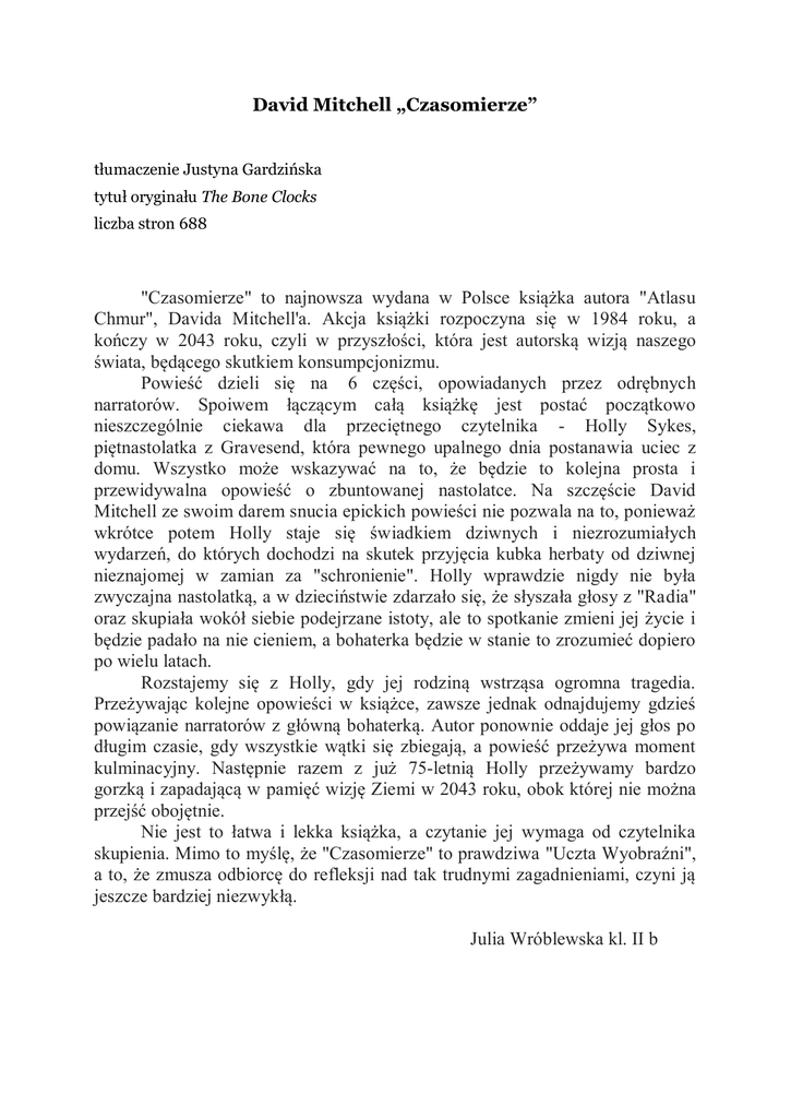 David Mitchell „Czasomierze” tłumaczenie Justyna Gardzińska tytuł oryginału The Bone Clocks liczba stron 688 "Czasomierze" to najnowsza wydana w Polsce książka autora "Atlasu Chmur", Davida Mitchell'a. Akcja książki rozpoczyna się w 1984 roku, a kończy w 2043 roku, czyli w przyszłości, która jest autorską wizją naszego świata, będącego skutkiem konsumpcjonizmu. Powieść dzieli się na 6 części, opowiadanych przez odrębnych narratorów. Spoiwem łączącym całą książkę jest postać początkowo nieszczególnie ciekawa dla przeciętnego czytelnika - Holly Sykes, piętnastolatka z Gravesend, która pewnego upalnego dnia postanawia uciec z domu. Wszystko może wskazywać na to, że będzie to kolejna prosta i przewidywalna opowieść o zbuntowanej nastolatce. Na szczęście David Mitchell ze swoim darem snucia epickich powieści nie pozwala na to, ponieważ wkrótce potem Holly staje się świadkiem dziwnych i niezrozumiałych wydarzeń, do których dochodzi na skutek przyjęcia kubka herbaty od dziwnej nieznajomej w zamian za "schronienie". Holly wprawdzie nigdy nie była zwyczajna nastolatką, a w dzieciństwie zdarzało się, że słyszała głosy z "Radia" oraz skupiała wokół siebie podejrzane istoty, ale to spotkanie zmieni jej życie i będzie padało na nie cieniem, a bohaterka będzie w stanie to zrozumieć dopiero po wielu latach. Rozstajemy się z Holly, gdy jej rodziną wstrząsa ogromna tragedia. Przeżywając kolejne opowieści w książce, zawsze jednak odnajdujemy gdzieś powiązanie narratorów z główną bohaterką. Autor ponownie oddaje jej głos po długim czasie, gdy wszystkie wątki się zbiegają, a powieść przeżywa moment kulminacyjny. Następnie razem z już 75-letnią Holly przeżywamy bardzo gorzką i zapadającą w pamięć wizję Ziemi w 2043 roku, obok której nie można przejść obojętnie. Nie jest to łatwa i lekka książka, a czytanie jej wymaga od czytelnika skupienia. Mimo to myślę, że "Czasomierze" to prawdziwa "Uczta Wyobraźni", a to, że zmusza odbiorcę do refleksji nad tak trudnymi zagadnieniami, czyni ją jeszcze bardziej niezwykłą. Julia Wróblewska kl. II b
