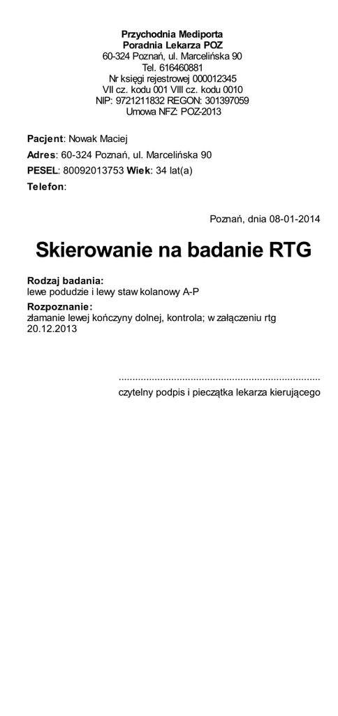 Przychodnia Mediporta Poradnia Lekarza POZ 60-324 Poznań, ul. Marcelińska 90 Tel. 616460881 Nr księgi rejestrowej 000012345 VII cz. kodu 001 VIII cz. kodu 0010 NIP: 9721211832 REGON: 301397059 Umowa NFZ: POZ-2013 Pacjent: Nowak Maciej Adres: 60-324 Poznań, ul. Marcelińska 90 PESEL: 80092013753 Wiek: 34 lat(a) Telefon: Poznań, dnia 08-01-2014 Skierowanie na badanie RTG Rodzaj badania: lewe podudzie i lewy staw kolanowy A-P Rozpoznanie: złamanie lewej kończyny dolnej, kontrola; w załączeniu rtg 20.12.2013 ......................................................................... czytelny podpis i pieczątka lekarza kierującego