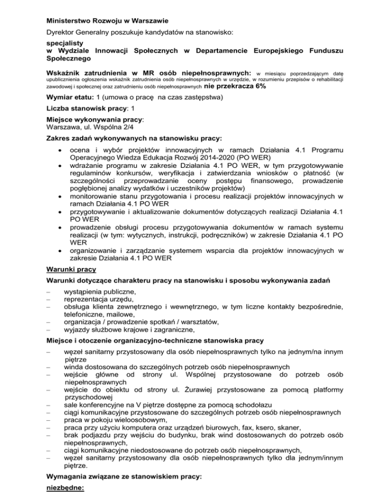 Ministerstwo Rozwoju w Warszawie Dyrektor Generalny poszukuje kandydatów na stanowisko: specjalisty w Wydziale Innowacji Społecznych w Departamencie Europejskiego Funduszu Społecznego Wskaźnik zatrudnienia w MR osób niepełnosprawnych: w miesiącu poprzedzającym datę upublicznienia ogłoszenia wskaźnik zatrudnienia osób niepełnosprawnych w urzędzie, w rozumieniu przepisów o rehabilitacji zawodowej i społecznej oraz zatrudnieniu osób niepełnosprawnych nie przekracza 6% Wymiar etatu: 1 (umowa o pracę na czas zastępstwa) Liczba stanowisk pracy: 1 Miejsce wykonywania pracy: Warszawa, ul. Wspólna 2/4 Zakres zadań wykonywanych na stanowisku pracy: ocena i wybór projektów innowacyjnych w ramach Działania 4.1 Programu Operacyjnego Wiedza Edukacja Rozwój 2014-2020 (PO WER) wdrażanie programu w zakresie Działania 4.1 PO WER, w tym przygotowywanie regulaminów konkursów, weryfikacja i zatwierdzania wniosków o płatność (w szczególności przeprowadzanie oceny postępu finansowego, prowadzenie pogłębionej analizy wydatków i uczestników projektów) monitorowanie stanu przygotowania i procesu realizacji projektów innowacyjnych w ramach Działania 4.1 PO WER przygotowywanie i aktualizowanie dokumentów dotyczących realizacji Działania 4.1 PO WER prowadzenie obsługi procesu przygotowywania dokumentów w ramach systemu realizacji (w tym: wytycznych, instrukcji, podręczników) w zakresie Działania 4.1 PO WER organizowanie i zarządzanie systemem wsparcia dla projektów innowacyjnych w zakresie Działania 4.1 PO WER Warunki pracy Warunki dotyczące charakteru pracy na stanowisku i sposobu wykonywania zadań – – – – – wystąpienia publiczne, reprezentacja urzędu, obsługa klienta zewnętrznego i wewnętrznego, w tym liczne kontakty bezpośrednie, telefoniczne, mailowe, organizacja / prowadzenie spotkań / warsztatów, wyjazdy służbowe krajowe i zagraniczne, Miejsce i otoczenie organizacyjno-techniczne stanowiska pracy – – – – – – – – – – – węzeł sanitarny przystosowany dla osób niepełnosprawnych tylko na jednym/na innym piętrze winda dostosowana do szczególnych potrzeb osób niepełnosprawnych wejście główne od strony ul. Wspólnej przystosowane do potrzeb osób niepełnosprawnych wejście do obiektu od strony ul. Żurawiej przystosowane za pomocą platformy przyschodowej sale konferencyjne na V piętrze dostępne za pomocą schodołazu ciągi komunikacyjne przystosowane do szczególnych potrzeb osób niepełnosprawnych praca w pokoju wieloosobowym, praca przy użyciu komputera oraz urządzeń biurowych, fax, ksero, skaner, brak podjazdu przy wejściu do budynku, brak wind dostosowanych do potrzeb osób niepełnosprawnych, ciągi komunikacyjne niedostosowane do potrzeb osób niepełnosprawnych, węzeł sanitarny przystosowany dla osób niepełnosprawnych tylko dla jednym/innym piętrze. Wymagania związane ze stanowiskiem pracy: niezbędne: wykształcenie: wyższe, doświadczenie zawodowe: minimum 1 rok doświadczenia w rozliczaniu projektów współfinansowanych z EFS pozostałe wymagania niezbędne: – – – – – – – – – – – znajomość zagadnień związanych z funduszami strukturalnymi, szczególnie z Europejskim Funduszem Społecznym znajomość problematyki polityk społecznych finansowanych z EFS (rynek pracy, integracja społeczna, adaptacyjność, edukacja) znajomość zasad rozliczania projektów realizowanych w ramach EFS znajomość problematyki wdrażania projektów innowacyjnych finansowanych z EFS j. angielski na poziomie B2 bardzo dobra znajomość obsługi komputera organizacja pracy i orientacja na osiąganie celów współpraca komunikacja rzetelność myślenie analityczne Wymagane dokumenty i oświadczenia: – CV lub życiorys i list motywacyjny; – kopia dokumentu potwierdzającego posiadanie polskiego obywatelstwa albo oświadczenia o posiadaniu obywatelstwa polskiego; – kopia dokumentów potwierdzających wykształcenie (dokumenty w języku polskim); – oświadczenia kandydata o korzystaniu z pełni praw publicznych, o nieskazaniu prawomocnym wyrokiem za umyślne przestępstwo oraz o nieskazaniu prawomocnym wyrokiem za umyślne przestępstwo skarbowe (podpisane własnoręcznie); – oświadczenia kandydata o wyrażeniu zgody na przetwarzanie danych osobowych do celów rekrutacji (podpisane własnoręcznie); – kopia dokumentu potwierdzającego niepełnosprawność – w przypadku kandydatów, którzy zamierzają skorzystać z pierwszeństwa w zatrudnieniu, gdy znajdą się w gronie pięciu najlepszych kandydatów; – kopie dokumentów potwierdzających wymagane doświadczenie zawodowe – np. kopie świadectw pracy, zaświadczeń o zatrudnieniu, opisów stanowisk, zakresów czynności lub kopie innych zaświadczeń/dokumentów potwierdzających zamknięty okres oraz obszar zatrudnienia. Termin składania dokumentów: 24.10.2016 r. Miejsce składania dokumentów: Ministerstwo Rozwoju Biuro Zarządzania Zasobami Ludzkimi Plac Trzech Krzyży 3/5 00-507 Warszawa (Kancelaria czynna w godz. 8¹⁵-16¹⁵) z dopiskiem w liście motywacyjnym: DZF_91_z Inne informacje: Umowa o pracę na czas zastępstwa. Do udziału w naborze zachęcamy również osoby niepełnosprawne, które spełniają wymagania określone w ogłoszeniu oraz po uwzględnieniu informacji dotyczących oferowanych warunków pracy. Metody/techniki, które będą stosowane podczas naboru: weryfikacja formalna ofert, sprawdzian wiedzy/umiejętności. Kandydaci proszeni są o podanie numeru telefonu i/lub adresu poczty elektronicznej. Oferty otrzymane po terminie nie będą rozpatrywane (liczy się data wpływu). Kandydaci zakwalifikowani zostaną poinformowani o kolejnych etapach naboru. Oferty odrzucone zostaną zniszczone komisyjnie. Dodatkowe informacje, dotyczące ogłoszenia do pracy w Ministerstwie, można znaleźć na stronie: http: //www.mr.gov.pl/ w zakładce Ministerstwo, lub uzyskać pod nr tel.(22) 273 80 32.