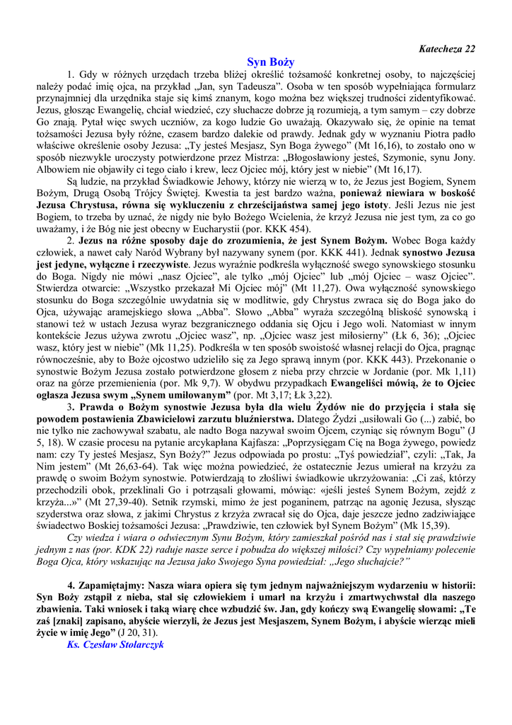 Katecheza 22 Syn Boży 1. Gdy w różnych urzędach trzeba bliżej określić tożsamość konkretnej osoby, to najczęściej należy podać imię ojca, na przykład „Jan, syn Tadeusza”. Osoba w ten sposób wypełniająca formularz przynajmniej dla urzędnika staje się kimś znanym, kogo można bez większej trudności zidentyfikować. Jezus, głosząc Ewangelię, chciał wiedzieć, czy słuchacze dobrze ją rozumieją, a tym samym – czy dobrze Go znają. Pytał więc swych uczniów, za kogo ludzie Go uważają. Okazywało się, że opinie na temat tożsamości Jezusa były różne, czasem bardzo dalekie od prawdy. Jednak gdy w wyznaniu Piotra padło właściwe określenie osoby Jezusa: „Ty jesteś Mesjasz, Syn Boga żywego” (Mt 16,16), to zostało ono w sposób niezwykle uroczysty potwierdzone przez Mistrza: „Błogosławiony jesteś, Szymonie, synu Jony. Albowiem nie objawiły ci tego ciało i krew, lecz Ojciec mój, który jest w niebie” (Mt 16,17). Są ludzie, na przykład Świadkowie Jehowy, którzy nie wierzą w to, że Jezus jest Bogiem, Synem Bożym, Drugą Osobą Trójcy Świętej. Kwestia ta jest bardzo ważna, ponieważ niewiara w boskość Jezusa Chrystusa, równa się wykluczeniu z chrześcijaństwa samej jego istoty. Jeśli Jezus nie jest Bogiem, to trzeba by uznać, że nigdy nie było Bożego Wcielenia, że krzyż Jezusa nie jest tym, za co go uważamy, i że Bóg nie jest obecny w Eucharystii (por. KKK 454). 2. Jezus na różne sposoby daje do zrozumienia, że jest Synem Bożym. Wobec Boga każdy człowiek, a nawet cały Naród Wybrany był nazywany synem (por. KKK 441). Jednak synostwo Jezusa jest jedyne, wyłączne i rzeczywiste. Jezus wyraźnie podkreśla wyłączność swego synowskiego stosunku do Boga. Nigdy nie mówi „nasz Ojciec”, ale tylko „mój Ojciec” lub „mój Ojciec – wasz Ojciec”. Stwierdza otwarcie: „Wszystko przekazał Mi Ojciec mój” (Mt 11,27). Owa wyłączność synowskiego stosunku do Boga szczególnie uwydatnia się w modlitwie, gdy Chrystus zwraca się do Boga jako do Ojca, używając aramejskiego słowa „Abba”. Słowo „Abba” wyraża szczególną bliskość synowską i stanowi też w ustach Jezusa wyraz bezgranicznego oddania się Ojcu i Jego woli. Natomiast w innym kontekście Jezus używa zwrotu „Ojciec wasz”, np. „Ojciec wasz jest miłosierny” (Łk 6, 36); „Ojciec wasz, który jest w niebie” (Mk 11,25). Podkreśla w ten sposób swoistość własnej relacji do Ojca, pragnąc równocześnie, aby to Boże ojcostwo udzieliło się za Jego sprawą innym (por. KKK 443). Przekonanie o synostwie Bożym Jezusa zostało potwierdzone głosem z nieba przy chrzcie w Jordanie (por. Mk 1,11) oraz na górze przemienienia (por. Mk 9,7). W obydwu przypadkach Ewangeliści mówią, że to Ojciec ogłasza Jezusa swym „Synem umiłowanym” (por. Mt 3,17; Łk 3,22). 3. Prawda o Bożym synostwie Jezusa była dla wielu Żydów nie do przyjęcia i stała się powodem postawienia Zbawicielowi zarzutu bluźnierstwa. Dlatego Żydzi „usiłowali Go (...) zabić, bo nie tylko nie zachowywał szabatu, ale nadto Boga nazywał swoim Ojcem, czyniąc się równym Bogu” (J 5, 18). W czasie procesu na pytanie arcykapłana Kajfasza: „Poprzysięgam Cię na Boga żywego, powiedz nam: czy Ty jesteś Mesjasz, Syn Boży?” Jezus odpowiada po prostu: „Tyś powiedział”, czyli: „Tak, Ja Nim jestem” (Mt 26,63-64). Tak więc można powiedzieć, że ostatecznie Jezus umierał na krzyżu za prawdę o swoim Bożym synostwie. Potwierdzają to złośliwi świadkowie ukrzyżowania: „Ci zaś, którzy przechodzili obok, przeklinali Go i potrząsali głowami, mówiąc: «jeśli jesteś Synem Bożym, zejdź z krzyża...»” (Mt 27,39-40). Setnik rzymski, mimo że jest poganinem, patrząc na agonię Jezusa, słysząc szyderstwa oraz słowa, z jakimi Chrystus z krzyża zwracał się do Ojca, daje jeszcze jedno zadziwiające świadectwo Boskiej tożsamości Jezusa: „Prawdziwie, ten człowiek był Synem Bożym” (Mk 15,39). Czy wiedza i wiara o odwiecznym Synu Bożym, który zamieszkał pośród nas i stał się prawdziwie jednym z nas (por. KDK 22) raduje nasze serce i pobudza do większej miłości? Czy wypełniamy polecenie Boga Ojca, który wskazując na Jezusa jako Swojego Syna powiedział: „Jego słuchajcie?” 4. Zapamiętajmy: Nasza wiara opiera się tym jednym najważniejszym wydarzeniu w historii: Syn Boży zstąpił z nieba, stał się człowiekiem i umarł na krzyżu i zmartwychwstał dla naszego zbawienia. Taki wniosek i taką wiarę chce wzbudzić św. Jan, gdy kończy swą Ewangelię słowami: „Te zaś [znaki] zapisano, abyście wierzyli, że Jezus jest Mesjaszem, Synem Bożym, i abyście wierząc mieli życie w imię Jego” (J 20, 31). Ks. Czesław Stolarczyk