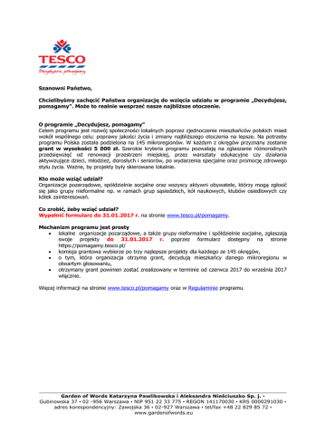 Szanowni Państwo, Chcielibyśmy zachęcić Państwa organizację do wzięcia udziału w programie „Decydujesz, pomagamy”. Może to realnie wesprzeć nasze najbliższe otoczenie. O programie „Decydujesz, pomagamy” Celem programu jest rozwój społeczności lokalnych poprzez zjednoczenie mieszkańców polskich miast wokół wspólnego celu: poprawy jakości życia i zmiany najbliższego otoczenia na lepsze. Na potrzeby programu Polska została podzielona na 145 mikroregionów. W każdym z okręgów przyznany zostanie grant w wysokości 5 000 zł. Szerokie kryteria programu pozwalają na zgłaszanie różnorodnych przedsięwzięć od renowacji przestrzeni miejskiej, przez warsztaty edukacyjne czy działania aktywizujące dzieci, młodzież, dorosłych i seniorów, po wydarzenia specjalne oraz promocję zdrowego stylu życia. Ważne, by projekty były skierowane lokalnie. Kto może wziąć udział? Organizacje pozarządowe, spółdzielnie socjalne oraz wszyscy aktywni obywatele, którzy mogą zgłosić się jako grupy nieformalne np. w ramach grup sąsiedzkich, kół naukowych, klubów osiedlowych czy kółek zainteresowań. Co zrobić, żeby wziąć udział? Wypełnić formularz do 31.01.2017 r. na stronie www.tesco.pl/pomagamy. Mechanizm programu jest prosty lokalne organizacje pozarządowe, a także grupy nieformalne i spółdzielnie socjalne, zgłaszają swoje projekty do 31.01.2017 r. poprzez formularz dostępny na stronie https://pomagamy.tesco.pl/ komisja grantowa wybierze po trzy najlepsze projekty dla każdego ze 145 okręgów, o tym, która organizacja otrzyma grant, decydują mieszkańcy danego mikroregionu w otwartym głosowaniu, otrzymany grant powinien zostać zrealizowany w terminie od czerwca 2017 do września 2017 włącznie. Więcej informacji na stronie www.tesco.pl/pomagamy oraz w Regulaminie programu. ____________________________________________________________________________________________ Garden of Words Katarzyna Pawlikowska i Aleksandra Nieściuszko Sp. j. ▪ Gubinowska 37 ▪ 02 -956 Warszawa ▪ NIP 951 22 33 775 ▪ REGON 141170030 ▪ KRS 0000291030 ▪ adres korespondencyjny: Zawojska 36 ▪ 02-927 Warszawa ▪ tel/fax +48 22 829 85 72 ▪ www.gardenofwords.eu