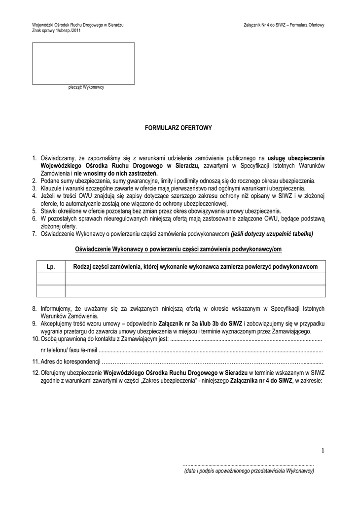 Wojewódzki Ośrodek Ruchu Drogowego w Sieradzu Znak sprawy 1/ubezp./2011 Załącznik Nr 4 do SIWZ – Formularz Ofertowy pieczęć Wykonawcy FORMULARZ OFERTOWY 1. Oświadczamy, że zapoznaliśmy się z warunkami udzielenia zamówienia publicznego na usługę ubezpieczenia Wojewódzkiego Ośrodka Ruchu Drogowego w Sieradzu, zawartymi w Specyfikacji Istotnych Warunków Zamówienia i nie wnosimy do nich zastrzeżeń. 2. Podane sumy ubezpieczenia, sumy gwarancyjne, limity i podlimity odnoszą się do rocznego okresu ubezpieczenia. 3. Klauzule i warunki szczególne zawarte w ofercie mają pierwszeństwo nad ogólnymi warunkami ubezpieczenia. 4. Jeżeli w treści OWU znajdują się zapisy dotyczące szerszego zakresu ochrony niż opisany w SIWZ i w złożonej ofercie, to automatycznie zostają one włączone do ochrony ubezpieczeniowej. 5. Stawki określone w ofercie pozostaną bez zmian przez okres obowiązywania umowy ubezpieczenia. 6. W pozostałych sprawach nieuregulowanych niniejszą ofertą mają zastosowanie załączone OWU, będące podstawą złożonej oferty. 7. Oświadczenie Wykonawcy o powierzeniu części zamówienia podwykonawcom (jeśli dotyczy uzupełnić tabelkę) Oświadczenie Wykonawcy o powierzeniu części zamówienia podwykonawcy/om Lp. Rodzaj części zamówienia, której wykonanie wykonawca zamierza powierzyć podwykonawcom 8. Informujemy, że uważamy się za związanych niniejszą ofertą w okresie wskazanym w Specyfikacji Istotnych Warunków Zamówienia. 9. Akceptujemy treść wzoru umowy – odpowiednio Załącznik nr 3a i/lub 3b do SIWZ i zobowiązujemy się w przypadku wygrania przetargu do zawarcia umowy ubezpieczenia w miejscu i terminie wyznaczonym przez Zamawiającego. 10. Osobą uprawnioną do kontaktu z Zamawiającym jest: ..................................................................................................... nr telefonu/ faxu /e-mail ..................................................................................................................................................... 11. Adres do korespondencji ………………………………………………………………………………………………….............. 12. Oferujemy ubezpieczenie Wojewódzkiego Ośrodka Ruchu Drogowego w Sieradzu w terminie wskazanym w SIWZ zgodnie z warunkami zawartymi w części „Zakres ubezpieczenia” - niniejszego Załącznika nr 4 do SIWZ, w zakresie: 1 ……......................................................................................... (data i podpis upoważnionego przedstawiciela Wykonawcy) Wojewódzki Ośrodek Ruchu Drogowego w Sieradzu Znak sprawy 1/ubezp./2011 Załącznik Nr 4 do SIWZ – Formularz Ofertowy PAKIET 1 TAK / NIE**) skreślić niewłaściwe w przypadku nieskładania oferty w pakiecie pierwszym prosimy o niewypełnianie pozycji dotyczących pakietu pierwszego. Ubezpieczenia mienia od wszystkich ryzyk, Ubezpieczenia sprzętu elektronicznego od wszystkich ryzyk, Ubezpieczenia odpowiedzialności cywilnej UWAGA !!! Prosimy o wypełnienie wszystkich wykropkowanych pól CENA ZAMÓWIENIA/SKŁADKA - ubezpieczenie mienia od wszystkich ryzyk składka za dwuletni okres ubezpieczenia ............................................. , (słownie: .......................................................................................................................... ..................................zł) Przedmiot ubezpieczenia Lp Budynki (własne i powierzone) 1. 2. 3. 4. 5. 6. Maszyny, urządzenia i wyposażenie, w tym niskocenne przedmioty w użytkowaniu, niskowartościowe środki trwałe, środki poza ewidencją i środki dzierżawione amortyzowane przez Ubezpieczonego (własne i powierzone) Sprzęt elektroniczny o okresie eksploatacji powyżej 5 lat Wartości pieniężne w i poza schowkami ogniotrwałymi Mienie pracownicze Limit odpowiedzialności na osobę 1.000,00 Środki trwałe w budowie Suma Stawka za roczny okres ubezpieczenia w ubezpieczenia (zł) (%) 863.878,96 Składka za dwuletni okres ubezpieczenia (zł) .......................................... ......................................... 246.560,07 .......................................... ......................................... 202.381,24 35.000,00 40.000,00 .......................................... ......................................... .......................................... ......................................... 3.700.000,00 Łączna składka ........................................ UWAGA ! Z uwagi na prowadzoną modernizację budynków i środków trwałych sumy ubezpieczenia mają tylko znaczenie porównawcze dla oceny złożonych ofert i nie są zobowiązujące dla Wykonawcy w momencie rzeczywistego zawierania ubezpieczenia. Rzeczywiste sumy ubezpieczenia zostaną podane w wniosku o ubezpieczenie. Zmiany sum ubezpieczenia nie będą odbiegać od założonych kwot o 3%. Składki za ubezpieczenie niżej określonego mienia/ryzyk/klauzul, które nie zostały uwzględnione w składkach powyżej Poniższą tabelę prosimy wypełnić tylko wówczas, jeśli nie wszystkie składki zostały uwzględnione w składkach powyżej 2 ……......................................................................................... (data i podpis upoważnionego przedstawiciela Wykonawcy) Wojewódzki Ośrodek Ruchu Drogowego w Sieradzu Znak sprawy 1/ubezp./2011 Lp Załącznik Nr 4 do SIWZ – Formularz Ofertowy Składka za dwuletni okres ubezpieczenia (zł) Rodzaj ubezpieczonego mienia/ryzyko/klauzula 1. 2. 3. - ubezpieczenie sprzętu elektronicznego od wszystkich ryzyk składka za dwuletni okres ubezpieczenia ............................................. , (słownie:.............................................................................................................................................................zł.) Lp Przedmiot ubezpieczenia Suma ubezpieczenia Stawka za roczny okres w zł ubezpieczenia (%) Sprzęt stacjonarny 88.303,44 (własny i po