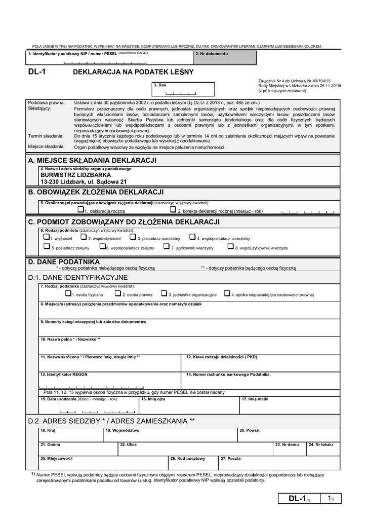 POLA JASNE WYPE NIA PODATNIK. WYPE NIA NA MASZYNIE, KOMPUTEROWO LUB R CZNIE, DU YMI, DRUKOWANYMI LITERAMI, CZARNYM LUB NIEBIESKIM KOLOREM. 1. Identyfikator podatkowy NIP / numer PESEL DL-1 (niepotrzebne skre li ) 2. Nr dokumentu DEKLARACJA NA PODATEK LE NY Za cznik Nr 4 do Uchwa y Nr XII/104/15 Rady Miejskiej w Lidzbarku z dnia 26.11.2015r. (z pó niejszymi zmianami) 3. Rok Podstawa prawna: Sk adaj cy: Ustawa z dnia 30 pa dziernika 2002 r. o podatku le nym (t.j.Dz.U. z 2013 r., poz. 465 ze zm.) Formularz przeznaczony dla osób prawnych, jednostek organizacyjnych oraz spó ek nieposiadaj cych osobowo ci prawnej cych w cicielami lasów, posiadaczami samoistnymi lasów, u ytkownikami wieczystymi lasów, posiadaczami lasów stanowi cych w asno Skarbu Pa stwa lub jednostki samorz du terytorialnego oraz dla osób fizycznych b cych wspó cicielami lub wspó posiadaczami z osobami prawnymi lub z jednostkami organizacyjnymi, w tym spó kami, nieposiadaj cymi osobowo ci prawnej. Do dnia 15 stycznia ka dego roku podatkowego lub w terminie 14 dni od zaistnienia okoliczno ci maj cych wp yw na powstanie (wyga ni cie) obowi zku podatkowego lub wysoko opodatkowania. Organ podatkowy w ciwy ze wzgl du na miejsce po enia nieruchomo ci. Termin sk adania: Miejsce sk adania: A. MIEJSCE SK ADANIA DEKLARACJI 4. Nazwa i adres siedziby organu podatkowego BURMISTRZ LIDZBARKA 13-230 Lidzbark, ul. S dowa 21 B. OBOWI ZEK Z ENIA DEKLARACJI 5. Okoliczno ci powoduj ce obowi zek z enia deklaracji (zaznaczy w 1. deklaracja roczna 2. korekta deklaracji rocznej (miesi c - rok) C. PODMIOT ZOBOWI ZANY DO Z 6. Rodzaj podmiotu (zaznaczy w 1. w ciciel ENIA DEKLARACJI ciwy kwadrat): 2. wspó 5. posiadacz zale ny ciwy kwadrat): ciciel 3. posiadacz samoistny 6. wspó posiadacz zale ny 4. wspó posiadacz samoistny 7. u ytkownik wieczysty 8. wspó ytkownik wieczysty D. DANE PODATNIKA * - dotyczy podatnika nieb cego osob fizyczn ** - dotyczy podatnika b cego osob fizyczn D.1. DANE IDENTYFIKACYJNE 7. Rodzaj podatnika (zaznaczy w ciwy kwadrat): 1. osoba fizyczna 8. Miejsce/a (adres/y) po 2. osoba prawna 3. jednostka organizacyjna 4. spó ka nieposiadaj ca osobowo ci prawnej enia przedmiotów opodatkowania oraz numery/y dzia ek 9. Numer/y ksiegi wieczystej lub zbior/ów dokumentów 10. Nazwa pe na * / Nazwisko ** 11. Nazwa skrócona * / Pierwsze imi , drugie imi ** 12. Klasa rodzaju dzia alno ci ( PKD) 13. Identyfikator REGON 14. Numer rachunku bankowego Podatnika Pola 11, 12, 13 wype nia osoba fizyczna w przypadku, gdy numer PESEL nie zosta nadany. 16. Imi ojca 15. Data urodzenia (dzie - miesi c - rok) 17. Imi matki D.2. ADRES SIEDZIBY * / ADRES ZAMIESZKANIA ** 18. Kraj 21. Gmina 25. Miejscowo 19. Województwo 20. Powiat 22. Ulica 23. Nr domu 26. Kod pocztowy 24. Nr lokalu 27. Poczta 1) Numer PESEL wpisuj podatnicy b cy osobami fizycznymi obj tymi rejestrem PESEL, nieprowadz cy dzia alno ci gospodarczej lub nieb zarejestrowanymi podatnikami podatku od towarów i us ug. Identyfikator podatkowy NIP wpisuj pozostali podatnicy. DL-1 (3) cy 1/2 POLA JASNE WYPE NIA PODATNIK. WYPE NIA NA MASZYNIE, KOMPUTEROWO LUB R CZNIE, DU YMI, DRUKOWANYMI LITERAMI, CZARNYM LUB NIEBIESKIM KOLOREM. D.3. ADRES DO KORESPONDENCJI Nale y wype ni tylko wówczas, gdy adres do korespondencji jest inny ni w cz 28. Kraj ci D.2. 29. Województwo 31. Gmina 30. Powiat 32. Ulica 33. Nr domu 35. Miejscowo 36. Kod pocztowy 34. Nr lokalu 37. Poczta D.4. KONTAKT 38. Telefon 39. Faks 40. E-mail E. DANE DOTYCZ CE LASÓW NIEPODLEGAJ CYCH ZWOLNIENIU Powierzchnia w ha z dok adno ci do 1m2 2) Rodzaj gruntów le nych F. 1. Lasy wchodz ce w sk ad rezerwatów przyrody 41. 2. Lasy wchodz ce w sk ad parków narodowych 44. 3. Lasy pozosta e niewymienione w pkt. 1 i 2 47. Stawka podatku Kwota podatku gr 43. 42. , , 45. gr , 46. , , 48. , 49. , , , CZNA KWOTA PODATKU Kwota podatku (w pe nych z otych) 50. G. INFORMACJA O PRZEDMIOTACH ZWOLNIONYCH 51. Powierzchnia zwolnionego lasu/podstawa prawna H. PODPIS PODATNIKA / OSOBY REPREZENTUJ CEJ PODATNIKA 52. Imi 53. Nazwisko 54. Data wype nienia deklaracji (dzie - miesi c - rok) 55. Podpis (piecz ) podatnika / osoby reprezentuj cej podatnika 3) I. ADNOTACJE ORGANU PODATKOWEGO 56. Uwagi organu podatkowego 57. Data (dzie - miesi c - rok) 58. Podpis przyjmuj cego formularz 2) Nale y poda z dok adno ci do czterech miejsc po przecinku. 3) Niepotrzebne skre li . Pouczenia Za podanie nieprawdy lub zatajenie prawdy i przez to nara enie podatku na uszczuplenie grozi odpowiedzialno skarbowym. przewidziana w Kodeksie karnym W przypadku niezap acenia w obowi zuj cym terminie kwoty podatku z poz. 49 lub wp acenia jej w niepe nej wysoko ci, niniejsza deklaracja stanowi podstaw do wystawienia tytu u wykonawczego, zgodnie z przepisami ustawy z dnia 17 czerwca 1966 r. o post powaniu egzekucyjnym w administracji (Dz.U. z 2012 r. poz. 1619, z pó n. zm.). DL-1 (3) 2/2