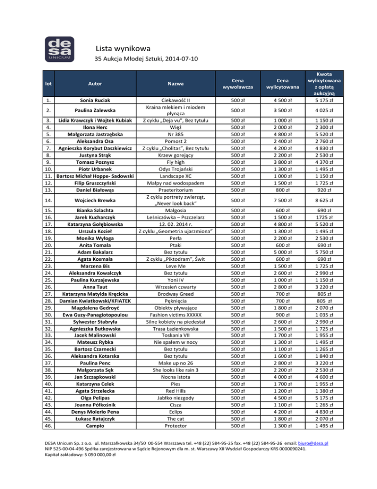 Lista wynikowa 35 Aukcja Młodej Sztuki, 2014-07-10 lot Autor 1. Sonia Ruciak 2. 3. 4. 5. 6. 7. 8. 9. 10. 11. 12. 13. 14. 15. 16. 17. 18. 19. 20. 21. 22. 23. 24. 25. 26. 27. 28. 29. 30. 31. 32. 33. 34. 35. 36. 37. 38. 39. 40. 41. 42. 43. 44. 45. 46. Nazwa Ciekawość II Kraina mlekiem i miodem Paulina Zalewska płynąca Lidia Krawczyk i Wojtek Kubiak Z cyklu „Deja vu”, Bez tytułu Ilona Herc Więź Małgorzata Jastrzębska Nr 385 Aleksandra Osa Pomost 2 Agnieszka Korybut Daszkiewicz Z cyklu „Cholitas”, Bez tytułu Justyna Strąk Krzew gorejący Tomasz Poznysz Fly high Piotr Urbanek Odys Trojański Bartosz Michał Hoppe- Sadowski Landscape XC Filip Gruszczyński Małpy nad wodospadem Daniel Białowąs Praeteritorium Z cyklu portrety zwierząt, Wojciech Brewka „Never look back” Bianka Szlachta Małgosia Jarek Kucharczyk Leśniczówka – Pszczelarz Katarzyna Gołębiowska 12. 02. 2014 r. Urszula Kozieł Z cyklu „Geometria ujarzmiona” Monika Wyłoga Perła Anita Tomala Ptaki Adam Bakalarz Bez tytułu Agata Kosmala Z cyklu „Piktodram”, Świt Marzena Bis Leve Me Aleksandra Kowalczyk Bez tytułu Paulina Kurzajewska Yoni IV Anna Taut Wrzesień czwarty Katarzyna Matylda Kręcicka Brodway Greed Damian Kwiatkowski/KFIATEK Pęknięcia Magdalena Gedroyć Obiekty pływające Ewa Guzy-Panagiotopoulou Fashion victims XXXXX Sylwester Stabryła Silne kobiety na piedestał Agnieszka Butkowska Trasa Łazienkowska Jacek Malinowski Toskania VII Mateusz Rybka Nie spałem w nocy Bartosz Czarnecki Bez tytułu Aleksandra Kotarska Bez tytułu Paulina Penc Make up no 26 Małgorzata Sęk She looks like rain 3 Jan Szczapkowski Nocna istota Katarzyna Celek Pies Agata Strzelecka Red Hills Olga Pelipas Jabłko niezgody Joanna Półkośnik Cisza Denys Molerio Pena Eclips Łukasz Ratajczyk The cat Campio Protector Cena wywoławcza Cena wylicytowana 500 zł 4 500 zł Kwota wylicytowana z opłatą aukcyjną 5 175 zł 500 zł 3 500 zł 4 025 zł 500 zł 500 zł 500 zł 500 zł 500 zł 500 zł 500 zł 500 zł 500 zł 500 zł 500 zł 1 000 zł 2 000 zł 4 800 zł 2 400 zł 4 200 zł 2 200 zł 3 800 zł 1 300 zł 1 000 zł 1 500 zł 800 zł 1 150 zł 2 300 zł 5 520 zł 2 760 zł 4 830 zł 2 530 zł 4 370 zł 1 495 zł 1 150 zł 1 725 zł 920 zł 500 zł 7 500 zł 8 625 zł 500 zł 500 zł 500 zł 500 zł 500 zł 500 zł 500 zł 500 zł 500 zł 500 zł 500 zł 500 zł 500 zł 500 zł 500 zł 500 zł 500 zł 500 zł 500 zł 500 zł 500 zł 500 zł 500 zł 500 zł 500 zł 500 zł 500 zł 500 zł 500 zł 500 zł 500 zł 500 zł 600 zł 1 500 zł 4 800 zł 1 300 zł 2 200 zł 600 zł 5 000 zł 600 zł 1 500 zł 2 600 zł 1 000 zł 2 800 zł 700 zł 700 zł 1 800 zł 900 zł 2 600 zł 1 500 zł 1 700 zł 1 300 zł 1 100 zł 1 600 zł 2 800 zł 2 200 zł 4 000 zł 1 700 zł 1 200 zł 4 500 zł 1 100 zł 4 200 zł 1 800 zł 1 300 zł 690 zł 1725 zł 5 520 zł 1 495 zł 2 530 zł 690 zł 5 750 zł 690 zł 1 725 zł 2 990 zł 1 150 zł 3 220 zł 805 zł 805 zł 2 070 zł 1 035 zł 2 990 zł 1 725 zł 1 955 zł 1 495 zł 1 265 zł 1 840 zł 3 220 zł 2 530 zł 4 600 zł 1 955 zł 1 380 zł 5 175 zł 1 265 zł 4 830 zł 2 070 zł 1 495 zł DESA Unicum Sp. z o.o. ul. Marszałkowska 34/50 00-554 Warszawa tel. +48 (22) 584-95-25 fax. +48 (22) 584-95-26 email: [email protected] NIP 525-00-04-496 Spółka zarejestrowana w Sądzie Rejonowym dla m. st. Warszawy XII Wydział Gospodarczy KRS 0000090241. Kapitał zakładowy: 5 050 000,00 zł Lista wynikowa 35 Aukcja Młodej Sztuki, 2014-07-10 47. 48. 49. 50. 51. 52. 53. 54. 55. 56. 57. 58. Ewa Żuchnik Małgorzata Łapsa-Malawska Anna Kushch Wioletta Winarczyk Paweł Łubkowski Agnieszka Figurska Joanna Sułek Malinowska Olka Anna Zalewska Viola Tycz Marek Haba Paulina Korwin Kochanowska 59. Marta Bielecka Dudzińska 60. 61. 62. 63. Juliusz Kosin Jolanta Lach Roma Andrzejczak (Przyimka) Klaudia Świątczak Pijanka Bez tytułu Urban Loneliness Santa Barbara Owce Stóżujące Pole Metropolie 37, dyptyk Wierny przyjaciel Drapacz chmur Powrót przegranych Stan IV Zespolenie Maorza Waterland XXII – Nie można wejść dwa razy do tej samej rzeki Aglomeracje XVI Medytacja Nieważki portret nr 1 Zbliżamy się do lądowania 500 zł 500 zł 500 zł 500 zł 500 zł 500 zł 500 zł 500 zł 500 zł 500 zł 500 zł 500 zł 800 zł 1 300 zł 900 zł 1 700 zł 900 zł 4 500 zł 1 200 zł 2 000 zł 8 000 zł 1 300 zł 700 zł 1 000 zł 920 zł 1 495 zł 1 035 zł 1 955 zł 1 035 zł 5 175 zł 1 380 zł 2 300 zł 9 200 zł 1 495 zł 805 zł 1 150 zł 500 zł 2 600 zł 2 990 zł 500 zł 500 zł 500 zł 500 zł 2 600 zł 600 zł 3 000 zł 4 000 zł 2 990 zł 690 zł 3 450 zł 4 600 zł 140 800 zł 161 920 zł DESA Unicum Sp. z o.o. ul. Marszałkowska 34/50 00-554 Warszawa tel. +48 (22) 584-95-25 fax. +48 (22) 584-95-26 email: [email protected] NIP 525-00-04-496 Spółka zarejestrowana w Sądzie Rejonowym dla m. st. Warszawy XII Wydział Gospodarczy KRS 0000090241. Kapitał zakładowy: 5 050 000,00 zł