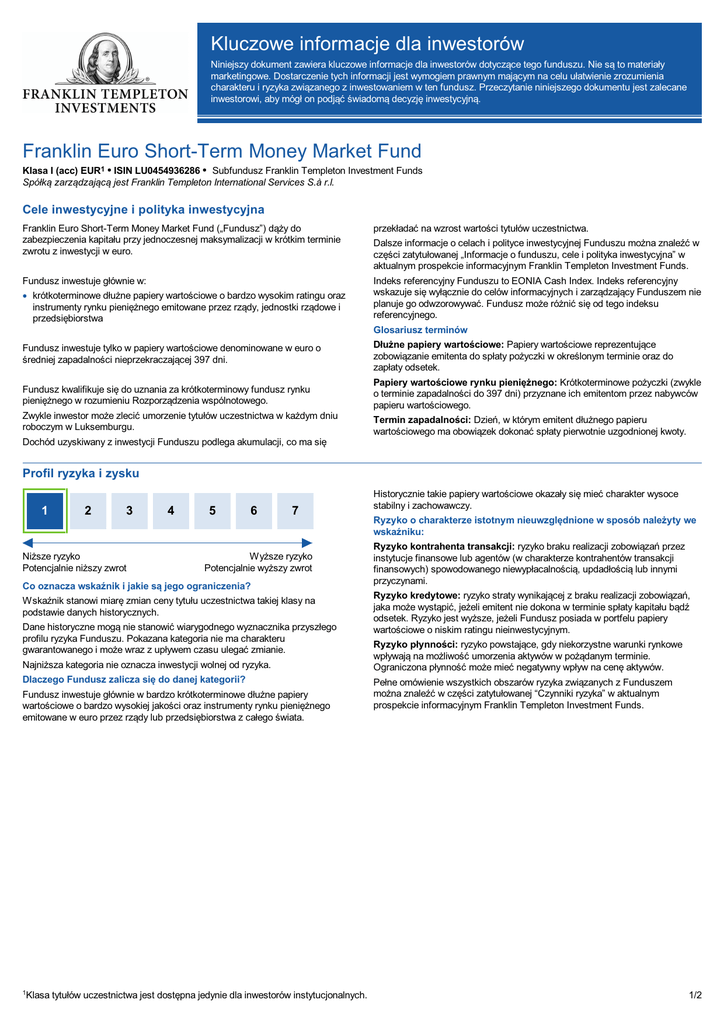 Kluczowe informacje dla inwestorów Niniejszy dokument zawiera kluczowe informacje dla inwestorów dotyczące tego funduszu. Nie są to materiały marketingowe. Dostarczenie tych informacji jest wymogiem prawnym mającym na celu ułatwienie zrozumienia charakteru i ryzyka związanego z inwestowaniem w ten fundusz. Przeczytanie niniejszego dokumentu jest zalecane inwestorowi, aby mógł on podjąć świadomą decyzję inwestycyjną. Franklin Euro Short-Term Money Market Fund Klasa I (acc) EUR1 • ISIN LU0454936286 • Subfundusz Franklin Templeton Investment Funds Spółką zarządzającą jest Franklin Templeton International Services S.à r.l. Cele inwestycyjne i polityka inwestycyjna Franklin Euro Short-Term Money Market Fund („Fundusz”) dąży do zabezpieczenia kapitału przy jednoczesnej maksymalizacji w krótkim terminie zwrotu z inwestycji w euro. Fundusz inwestuje głównie w: przekładać na wzrost wartości tytułów uczestnictwa. Dalsze informacje o celach i polityce inwestycyjnej Funduszu można znaleźć w części zatytułowanej „Informacje o funduszu, cele i polityka inwestycyjna” w aktualnym prospekcie informacyjnym Franklin Templeton Investment Funds. · krótkoterminowe dłużne papiery wartościowe o bardzo wysokim ratingu oraz instrumenty rynku pieniężnego emitowane przez rządy, jednostki rządowe i przedsiębiorstwa Indeks referencyjny Funduszu to EONIA Cash Index. Indeks referencyjny wskazuje się wyłącznie do celów informacyjnych i zarządzający Funduszem nie planuje go odwzorowywać. Fundusz może różnić się od tego indeksu referencyjnego. Glosariusz terminów Fundusz inwestuje tylko w papiery wartościowe denominowane w euro o średniej zapadalności nieprzekraczającej 397 dni. Dłużne papiery wartościowe: Papiery wartościowe reprezentujące zobowiązanie emitenta do spłaty pożyczki w określonym terminie oraz do zapłaty odsetek. Fundusz kwalifikuje się do uznania za krótkoterminowy fundusz rynku pieniężnego w rozumieniu Rozporządzenia wspólnotowego. Zwykle inwestor może zlecić umorzenie tytułów uczestnictwa w każdym dniu roboczym w Luksemburgu. Dochód uzyskiwany z inwestycji Funduszu podlega akumulacji, co ma się Papiery wartościowe rynku pieniężnego: Krótkoterminowe pożyczki (zwykle o terminie zapadalności do 397 dni) przyznane ich emitentom przez nabywców papieru wartościowego. Termin zapadalności: Dzień, w którym emitent dłużnego papieru wartościowego ma obowiązek dokonać spłaty pierwotnie uzgodnionej kwoty. Profil ryzyka i zysku 1 2 3 Niższe ryzyko Potencjalnie niższy zwrot 4 5 6 7 Wyższe ryzyko Potencjalnie wyższy zwrot Co oznacza wskaźnik i jakie są jego ograniczenia? Wskaźnik stanowi miarę zmian ceny tytułu uczestnictwa takiej klasy na podstawie danych historycznych. Dane historyczne mogą nie stanowić wiarygodnego wyznacznika przyszłego profilu ryzyka Funduszu. Pokazana kategoria nie ma charakteru gwarantowanego i może wraz z upływem czasu ulegać zmianie. Najniższa kategoria nie oznacza inwestycji wolnej od ryzyka. Dlaczego Fundusz zalicza się do danej kategorii? Fundusz inwestuje głównie w bardzo krótkoterminowe dłużne papiery wartościowe o bardzo wysokiej jakości oraz instrumenty rynku pieniężnego emitowane w euro przez rządy lub przedsiębiorstwa z całego świata. 1 Klasa tytułów uczestnictwa jest dostępna jedynie dla inwestorów instytucjonalnych. Historycznie takie papiery wartościowe okazały się mieć charakter wysoce stabilny i zachowawczy. Ryzyko o charakterze istotnym nieuwzględnione w sposób należyty we wskaźniku: Ryzyko kontrahenta transakcji: ryzyko braku realizacji zobowiązań przez instytucje finansowe lub agentów (w charakterze kontrahentów transakcji finansowych) spowodowanego niewypłacalnością, updadłością lub innymi przyczynami. Ryzyko kredytowe: ryzyko straty wynikającej z braku realizacji zobowiązań, jaka może wystąpić, jeżeli emitent nie dokona w terminie spłaty kapitału bądź odsetek. Ryzyko jest wyższe, jeżeli Fundusz posiada w portfelu papiery wartościowe o niskim ratingu nieinwestycyjnym. Ryzyko płynności: ryzyko powstające, gdy niekorzystne warunki rynkowe wpływają na możliwość umorzenia aktywów w pożądanym terminie. Ograniczona płynność może mieć negatywny wpływ na cenę aktywów. Pełne omówienie wszystkich obszarów ryzyka związanych z Funduszem można znaleźć w części zatytułowanej “Czynniki ryzyka” w aktualnym prospekcie informacyjnym Franklin Templeton Investment Funds. 1/2 Franklin Euro Short-Term Money Market Fund Opłaty Opłaty ponoszone przez inwestora służą pokryciu kosztów działalności Funduszu, w tym kosztów jego marketingu i dystrybucji. Opłaty obniżają stopę potencjalnego wzrostu wartości inwestycji. Podane opłaty bieżące mają charakter szacunkowy. Skorzystaliśmy z szacunków, ponieważ poprzednie dane przestały być wiarygodne zważywszy na ostatnią restrukturyzację Funduszu. Raport roczny UCITS za każdy rok obrotowy będzie zawierać dokładne wyszczególnienie wszystkich ponoszonych opłat. Opłaty jednorazowe pobierane przed lub po dokonaniu inwestycji Opłata za nabycie Nie dotyczy Opłata za odkupienie Nie dotyczy Szczegółowe informacje o opłatach można znaleźć w części zatytułowanej „Klasy tytułów uczestnictwa”, jak i w Załączniku E do aktualnego prospektu informacyjnego Franklin Templeton Investment Funds. Jest to maksymalna kwota, jaka może zostać pobrana z Państwa środków przed ich zainwestowaniem. Opłaty pobierane z Funduszu w ciągu roku Opłaty bieżące 0,22% Opłaty pobierane z Funduszu w określonych warunkach szczególnych Opłata za wyniki Nie dotyczy Wyniki osiągnięte w przeszłości · Wyniki osiągnięte w przeszłości nie wskazują ani nie gwarantują wyników przyszłych. 1.5% 1.0% · Przedstawione wyniki osiągnięte w przeszłości uwzględniają wszelkie opłaty bieżące. 0,8 0,4 0.5% 0,3 · Wyniki o
