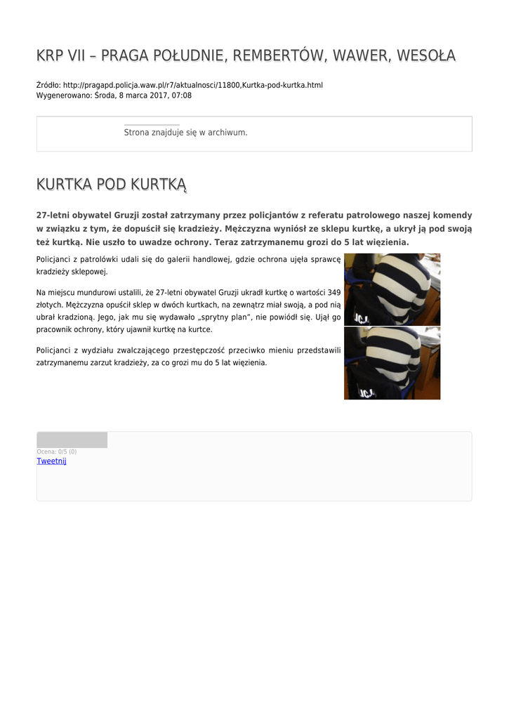 KRP VII – PRAGA POŁUDNIE, REMBERTÓW, WAWER, WESOŁA Źródło: http://pragapd.policja.waw.pl/r7/aktualnosci/11800,Kurtka-pod-kurtka.html Wygenerowano: Środa, 8 marca 2017, 07:08 Strona znajduje się w archiwum. KURTKA POD KURTKĄ 27-letni obywatel Gruzji został zatrzymany przez policjantów z referatu patrolowego naszej komendy w związku z tym, że dopuścił się kradzieży. Mężczyzna wyniósł ze sklepu kurtkę, a ukrył ją pod swoją też kurtką. Nie uszło to uwadze ochrony. Teraz zatrzymanemu grozi do 5 lat więzienia. Policjanci z patrolówki udali się do galerii handlowej, gdzie ochrona ujęła sprawcę kradzieży sklepowej. Na miejscu mundurowi ustalili, że 27-letni obywatel Gruzji ukradł kurtkę o wartości 349 złotych. Mężczyzna opuścił sklep w dwóch kurtkach, na zewnątrz miał swoją, a pod nią ubrał kradzioną. Jego, jak mu się wydawało „sprytny plan”, nie powiódł się. Ujął go pracownik ochrony, który ujawnił kurtkę na kurtce. Policjanci z wydziału zwalczającego przestępczość przeciwko mieniu przedstawili zatrzymanemu zarzut kradzieży, za co grozi mu do 5 lat więzienia. Ocena: 0/5 (0) Tweetnij
