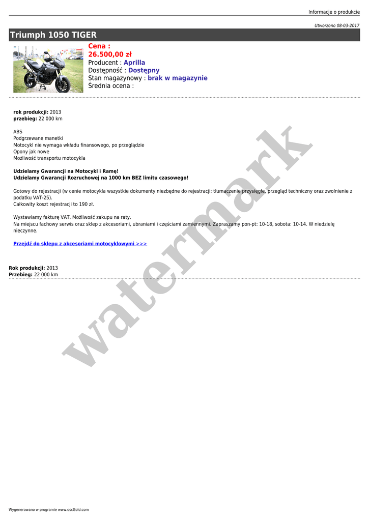 Informacje o produkcie Utworzono 08-03-2017 Triumph 1050 TIGER Cena : 26.500,00 zł Producent : Aprilla Dostępność : Dostępny Stan magazynowy : brak w magazynie Średnia ocena : rok produkcji: 2013 przebieg: 22 000 km er m ar k ABS Podgrzewane manetki Motocykl nie wymaga wkładu finansowego, po przeglądzie Opony jak nowe Możliwość transportu motocykla Udzielamy Gwarancji na Motocykl i Ramę! Udzielamy Gwarancji Rozruchowej na 1000 km BEZ limitu czasowego! Gotowy do rejestracji (w cenie motocykla wszystkie dokumenty niezbędne do rejestracji: tłumaczenie przysięgłe, przegląd techniczny oraz zwolnienie z podatku VAT-25). Całkowity koszt rejestracji to 190 zł. Wystawiamy fakturę VAT. Możliwość zakupu na raty. Na miejscu fachowy serwis oraz sklep z akcesoriami, ubraniami i częściami zamiennymi. Zapraszamy pon-pt: 10-18, sobota: 10-14. W niedzielę nieczynne. Przejdź do sklepu z akcesoriami motocyklowymi >>> w at Rok produkcji: 2013 Przebieg: 22 000 km Wygenerowano w programie www.oscGold.com