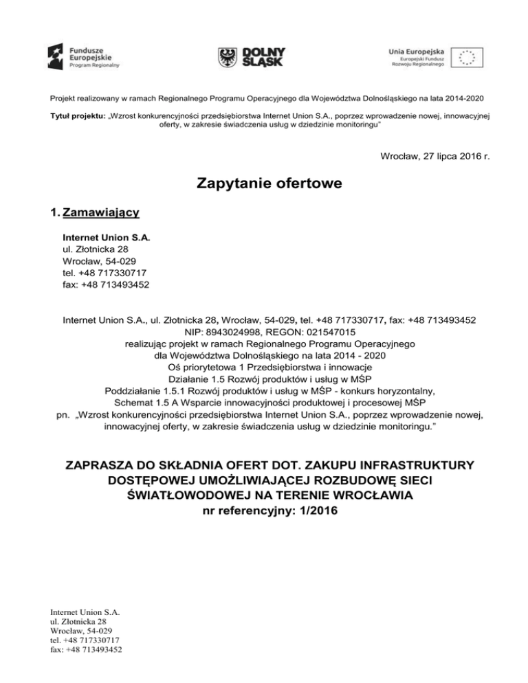 Projekt realizowany w ramach Regionalnego Programu Operacyjnego dla Województwa Dolnośląskiego na lata 2014-2020 Tytuł projektu: „Wzrost konkurencyjności przedsiębiorstwa Internet Union S.A., poprzez wprowadzenie nowej, innowacyjnej oferty, w zakresie świadczenia usług w dziedzinie monitoringu” Wrocław, 27 lipca 2016 r. Zapytanie ofertowe 1. Zamawiający Internet Union S.A. ul. Złotnicka 28 Wrocław, 54-029 tel. +48 717330717 fax: +48 713493452 Internet Union S.A., ul. Złotnicka 28, Wrocław, 54-029, tel. +48 717330717, fax: +48 713493452 NIP: 8943024998, REGON: 021547015 realizując projekt w ramach Regionalnego Programu Operacyjnego dla Województwa Dolnośląskiego na lata 2014 - 2020 Oś priorytetowa 1 Przedsiębiorstwa i innowacje Działanie 1.5 Rozwój produktów i usług w MŚP Poddziałanie 1.5.1 Rozwój produktów i usług w MŚP - konkurs horyzontalny, Schemat 1.5 A Wsparcie innowacyjności produktowej i procesowej MŚP pn. „Wzrost konkurencyjności przedsiębiorstwa Internet Union S.A., poprzez wprowadzenie nowej, innowacyjnej oferty, w zakresie świadczenia usług w dziedzinie monitoringu.” ZAPRASZA DO SKŁADNIA OFERT DOT. ZAKUPU INFRASTRUKTURY DOSTĘPOWEJ UMOŻLIWIAJĄCEJ ROZBUDOWĘ SIECI ŚWIATŁOWODOWEJ NA TERENIE WROCŁAWIA nr referencyjny: 1/2016 Internet Union S.A. ul. Złotnicka 28 Wrocław, 54-029 tel. +48 717330717 fax: +48 713493452 Projekt realizowany w ramach Regionalnego Programu Operacyjnego dla Województwa Dolnośląskiego na lata 2014-2020 Tytuł projektu: „Wzrost konkurencyjności przedsiębiorstwa Internet Union S.A., poprzez wprowadzenie nowej, innowacyjnej oferty, w zakresie świadczenia usług w dziedzinie monitoringu” 2. Opis przedmiotu zamówienia Zapytanie ofertowe dot. zakupu infrastruktury dostępowej umożliwiającej rozbudowę sieci światłowodowej, obejmującej: (i) aktywną sieć dostępową (szkieletową), (ii) wewnętrzną sieć światłowodową oraz (iii) zewnętrzną sieć światłowodową, dzięki którym możliwe będzie podłączenie nowej usługi, opartej na technologii sieci światłowodowej. Zakupiona sieć światłowodowa zostanie zainstalowana na terenie Wrocławia – SM Piast zgodnie z wnioskiem o dofinansowaniem projektu pn. „Wzrost konkurencyjności przedsiębiorstwa Internet Union S.A., poprzez wprowadzenie nowej, innowacyjnej oferty, w zakresie świadczenia usług w dziedzinie monitoringu”. Kod CPV: 32523000-5 - Urządzenia telekomunikacyjne Szczegółowe informacje na temat przedmiotu zamówienia: Szczegółowy opis przedmiotu zamówienia znajduje się w tabeli poniżej i jest zgodny z wnioskiem o dofinansowanie projektu pn. „Wzrost konkurencyjności przedsiębiorstwa Internet Union S.A., poprzez wprowadzenie nowej, innowacyjnej oferty, w zakresie świadczenia usług w dziedzinie monitoringu”. Przedmiot zamówienia (nazwa kategorii wydatku) Aktywna sieć dostępowa (szkieletowa) SM Piast – 1 szt. Wymagane parametry techniczne: Przedmiotowa aktywna sieć dostępowa powinna umożliwiając podłączenia do niej wewnętrznej i zewnętrznej sieci szkieletowej. Sieć wyposażona Planowany termin dostawy: do 31 października w 3 podstawowe elementy w następujących 2016 r. ilościach i minimalnych parametrach technicznych: Urządzenie centralne (do której podłączony będzie internet), 1 szt. o minimalnych parametrach technicznych: o GPON OLT z 8 portami typu SFP na wkładki B+ lub C+. o Minimalna ilość terminali do podpięcia 1024 (przy splicie 1:128); Internet Union S.A. ul. Złotnicka 28 Wrocław, 54-029 tel. +48 717330717 fax: +48 713493452 Projekt realizowany w ramach Regionalnego Programu Operacyjnego dla Województwa Dolnośląskiego na lata 2014-2020 Tytuł projektu: „Wzrost konkurencyjności przedsiębiorstwa Internet Union S.A., poprzez wprowadzenie nowej, innowacyjnej oferty, w zakresie świadczenia usług w dziedzinie monitoringu” o 2 porty SFP+ 10Gbit, o 8-portów COMBO (RJ45/SFP) lub 8 gniazd SFP; o maksymalnie 2 zasilacze AC bądź DC, o funkcje L2 i L3 (routing OSPF, PIM-SM, DHCP Option 82) RADIUS; o możliwość stackowania, zarządzanie WWW Urządzenia klienckie pełniące funkcje switcha/routera – 143 szt. o minimalnych parametrach technicznych: o 4-Ports 10/100/1000Base-TX, o 2-port POTS (FXS) VoIP o Wi-Fi b/g/n 300Mb (2 zew anteny) o Interfes "F" na potrzeby telewizji analogowej bądż DVB; GPON B+, o Funkcja Routera/NAT/PPPoE lub Bridga Jednostki abonenckie zapewniające ekonomiczny dostęp do światłowodowej sieci dostępowej (spełniającej również funkcję routera) – 241 szt. o minimalnych parametrach technicznych: o 1-Port 10/100/1000Base-TX; o GPON B+ SC/APC; o Funkcja Routera/NAT/PPPoE lub Bridga. Wymagania funkcjonalne: o możliwość podłączenia sieci światłowodowych; o pełnienie funkcji rozgałęźnika Internetu; o łączenie ze sobą małych sieci (dostępowych) w większej aglomerat; o funkcja routera, która pozwala tworzyć zabezpieczenia (kilka połączeń do jednego punktu - technologia mesh); o łączenie sieci w okrąg, stanowiący funkcję redundancji, co zabezpiecza transmisję; o kontrola transmisji danych; o możliwość przesyłu większej ilości Mb/s, Internet Union S.A. ul. Złotnicka 28 Wrocław, 54-029 tel. +48 717330717 fax: +48 713493452 Projekt realizowany w ramach Regionalnego Programu Operacyjnego dla Województwa Dolnośląskiego na lata 2014-2020 Tytuł projektu: „Wzrost konkurencyjności przedsiębiorstwa Internet Union S.A., poprzez wprowadzenie nowej, innowacyjnej oferty, w zakresie świadczenia usług w dziedzinie monitoringu” co zwiększy prędkość usługi. dostawa, instalacja oraz konfiguracja przedmiotu umowy na wybranym obszarze, przekazanie dokumentacji powykonawczej. Zewnętrzna sieć światłowodowa – SM Piast: Zewnętrzna sieć światłowodowa, zapewniająca umożliwienie dostępu na wybranym obszarze o Planowany termin dostawy: do 31 października łącznej długości min. 10500 m oraz możliwość 2016 