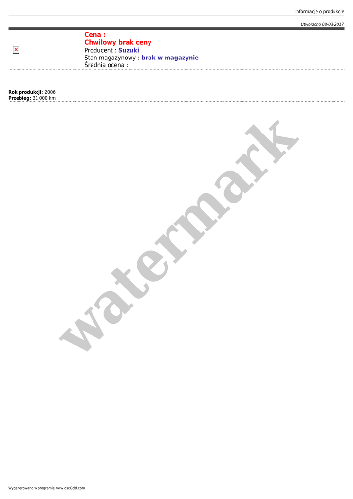 Informacje o produkcie Utworzono 08-03-2017 Cena : Chwilowy brak ceny Producent : Suzuki Stan magazynowy : brak w magazynie Średnia ocena : w at er m ar k Rok produkcji: 2006 Przebieg: 31 000 km Wygenerowano w programie www.oscGold.com
