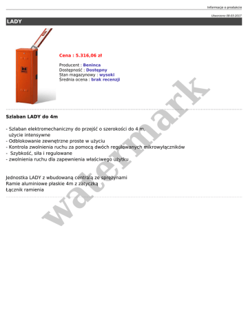 Informacje o produkcie Utworzono 08-03-2017 LADY Cena : 5.316,06 zł Szlaban LADY do 4m er m ar k Producent : Beninca Dostępność : Dostępny Stan magazynowy : wysoki Średnia ocena : brak recenzji - Szlaban elektromechaniczny do przejść o szerokości do 4 m, użycie intensywne - Odblokowanie zewnętrzne proste w użyciu - Kontrola zwolnienia ruchu za pomocą dwóch regulowanych mikrowyłączników - Szybkość, siła i regulowane - zwolnienia ruchu dla zapewnienia właściwego użytku w at Jednostka LADY z wbudowaną centralą ze sprężynami Ramie aluminiowe płaskie 4m z zatyczką Łącznik ramienia