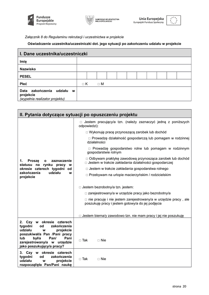 Załącznik 8 do Regulaminu rekrutacji i uczestnictwa w projekcie Oświadczenie uczestnika/uczestniczki dot. jego sytuacji po zakończeniu udziału w projekcie I. Dane uczestnika/uczestniczki Imię Nazwisko PESEL Płeć Data zakończenia udziału projekcie (wypełnia realizator projektu) K M w II. Pytania dotyczące sytuacji po opuszczeniu projektu Jestem pracujący/a tzn. (należy zaznaczyć jedną z poniższych odpowiedzi): Wykonuję pracę przynoszącą zarobek lub dochód Prowadzę działalność gospodarczą lub pomagam w rodzinnej działalności Prowadzę gospodarstwo rolne lub pomagam w rodzinnym gospodarstwie rolnym 1. Proszę o zaznaczenie statusu na rynku pracy w okresie czterech tygodni od zakończenia udziału w projekcie Odbywam praktykę zawodową przynosząca zarobek lub dochód Jestem w trakcie zakładania działalności gospodarczej Jestem w trakcie zakładania gospodarstwa rolnego Przebywam na urlopie macierzyńskim / rodzicielskim Jestem bezrobotny/a tzn. jestem: zarejestrowany/a w urzędzie pracy jako bezrobotny/a nie pracuję i nie jestem zarejestrowany/a w urzędzie pracy , ale poszukuję pracy i jestem gotowy/a do jej podjęcia Jestem bierna/y zawodowo tzn. nie mam pracy i jej nie poszukuję 2. Czy w okresie czterech tygodni od zakończenia udziału w projekcie poszukiwał/a Pan /Pani pracy lub był/a Pan/ Pani zarejestrowany/a w urzędzie jako poszukujący/a pracy? 3. Czy w okresie czterech tygodni od zakończenia udziału w projekcie rozpoczął/ęła Pan/Pani naukę Tak Nie Tak Nie strona 20 w szkole lub wziął/ęła udział w szkoleniu? 4. Czy w okresie czterech tygodni od zakończenia udziału w projekcie uzyskał/a Pan/Pani, po zdanym egzaminie certyfikat/zaświadczenie potwierdzające uzyskanie kwalifikacji? Tak Nie tzn. w projekcie uczestniczył/a Pan/Pani w kursie/szkoleniu, które zakończyło się egzaminem i dopiero po zdaniu egzaminu otrzymał/a Pan/Pani certyfikat / świadectwo) Oświadczam, że zostałam/em poinformowana/y, że moje dane osobowe będą wykorzystywane jedynie na potrzeby monitorowania wskaźników rezultatu bezpośredniego projektu „Pomoc w rodzinie”. Oświadczam, że wszystkie podane przeze mnie informacje są prawdziwe i kompletne. Oświadczam, że zostałam/em pouczona/y o odpowiedzialności karnej za składanie fałszywych oświadczeń. …..………………… MIEJSCOWOŚĆ I DATA …………………………………… CZYTELNY PODPIS UCZESTNIKA PROJEKTU strona 21