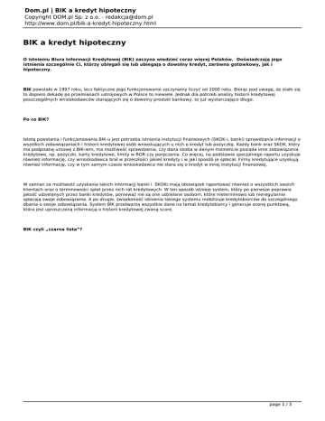 Dom.pl | BIK a kredyt hipoteczny Copyright DOM.pl Sp. z o.o. - [email protected] http://www.dom.pl/bik-a-kredyt-hipoteczny.html BIK a kredyt hipoteczny O istnieniu Biura Informacji Kredytowej (BIK) zaczyna wiedzieć coraz więcej Polaków. Doświadczają jego istnienia szczególnie Ci, którzy ubiegali się lub ubiegają o dowolny kredyt, zarówno gotówkowy, jak i hipoteczny. BIK powstało w 1997 roku, lecz faktyczne jego funkcjonowanie zaczynamy liczyć od 2000 roku. Biorąc pod uwagę, że stało się to dopiero dekadę po przemianach ustrojowych w Polsce to niewiele. Jednak dla potrzeb analizy historii kredytowej poszczególnych wnioskodawców starających się o dowolny produkt bankowy, to już wystarczająco długo. Po co BIK? Istotą powstania i funkcjonowania BIK-u jest potrzeba istnienia instytucji finansowych (SKOK-i, banki) sprawdzania informacji o wszelkich zobowiązaniach i historii kredytowej osób wnioskujących u nich o kredyt lub pożyczkę. Każdy bank oraz SKOK, który ma podpisaną umowę z BIK-iem, ma możliwość sprawdzenia, czy dana osoba w danym momencie posiada inne zobowiązania kredytowe, np. pożyczki, karty kredytowe, limity w ROR czy poręczenia. Co więcej, na podstawie specjalnego raportu uzyskuje również informację, czy wnioskodawca brał w przeszłości jakieś kredyty i w jaki sposób je spłacał. Firmy kredytujące uzyskują również informację, czy w tym samym czasie wnioskodawca nie stara się o kredyt w innej instytucji finansowej. W zamian za możliwość uzyskania takich informacji banki i SKOKi mają obowiązek raportować również o wszystkich swoich klientach oraz o terminowości spłat przez nich rat kredytowych. W ten sposób istnieje system, który po pierwsze poprawia jakość udzielanych przez banki kredytów, ponieważ nie są one udzielane osobom, które nieterminowo lub nieregularnie spłacają swoje zobowiązania. A po drugie, świadomość istnienia takiego systemu mobilizuje kredytobiorców do szczególnego dbania o swoje zobowiązania. System BIK przetwarza wszystkie dane na temat kredytobiorcy i generuje ocenę punktową, która jest uproszczoną informacją o historii kredytowej zwaną score. BIK czyli „czarna lista”? page 1 / 3 Dom.pl | BIK a kredyt hipoteczny Copyright DOM.pl Sp. z o.o. - [email protected] http://www.dom.pl/bik-a-kredyt-hipoteczny.html (Czy BIK to bankowa "czarna lista"?) Wiele osób, które otrzymały informację od banku o tym, że są odnotowane w BIKu co jest spowodowane opóźnieniami w spłacie kart kredytowych, obawiają się, że znajduje się na „czarnej liście” dłużników. W rzeczywistości takie pojęcie nie istnieje, a informacje o nieterminowych zobowiązaniach czy niedopłatach wymaganych wysokości rat mają charakter bardziej złożony. Każde opóźnienie płatności charakteryzuje się dwoma cechami: wysokością kwoty oraz długością okresu od wymaganej daty płatności do jej faktycznego zapłacenia. Terminy tych opóźnień są w BIK-u ściśle określone i zawierają się w okresach do 30 dni, od 30 do 90 dni oraz od 90 do 180 dni. Widać też czy była przeprowadzona windykacja oraz czy płatność nie została umorzona. BIK udostępnia bankom historię kredytową klientów do 5 lat wstecz, chociaż sam do celów statystycznych może te dane przetwarzać przez lat 12. Po tym okresie informacje te są usuwane. BIK i opóźnienia Największym zaskoczeniem dla większości osób ubiegających się o kredyt hipoteczny jest najczęściej to, że nawet niewielkie opóźnienie płatności jakiegoś zobowiązania, np. 31 dni raty w wysokości 150 zł dwa lata temu, może skutkować odmową page 2 / 3 Dom.pl | BIK a kredyt hipoteczny Copyright DOM.pl Sp. z o.o. - [email protected] http://www.dom.pl/bik-a-kredyt-hipoteczny.html udzielenia kredytu w wysokości np. 300 000 zł! „Dlaczego? Przecież to niesprawiedliwe. Opóźnienie dwa lata temu było przypadkowe, byłem wtedy na wakacjach, nie wiedziałem, że to tak ważne, miałem przecież pieniądze na spłatę” - brzmią najczęściej wytłumaczenia. Fakt jest faktem. Było opóźnienie i baza BIK ma to właśnie pokazać. Całe szczęście nie wszystkie banki są tak rygorystyczne i dobrze napisane wyjaśnienie z opisem sytuacji pozwala na uzyskanie odstępstwa i zgodę na uzyskanie kredytu. Dla banków ważne będzie to, żeby zaległe zobowiązanie nie było za wysokie oraz żeby nie było zbyt dużo przekroczone. Dlatego część banków zaakceptuje np. zaległość do 200 zł do 90 dni, czy nie będzie brało pod uwagę zaległości do 50 zł do 180 dni, czy różne warianty tych rozwiązań. Co więcej, na zasadzie odstępstwa są banki, które mogą zaakceptować wyższe kwoty zaległości do 180 dni, a nawet nieodległą windykację, pod warunkiem, że wnioskodawca udowodni, że przekroczenie zobowiązania wyniknęło nie z jego winy. Dzieje się tak najczęściej, gdy ktoś na dłuższy czas wyjechał za granicę lub uzyskał kartę kredytową, której nigdy nie używał, a opłata za jej uzyskanie punktuje w BIK-u jak bomba z opóźnionym zapłonem do czasu, aż zawnioskuje się o jakikolwiek kredyt. BIK nazywany przez niektórych żartobliwie „BIK Brotherem” z powodu znacznej inwigilacji historii kredytowej klientów banków jest instytucją, która z tego przede wszystkim względu spełnia również rolę bufora w postaci ograniczania zapędów banków do przedkładania przez kredytobiorców dodatkowych zabezpieczeń i poręczycieli. Mieliśmy do czynienia z taką sytuacją przed erą BIK-u. Dzięki niemu sytuacja między klientem i bankiem staje się bardziej przejrzysta i jeżeli ktoś regularnie spłaca swoje zobowiązania, to dowolny kredyt uzyska bez potrzeby żyranta, poręczyciela czy udowadniania w inny sposób, że kredyt będzie spłacał terminowo. page 3 / 3
