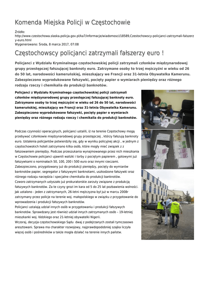 Komenda Miejska Policji w Częstochowie Źródło: http://www.czestochowa.slaska.policja.gov.pl/ka7/informacje/wiadomosci/18589,Czestochowscy-policjanci-zatrzymali-falszerz y-euro.html Wygenerowano: Środa, 8 marca 2017, 07:08 Częstochowscy policjanci zatrzymali fałszerzy euro ! Policjanci z Wydziału Kryminalnego częstochowskiej policji zatrzymali członków międzynarodowej grupy przestępczej fałszującej banknoty euro. Zatrzymane osoby to trzej mężczyźni w wieku od 26 do 50 lat, narodowości kameruńskiej, mieszkający we Francji oraz 31-letnia Obywatelka Kamerunu. Zabezpieczono wyprodukowane fałszywki, pocięty papier o wymiarach pieniędzy oraz różnego rodzaju rzeczy i chemikalia do produkcji banknotów. Policjanci z Wydziału Kryminalnego częstochowskiej policji zatrzymali członków międzynarodowej grupy przestępczej fałszującej banknoty euro. Zatrzymane osoby to trzej mężczyźni w wieku od 26 do 50 lat, narodowości kameruńskiej, mieszkający we Francji oraz 31-letnia Obywatelka Kamerunu. Zabezpieczono wyprodukowane fałszywki, pocięty papier o wymiarach pieniędzy oraz różnego rodzaju rzeczy i chemikalia do produkcji banknotów. Podczas czynności operacyjnych, policjanci ustalili, iż na terenie Częstochowy mogą przebywać członkowie międzynarodowej grupy przestępczej , którzy fałszują banknoty euro. Ustalenia policjantów potwierdziły się, gdy w wyniku policyjnej akcji , w jednym z częstochowskich hoteli zatrzymano kilka osób, które mogły mieć związek z z fałszowaniem pieniędzy. Podczas przeszukania wynajmowanego przez nich mieszkania w Częstochowie policjanci ujawnili walizki i torby z pociętym papierem , gotowymi już fałszywkami o nominałach 50, 100, 200 i 500 euro oraz innymi rzeczami. Zabezpieczono, przygotowany już do produkcji pieniędzy, pocięty do wymiarów banknotów papier, segregator z fałszywymi banknotami, uszkodzone fałszywki oraz różnego rodzaju narzędzia i specjalne chemikalia do produkcji banknotów. Czworo zatrzymanych usłyszało już prokuratorskie zarzuty związane z produkcją fałszywych banknotów. Za te czyny grozi im kara od 5 do 25 lat pozbawienia wolności. Jak ustalono - jeden z zatrzymanych, 26-letni mężczyzna był już w marcu 2008r zatrzymany przez policje na terenie woj. małopolskiego w związku z przygotowanie do wprowadzenia i produkcji fałszywych banknotów. Policjanci ustalają udział innych osób w przygotowaniu i produkcji fałszywych banknotów. Sprawdzany jest również udział innych zatrzymanych osób – 19-letniej mieszkanki woj. łódzkiego oraz 21-letniej obywatelki Nigerii. Wczoraj, decyzja częstochowskiego Sądu dwaj z podejrzanych zostali tymczasowo aresztowani. Sprawa ma charakter rozwojowy, najprawdopodobniej szajka liczyła więcej osób i pośredników a także mogła działać na terenie innych państw. Ocena: 0/5 (0) Tweetnij