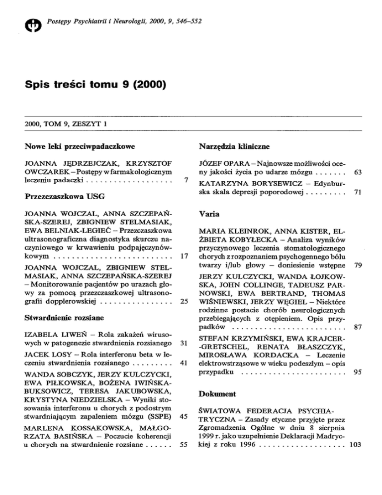 Spis treści tomu 9 (2000) - Instytut Psychiatrii i Neurologii