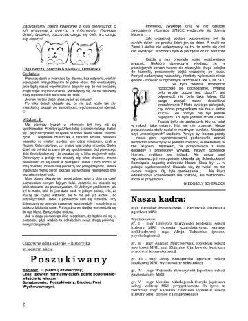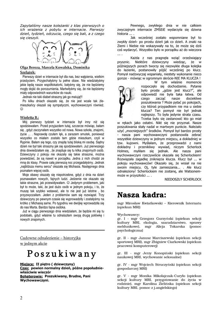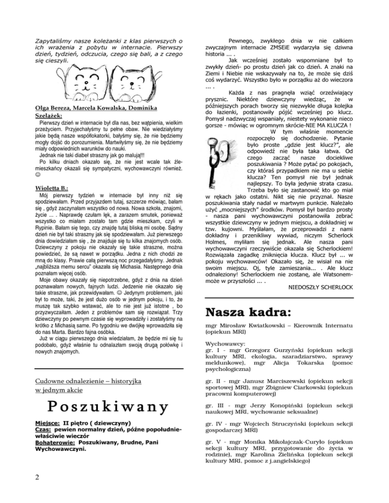 Zapytaliśmy nasze koleżanki z klas pierwszych o ich wrażenia z pobytu w internacie. Pierwszy dzień, tydzień, odczucia, czego się bali, a z czego się cieszyli. Olga Bereza, Marcela Kowalska, Dominika Szelążek: Pierwszy dzień w internacie był dla nas, bez wątpienia, wielkim przeżyciem. Przyjechałyśmy tu pełne obaw. Nie wiedziałyśmy jakie będą nasze współlokatorki, bałyśmy się, że nie będziemy mogły dojść do porozumienia. Martwiłyśmy się, że nie będziemy miały odpowiednich warunków do nauki. Jednak nie taki diabeł straszny jak go malują!!! Po kilku dniach okazało się, że nie jest wcale tak źlemieszkańcy okazali się sympatyczni, wychowawczyni również. ☺ Wioletta B.: Mój pierwszy tydzień w internacie był inny niż się spodziewałam. Przed przyjazdem tutaj, szczerze mówiąc, bałam się , gdyż zaczynałam wszystko od nowa. Nowa szkoła, znajomi, życie ... . Naprawdę czułam lęk, a zarazem smutek, ponieważ wszystko co miałam zostało tam gdzie mieszkam, czyli w Rypinie. Bałam się tego, czy znajdę tutaj bliską mi osobę. Sądny dzień nie był taki straszny jak się spodziewałam. Już pierwszego dnia dowiedziałam się , że znajduje się tu kilka znajomych osób. Dziewczyny z pokoju nie okazały się takie straszne, można powiedzieć, że są nawet w porządku. Jedna z nich chodzi ze mną do klasy. Prawie całą pierwszą noc przegadałyśmy. Jednak „najbliższa memu sercu” okazała się Michasia. Następnego dnia poznałam więcej osób. Moje obawy okazały się niepotrzebne, gdyż z dnia na dzień poznawałam nowych, fajnych ludzi. Jedzenie nie okazało się takie straszne, jak przewidywałam. ☺ Jedynym problemem, jaki był to może, taki, że jest dużo osób w jednym pokoju, i to, że muszę tak szybko wstawać, ale to nie jest już istotne , bo przyzwyczaiłam. Jeden z problemów sam się rozwiązał. Trzy dziewczyny po pewnym czasie się wyprowadziły i zostałyśmy na krótko z Michasią same. Po tygodniu we dwójkę wprowadziła się do nas Marta. Bardzo fajna osóbka. Już w ciągu pierwszego dnia wiedziałam, że będzie mi się tu podobało, gdyż właśnie tu odnalazłam swoją drugą połówkę i nowych znajomych. Cudowne odnalezienie – historyjka w jednym akcie Poszukiwany Miejsce: II piętro ( dziewczyny) Czas: pewien normalny dzień, późne popołudniewłaściwie wieczór Bohaterowie: Poszukiwany, Brudne, Pani Wychowawczyni. 2 Pewnego, zwykłego dnia w nie całkiem zwyczajnym internacie ZMSEiE wydarzyła się dziwna historia ... . Jak wcześniej zostało wspomniane był to zwykły dzień- po prostu dzień jak co dzień. A znaki na Ziemi i Niebie nie wskazywały na to, że może się dziś coś wydarzyć. Wszystko było w porządku aż do wieczora ... . Każda z nas pragnęła wziąć orzeźwiający prysznic. Niektóre dziewczyny wiedząc, że w późniejszych porach tworzy się niezwykle długa kolejka do łazienki, postanowiły pójść wcześniej po klucz. Pomysł nadzwyczaj wspaniały, niestety wykonanie nieco gorsze - mówiąc w ogromnym skrócie-NIE MA KLUCZA ! W tym właśnie momencie rozpoczęło się dochodzenie. Pytanie było proste „gdzie jest klucz?”, ale odpowiedź nie była taka łatwa. Od czego zacząć nasze dociekliwe poszukiwania ? Może pytać po pokojach, czy któraś przypadkiem nie ma u siebie klucza? Ten pomysł nie był jednak najlepszy. To była jedynie strata czasu. Trzeba było się zastanowić kto go miał w rękach jako ostatni. Nikt się nie przyznał. Nasze poszukiwania stały nadal w martwym punkcie. Należało użyć „mocniejszych” środków. Pomysł był bardzo prosty - nasza pani wychowawczyni postanowiła zebrać wszystkie dziewczyny w jednym miejscu, a dokładniej w tzw. kujowni. Myślałam, że przeprowadzi z nami dokładny i przenikliwy wywiad, niczym Scherlock Holmes, myliłam się jednak. Ale nasza pani wychowawczyni rzeczywiście okazała się Scherlockiem! Rozwiązała zagadkę zniknięcia klucza. Klucz był ... w pokoju wychowawców! Okazało się, że wisiał na nie swoim miejscu. Oj, tyle zamieszania... . Ale klucz odnaleziony! Scherlockiem nie zostanę, ale Watsonemmoże w przyszłości ... . NIEDOSZŁY SCHERLOCK Nasza kadra: mgr Mirosław Kwiatkowski – Kierownik Internatu (opiekun MRI) Wychowawcy: gr. I - mgr Grzegorz Gurzyński (opiekun sekcji kultury MRI, ekologia, szaradziarstwo, sprawy meldunkowe), mgr Alicja Tokarska (pomoc psychologiczna) gr. II - mgr Janusz Marciszewski (opiekun sekcji sportowej MRI), mgr Zbigniew Ciarkowski (opiekun pracowni komputerowej) gr. III - mgr Jerzy Konopiński (opiekun sekcji naukowej MRI, wychowanie seksualne) gr. IV - mgr Wojciech Struczyński (opiekun sekcji gospodarczej MRI) gr. V - mgr Monika Mikołajczak-Curyło (opiekun sekcji kultury MRI, przygotowanie do życia w rodzinie), mgr Karolina Zielińska (opiekun sekcji kultury MRI, pomoc z j.angielskiego)
