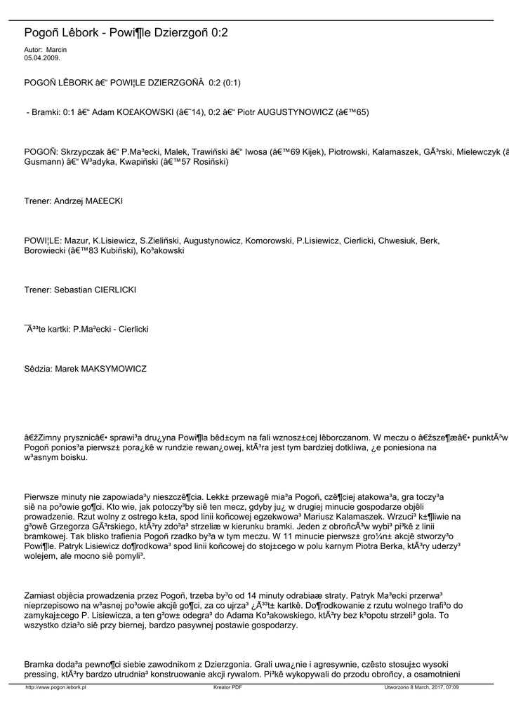Pogoñ Lêbork - Powi¶le Dzierzgoñ 0:2 Autor: Marcin 05.04.2009. POGOÑ LÊBORK – POWI¦LE DZIERZGOÑ 0:2 (0:1) - Bramki: 0:1 – Adam KO£AKOWSKI (‘14), 0:2 – Piotr AUGUSTYNOWICZ (’65) POGOÑ: Skrzypczak – P.Ma³ecki, Malek, Trawiñski – Iwosa (’69 Kijek), Piotrowski, Kalamaszek, Górski, Mielewczyk (â Gusmann) – W³adyka, Kwapiñski (’57 Rosiñski) Trener: Andrzej MA£ECKI POWI¦LE: Mazur, K.Lisiewicz, S.Zieliñski, Augustynowicz, Komorowski, P.Lisiewicz, Cierlicki, Chwesiuk, Berk, Borowiecki (’83 Kubiñski), Ko³akowski Trener: Sebastian CIERLICKI ¯Ã³³te kartki: P.Ma³ecki - Cierlicki Sêdzia: Marek MAKSYMOWICZ „Zimny prysznic― sprawi³a dru¿yna Powi¶la bêd±cym na fali wznosz±cej lêborczanom. W meczu o „sze¶æâ€• punktów Pogoñ ponios³a pierwsz± pora¿kê w rundzie rewan¿owej, która jest tym bardziej dotkliwa, ¿e poniesiona na w³asnym boisku. Pierwsze minuty nie zapowiada³y nieszczê¶cia. Lekk± przewagê mia³a Pogoñ, czê¶ciej atakowa³a, gra toczy³a siê na po³owie go¶ci. Kto wie, jak potoczy³by siê ten mecz, gdyby ju¿ w drugiej minucie gospodarze objêli prowadzenie. Rzut wolny z ostrego k±ta, spod linii koñcowej egzekwowa³ Mariusz Kalamaszek. Wrzuci³ k±¶liwie na g³owê Grzegorza Górskiego, który zdo³a³ strzeliæ w kierunku bramki. Jeden z obroñców wybi³ pi³kê z linii bramkowej. Tak blisko trafienia Pogoñ rzadko by³a w tym meczu. W 11 minucie pierwsz± gro¼n± akcjê stworzy³o Powi¶le. Patryk Lisiewicz do¶rodkowa³ spod linii koñcowej do stoj±cego w polu karnym Piotra Berka, który uderzy³ wolejem, ale mocno siê pomyli³. Zamiast objêcia prowadzenia przez Pogoñ, trzeba by³o od 14 minuty odrabiaæ straty. Patryk Ma³ecki przerwa³ nieprzepisowo na w³asnej po³owie akcjê go¶ci, za co ujrza³ ¿Ã³³t± kartkê. Do¶rodkowanie z rzutu wolnego trafi³o do zamykaj±cego P. Lisiewicza, a ten g³ow± odegra³ do Adama Ko³akowskiego, który bez k³opotu strzeli³ gola. To wszystko dzia³o siê przy biernej, bardzo pasywnej postawie gospodarzy. Bramka doda³a pewno¶ci siebie zawodnikom z Dzierzgonia. Grali uwa¿nie i agresywnie, czêsto stosuj±c wysoki pressing, który bardzo utrudnia³ konstruowanie akcji rywalom. Pi³kê wykopywali do przodu obroñcy, a osamotnieni http://www.pogon.lebork.pl Kreator PDF Utworzono 8 March, 2017, 07:09 napastnicy niewiele mogli zdzia³aæ bez wsparcia zbyt cofniêtych pomocników. Dosyæ przypadkow± okazjê do wyrównania mia³a Pogoñ w 38 minucie. Jeden z niewielu wyró¿niaj±cych siê w¶ród gospodarzy zawodników Mariusz W³adyka wrzuci³ pi³kê w pole karne, gdzie g³ow± z kilku metrów strzeli³ Piotr Kwapiñski. Minimalnie chybi³. Przebudzenie gospodarzy by³o konieczne, je¶li nie chcieli przegraæ tego meczu. Dotychczas grali zbyt wolno i czytelnie, przewidywalnie, ¿eby zaskoczyæ Powi¶le. W 47 minucie udan± akcjê przeprowadzili przyjezdni, zakoñczon± wrzutk± i strza³em g³ow±. Dwie minuty pó¼niej ¿Ã³³t± kartk± zosta³ ukarany graj±cy trener Sebastian Cierlicki za przerwanie rêk± kontrataku Pogoni. W 54 minucie ³atwo ograny zosta³ Eliasz Iwosa i zmuszony do obrony by³ Micha³ Skrzypczak. Z kolei w 59 minucie W³adyka poradzi³ sobie z obroñc± i wrzuci³ na dalszy s³upek. Do g³êbokiego do¶rodkowania nie zd±¿y³ Iwosa. Powi¶le podwy¿szy³o prowadzenie w podobnych okoliczno¶ciach, które towarzyszy³y pierwszej bramce. Rados³aw Piotrowski sfaulowa³ oko³o 25 metrów od bramki Pogoni. Do rzutu wolnego podszed³ obroñca Piotr Augustynowicz i potê¿nie strzeli³ w „okienko―. W 68 minucie Kalamaszek tak¿e egzekwowa³ sta³y fragment gry ale strzeli³ lekko i w ¶rodek bramki. W 72 minucie nie uderza³ bezpo¶rednio na bramkê ale do¶rodkowa³. Zagranie przed³u¿y³ jeden z zawodników, a pi³ka trafi³a do Artura Rosiñskiego. Wprowadzony za Kwapiñskiego napastnik strzeli³ z woleja w poprzeczkê. Gdyby zdoby³ gola, by³by jeszcze czas na uratowanie punktu. Jednak by³a to ju¿ ostatnia dogodna sytuacja Pogoni. W 88 minucie jeszcze jedn± okazjê mieli go¶cie. Prostopad³e podanie trafi³o do jednego z przyjezdnych, ale Daniel Malek zdo³a³ wybiæ pi³kê. Po rzucie ro¿nym Sebastian Zieliñski uderza³ g³ow± i niewiele siê pomyli³. http://www.pogon.lebork.pl Kreator PDF Utworzono 8 March, 2017, 07:09