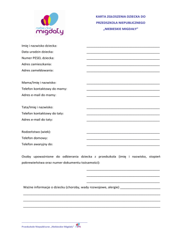 KARTA ZGŁOSZENIA DZIECKA DO PRZEDSZKOLA