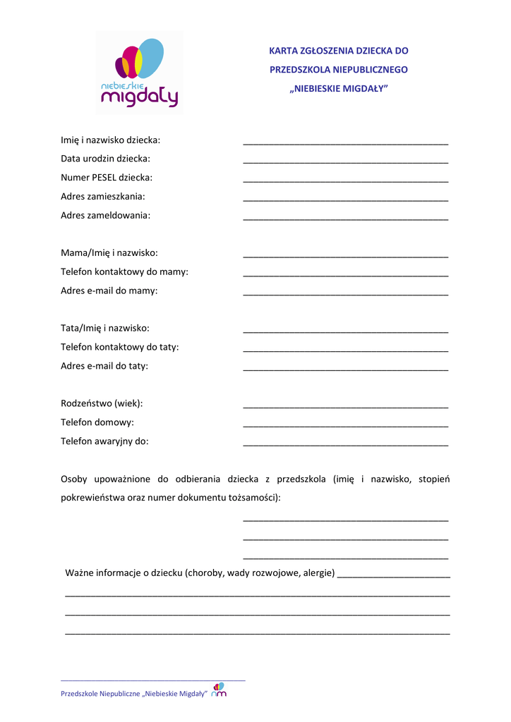 KARTA ZGŁOSZENIA DZIECKA DO PRZEDSZKOLA NIEPUBLICZNEGO „NIEBIESKIE MIGDAŁY” Imię i nazwisko dziecka: ________________________________________ Data urodzin dziecka: ________________________________________ Numer PESEL dziecka: ________________________________________ Adres zamieszkania: ________________________________________ Adres zameldowania: ________________________________________ Mama/Imię i nazwisko: ________________________________________ Telefon kontaktowy do mamy: ________________________________________ Adres e-mail do mamy: ________________________________________ Tata/Imię i nazwisko: ________________________________________ Telefon kontaktowy do taty: ________________________________________ Adres e-mail do taty: ________________________________________ Rodzeństwo (wiek): ________________________________________ Telefon domowy: ________________________________________ Telefon awaryjny do: ________________________________________ Osoby upoważnione do odbierania dziecka z przedszkola (imię i nazwisko, stopień pokrewieństwa oraz numer dokumentu tożsamości): ________________________________________ ________________________________________ ________________________________________ Ważne informacje o dziecku (choroby, wady rozwojowe, alergie) ______________________ ___________________________________________________________________________ ___________________________________________________________________________ ___________________________________________________________________________ ________________________________________________ Przedszkole Niepubliczne „Niebieskie Migdały” Wyrażam/nie wyrażam zgody/ę na fotografowanie i umieszczanie zdjęć mojego dziecka z przedszkola lub innych imprez przedszkolnych na stronie internetowej przedszkola www.niebieskiemigdaly.org.pl, na wystawach i innych publikacjach. Wyrażam/nie wyrażam zgody/ę na uczestnictwo mojego dziecka w spacerach i wycieczkach poza terenem Przedszkola. Zobowiązuję się do: 1. Po zakwalifikowaniu dziecka do Przedszkola, podpisania Umowy w terminie od dnia 30.04.2014 do 10.05.2014 roku. Nie podpisanie Umowy w tym terminie oznacza rezygnację z miejsca w Przedszkolu. 2. Przestrzegania postanowień Statutu i Regulaminu Przedszkola. 3. Podawania do wiadomości Przedszkola jakichkolwiek zmian w podanych wyżej informacjach. 4. Regularnego uiszczania w wyznaczonym terminie opłat za miejsce dziecka w Przedszkolu do 10 - go dnia każdego miesiąca, niezależnie od tego czy dziecko uczęszcza do Przedszkola czy też nie. 5. Przyprowadzania do Przedszkola tylko zdrowego dziecka. 6. Uczestniczenia w zebraniach Rodziców. Oświadczenie Rodziców/Opiekunów Oświadczam, że przedłożone przeze mnie informacje w niniejszej karcie są zgodne ze stanem faktycznym i wyrażam zgodę na wykorzystanie w/w danych przez przedszkole w celu przetwarzania ich dla potrzeb pedagogicznych i edukacyjnych (art. 23 ust. 1 i 2 oraz art. 24 ustawy z dnia 29.08.1997 roku o ochronie danych osobowych, Dz. U. Nr 133, poz. 883) Data, ______________ ___________________ ___________________ (podpis czytelny matki) (podpis czytelny ojca) Decyzja Komisji Kwalifikacyjnej Po rozpatrzeniu zgłoszenia Komisja podjęła następującą decyzję: 1. Zakwalifikowała dziecko do Przedszkola 2. Nie zakwalifikowała dziecka do Przedszkola z powodu _______________________ Podpisy członków Komisji: ____________________________ ____________________________ ____________________________ Decyzję Komisji zatwierdzam ________________________________________________ Przedszkole Niepubliczne „Niebieskie Migdały”