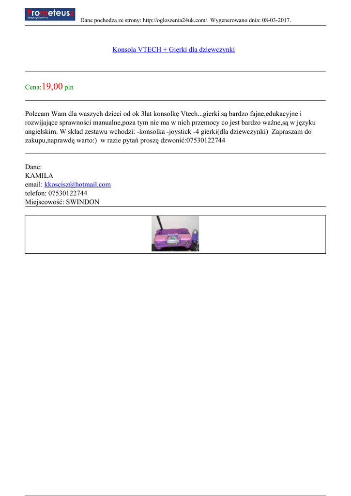 Dane pochodzą ze strony: http://ogloszenia24uk.com/. Wygenerowano dnia: 08-03-2017. Konsola VTECH + Gierki dla dziewczynki Cena:19,00 pln Polecam Wam dla waszych dzieci od ok 3lat konsolkę Vtech...gierki są bardzo fajne,edukacyjne i rozwijające sprawności manualne,poza tym nie ma w nich przemocy co jest bardzo ważne,są w języku angielskim. W skład zestawu wchodzi: -konsolka -joystick -4 gierki(dla dziewczynki) Zapraszam do zakupu,naprawdę warto:) w razie pytań proszę dzwonić:07530122744 Dane: KAMILA email: [email protected] telefon: 07530122744 Miejscowość: SWINDON