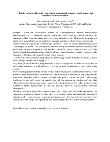 II Konferencja Ars Docendi – rozwijanie kompetencji dydaktycznych nauczycieli akademickich i doktorantów „Motywowanie studentów - wyniki badań” dr hab. Małgorzata Nodzyńska, dr hab. Alicja Walosik prof. UP, dr Paweł Cieśla Uniwersytet Pedagogiczny w Krakowie Jednym z warunków skuteczności uczenia się i podejmowania działań edukacyjnych skierowanych na kształtowanie postaw człowieka jest motywacja, która inspiruje do działania, nadaje kierunek aktywności i wytycza określone cele. Motywacja uważana jest przez wielu psychologów za najważniejszy czynnik sprzyjający efektywnemu uczeniu się. Termin motywacja pochodzi z łacińskiego „motivus - tae”, co można przetłumaczyć jako “skłaniający do ruchu”. W dzisiejszych czasach, kiedy ukończenie studiów wyższych nie gwarantuje ani pracy ani prestiżu ani wysokich zarobków, można zastanowić się, co skłania młodych ludzi do podjęcia studiów, jakie są ich motywacje do dalszej nauki i czy nauczyciele akademiccy biorą je pod uwagę. Powstają zatem pytania: - czy nauczyciele akademicy mają wpływ na motywację swoich studentów do nauki, a jeżeli tak to jakiego rodzaju jest to wpływ? - czy nauczyciele akademicy mają potrzebną wiedzę pedagogiczną by właściwie wpływać na motywację studentów, a jeżeli tak to czy w praktyce dnia codziennego wykorzystują swoją wiedzę? Na konferencji przedstawione zostaną wyniki badań nauczycieli akademickich dotyczące ich postaw wobec motywowania studentów oraz metod i narzędzi, które stosują by zmotywować studentów. Wstępna analiza danych ujawnia cała paletę postaw od zdań „Motywacja studentów to nie mój biznes, są dorośli, nikt ich nie zmusza do studiowania” do zdań „Najważniejszym elementem pracy nauczyciela akademickiego jest takie motywowanie studentów, które stymulowało by ich do dalszego rozwoju i poszerzania własnych umiejętności”. Ponieważ zarówno zbyt silne motywowanie jak i jego brak wpływają negatywnie na osiągnięcia studentów, dlatego wydaje się rzeczą bardzo ważną zaznajamianie nauczycieli akademickich z najnowszymi osiągnięciami pedagogów dotyczącymi motywowania osób dorosłych, tak by mogli oni w praktyce dnia codziennego właściwie motywować studentów. Słowa klucze: motywacja, dydaktyka szkoły wyższej, badania