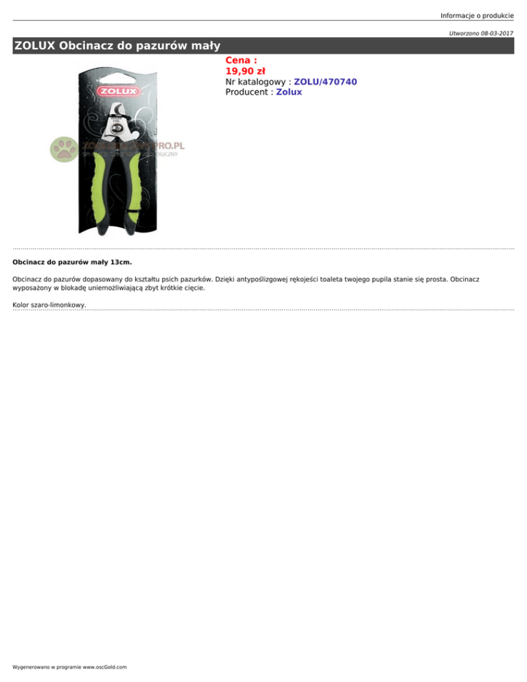 Informacje o produkcie Utworzono 08-03-2017 ZOLUX Obcinacz do pazurów mały Cena : 19,90 zł Nr katalogowy : ZOLU/470740 Producent : Zolux Obcinacz do pazurów mały 13cm. Obcinacz do pazurów dopasowany do kształtu psich pazurków. Dzięki antypoślizgowej rękojeści toaleta twojego pupila stanie się prosta. Obcinacz wyposażony w blokadę uniemożliwiającą zbyt krótkie cięcie. Kolor szaro-limonkowy. Wygenerowano w programie www.oscGold.com