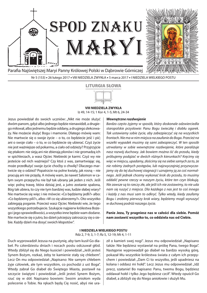SPOD ZNAKU MARYI Parafia Najświętszej Maryi Panny Królowej Polski w Dąbrowie Górniczej Nr 5 (153) • 26 lutego 2017 • VIII NIEDZIELA ZWYKŁA • 5 marca 2017 • I NIEDZIELA WIELKIEGO POSTU LITURGIA SŁOWA | VIII NIEDZIELA ZWYKŁA Iz 49, 14-15; 1 Kor 4, 1-5; Mt 6, 24-34 Jezus powiedział do swoich uczniów: „Nikt nie może służyć dwóm panom, gdyż albo jednego będzie nienawidził, a drugiego miłował, albo jednemu będzie oddany, a drugiego zlekceważy. Nie możecie służyć Bogu i mamonie. Dlatego mówię wam: Nie martwcie się o swoje życie – o to, co będziecie jeść i pić; ani o swoje ciało – o to, w co będziecie się ubierać. Czyż życie nie jest ważniejsze od pokarmu, a ciało od odzieży? Przyjrzyjcie się ptakom: nie sieją ani nie zbierają plonów i nie gromadzą ich w spichlerzach, a wasz Ojciec Niebieski je karmi. Czyż wy nie jesteście od nich ważniejsi? Czy ktoś z was, zamartwiając się, może przedłużyć swoje życie choćby o chwilę? Dlaczego martwicie się o odzież? Popatrzcie na polne kwiaty, jak rosną – nie pracują ani nie przędą. A mówię wam, że nawet Salomon w całym swym przepychu nie był tak ubrany jak jeden z nich. Jeśli więc polną trawę, która dzisiaj jest, a jutro zostanie spalona, Bóg tak ubiera, to czy nie tym bardziej was, ludzie słabej wiary? Nie martwcie się więc i nie mówcie: «Co będziemy jedli?» albo: «Co będziemy pili?», albo: «W co się ubierzemy?». Oto wszystko zabiegają poganie. Przecież wasz Ojciec Niebieski wie, że tego wszystkiego potrzebujecie. Szukajcie najpierw królestwa Bożego i jego sprawiedliwości, a wszystko inne będzie wam dodane. Nie martwcie się o jutro, bo dzień jutrzejszy zatroszczy się o siebie. Każdy dzień ma dosyć swoich kłopotów”. Wewnętrzne rozdwojenie Bardzo często żyjemy w sposób, który doskonale odzwierciedla staropolskie przysłowie: Panu Bogu świeczkę i diabłu ogarek. Tak ustawiamy sobie życie, aby zabezpieczyć się na wszystkich frontach. Nie ma w nim miejsca na zaufanie do Boga. Przecież na wszelki wypadek musimy się sami zabezpieczyć. W ten sposób utrwalamy w sobie wewnętrzne rozdwojenie, które paraliżuje nasz rozwój duchowy. Jak bowiem można iść do przodu, kiedy próbujemy podążać w dwóch różnych kierunkach? Kręcimy się więc w miejscu, upadamy, złościmy się na siebie samych za to, że nie robimy żadnych postępów, lub najzwyczajniej przyzwyczajamy się do tej duchowej stagnacji i uznajemy ją za coś normalnego. Jeśli jednak chcemy wykonać krok do przodu, to musimy oddalić pewne rzeczy w naszym życiu, które ten czyn blokują. Nie zawsze są to rzeczy złe, ale jeśli ich nie zostawimy, to nie uda nam się ruszyć z miejsca. Dla każdego z nas jest to coś innego i każdy z nas musi sam to odkryć. Tylko wtedy, kiedy zaufamy Bogu i zrobimy pierwszy krok wiary, będziemy mogli wyruszyć w duchową podróż naszego życia. Panie Jezu, Ty pragniesz nas w całości dla siebie. Pomóż nam zostawić wszystko to, co oddziela nas od Ciebie. I NIEDZIELA WIELKIEGO POSTU Rdz 2, 7-9; 3, 1-7; Rz 5, 12-19; Mt 4, 1-11 Duch wyprowadził Jezusa na pustynię, aby tam kusił Go diabeł. Po czterdziestu dniach i nocach postu odczuwał głód. Wtedy zbliżył się do Niego kusiciel i powiedział: „Jeśli jesteś Synem Bożym, rozkaż, żeby te kamienie stały się chlebem”. Lecz On mu odpowiedział: „Napisano: Nie samym chlebem żyje człowiek, ale tym wszystkim, co pochodzi z ust Boga”. Wtedy zabrał Go diabeł do Świętego Miasta, postawił na szczycie świątyni i powiedział: „Jeśli jesteś Synem Bożym, rzuć się w dół. Napisano bowiem: Swoim aniołom wyda polecenie o Tobie. Na rękach będą Cię nosić, abyś nie ura- ził o kamień swej nogi”. Jezus mu odpowiedział: „Napisano także: Nie będziesz wystawiał na próbę Pana, twego Boga”. Następnie wyprowadził go diabeł na bardzo wysoką górę, pokazał Mu wszystkie królestwa świata z całym ich przepychem i powiedział: „Dam Ci to wszystko, jeśli upadniesz na kolana i oddasz mi hołd”. Lecz Jezus mu odpowiedział: „Idź precz, szatanie! Bo napisano: Panu, twemu Bogu, będziesz oddawał hołd i tylko Jego będziesz czcił”. Wtedy opuścił Go diabeł, a zbliżyli się do Niego aniołowie i służyli Mu. Moc Słowa Scena kuszenia Jezusa na pustyni ukazuje nam moc słowa Bożego. W obliczu pokusy Ten, który nigdy nie uległ żadnej pokusie, odwołuje się do skarbca Pisma Świętego i wydobywając z niego odpowiednie cytaty, rozbraja przeciwnika. Autor Listu do Hebrajczyków uczy nas: Słowo Boże jest bowiem żywe i skuteczne, ostrzejsze od każdego obosiecznego miecza. Przenika ono aż do rozdzielenia duszy i ducha, stawów i szpiku, rozsądza myśli i zamiary serca. Żadne stworzenie nie ukryje się przed nim (Hbr 4,12-13a). Nie ma więc lepszej obrony w godzinie pokusy niż odwołanie się do słowa Bożego. Ono bowiem ma w sobie moc Tego, który sam jest Słowem. Panie Jezu, Ty jesteś Słowem Ojca. Rozpal w nas miłość do Pisma Świętego i naucz nas uciekać się do niego w godzinie pokusy. d ! e Wielki Post, czas duchowego przygotowania do świąt wielkanocnych W środę popielcową, rozpoczyna się w Kościele czterdziestodniowy czas Wielkiego Postu. Główne przesłanie tego okresu koncentruje się na duchowym przygotowaniu chrześcijan do godnego przeżywania świąt Zmartwychwstania Pańskiego, największych świąt chrześcijaństwa związanych z wydarzeniami męki śmierci i zmartwychwstania (Paschy) Chrystusa; wydarzeniami, które stanowią fundament Kościoła i naszej wiary. Ponieważ są to najważniejsze święta (zwane też paschalnymi), dlatego domagają się specjalnego przygotowania, by móc je należycie przeżyć; stąd też ich nazwa: Wielkiego Postu, a nie zwykłego postu. Historycznie rzecz biorąc, okres ten kształtował się powoli, przyjmując różne formy, by wreszcie osiągnąć znane nam dziś 