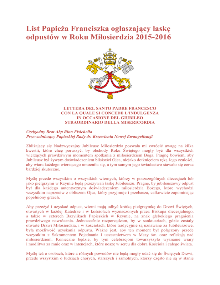 List Papieża Franciszka ogłaszający łaskę odpustów w Roku Miłosierdzia 2015-2016 LETTERA DEL SANTO PADRE FRANCESCO CON LA QUALE SI CONCEDE L'INDULGENZA IN OCCASIONE DEL GIUBILEO STRAORDINARIO DELLA MISERICORDIA Czcigodny Brat Abp Rino Fisichella Przewodniczący Papieskiej Rady ds. Krzewienia Nowej Ewangelizacji Zbliżający się Nadzwyczajny Jubileusz Miłosierdzia pozwala mi zwrócić uwagę na kilka kwestii, które chcę poruszyć, by obchody Roku Świętego mogły być dla wszystkich wierzących prawdziwym momentem spotkania z miłosierdziem Boga. Pragnę bowiem, aby Jubileusz był żywym doświadczeniem bliskości Ojca, niejako dotknięciem ręką Jego czułości, aby wiara każdego wierzącego umocniła się, a tym samym jego świadectwo stawało się coraz bardziej skuteczne. Myślę przede wszystkim o wszystkich wiernych, którzy w poszczególnych diecezjach lub jako pielgrzymi w Rzymie będą przeżywali łaskę Jubileuszu. Pragnę, by jubileuszowy odpust był dla każdego autentycznym doświadczeniem miłosierdzia Bożego, które wychodzi wszystkim naprzeciw z obliczem Ojca, który przyjmuje i przebacza, całkowicie zapominając popełniony grzech. Aby przeżyć i uzyskać odpust, wierni mają odbyć krótką pielgrzymkę do Drzwi Świętych, otwartych w każdej Katedrze i w kościołach wyznaczonych przez Biskupa diecezjalnego, a także w czterech Bazylikach Papieskich w Rzymie, na znak głębokiego pragnienia prawdziwego nawrócenia. Jednocześnie rozporządzam, by w sanktuariach, gdzie zostały otwarte Drzwi Miłosierdzia, i w kościołach, które tradycyjnie są uznawane za Jubileuszowe, była możliwość uzyskania odpustu. Ważne jest, aby ten moment był połączony przede wszystkim z Sakramentem Pojednania i uczestnictwem w Mszy św. oraz refleksją nad miłosierdziem. Konieczne będzie, by tym celebracjom towarzyszyło wyznanie wiary i modlitwa za mnie oraz w intencjach, które noszę w sercu dla dobra Kościoła i całego świata. Myślę też o osobach, które z różnych powodów nie będą mogły udać się do Świętych Drzwi, przede wszystkim o ludziach chorych, starszych i samotnych, którzy często nie są w stanie wyjść z domu. Dla nich będzie wielką pomocą przeżywanie choroby i cierpienia jako doświadczenia bliskości z Panem, który w tajemnicy swojej męki, śmierci i zmartwychwstania wskazuje główną drogę pozwalającą nadać sens bólowi i samotności. Przeżywanie z wiarą i radosną nadzieją tego momentu próby, poprzez przyjęcie komunii św. lub uczestniczenie w Mszy św. i w modlitwie wspólnotowej, również za pośrednictwem różnych środków przekazu, będzie dla nich sposobem uzyskania jubileuszowego odpustu. Myślę też o więźniach, którzy doświadczają ograniczenia wolności. Jubileusz zawsze stanowił okazję do wielkiej amnestii, obejmującej bardzo wiele osób, które choć zasługują na karę, uświadomiły sobie jednak, że to, co uczyniły, było niesprawiedliwe, i szczerze pragną na nowo włączyć się w życie społeczeństwa, wnosząc w nie swój uczciwy wkład. Niech do nich wszystkich dotrze w konkretny sposób miłosierdzie Ojca, który chce być blisko ludzi najbardziej potrzebujących Jego przebaczenia. W kaplicach więziennych będą oni mogli uzyskać odpust, a kiedy będą przechodzili przez drzwi swojej celi, kierując myśli i modlitwę do Ojca, niech za każdym razem ten gest oznacza dla nich przejście przez Drzwi Święte, ponieważ miłosierdzie Boże, które potrafi przemienić serca, jest również w stanie przeobrazić kraty w doświadczenie wolności. Prosiłem, by Kościół odkrył w tym czasie jubileuszowym bogactwo zawarte w uczynkach miłosierdzia co do ciała i duszy. Doświadczenie miłosierdzia staje się bowiem widzialne w świadectwie konkretnych znaków, jak uczył nas sam Jezus. Za każdym razem, kiedy wierny sam wykona jeden lub kilka z tych uczynków, z pewnością otrzyma jubileuszowy odpust. Wiąże się z tym zaangażowanie w życie miłosierdziem, aby otrzymać łaskę pełnego i głębokiego przebaczenia mocą miłości Ojca, który nikogo nie wyklucza. Będzie to więc pełny odpust jubileuszowy, owoc samego wydarzenia, które jest celebrowane i przeżywane z wiarą, nadzieją i miłością. Jubileuszowy odpust można będzie uzyskać również dla zmarłych. Jesteśmy z nimi związani świadectwem wiary i miłości, które nam zostawili. Tak jak pamiętamy o nich podczas Mszy św., tak też możemy, w wielkiej tajemnicy świętych obcowania, modlić się za nich, aby miłosierne oblicze Ojca uwolniło ich od wszelkich pozostałości winy i by mógł On przygarnąć ich do siebie w nieskończonej szczęśliwości. Jednym z poważnych problemów naszych czasów jest z pewnością zmodyfikowany stosunek do życia. Bardzo rozpowszechniona mentalność doprowadziła do utraty należytej wrażliwości indywidualnej i społecznej na kwestię przyjmowania nowego życia. Dramat aborcji przeżywany jest przez niektóre osoby ze świadomością powierzchowną, jakby niemal nie zdawały sobie sprawy z tego, jak wielkim złem jest ten akt. Wiele innych natomiast, choć przeżywa ten moment jako porażkę, uważa, że nie mają innej drogi. Myślę w szczególności o wszystkich kobietach, które poddały się aborcji. Dobrze znam uwarunkowania, które doprowadziły je do podjęcia tej decyzji. Wiem, że jest to dramat egzystencjalny i moralny. Spotkałem wiele kobiet, które nosiły w sercu blizny pozostawione przez ten ciężki i bolesny wybór. To, co się wydarzyło, jest głęboko niesłuszne; jednakże tylko wtedy, gdy zrozumie się to w prawdzie, można nie stracić nadziei. Przebaczenia Bożego nie można odmówić nikomu, kto żałuje, zwłaszcza jeśli ze szczerym sercem przystępuje do Sakramentu Spowiedzi, by pojednać się z Ojcem. Również z tego powodu postanowiłem, mimo wszelkich przeciwnych rozporządzeń, upoważnić wszystkich kapłanów w Roku Jubileuszowym do r