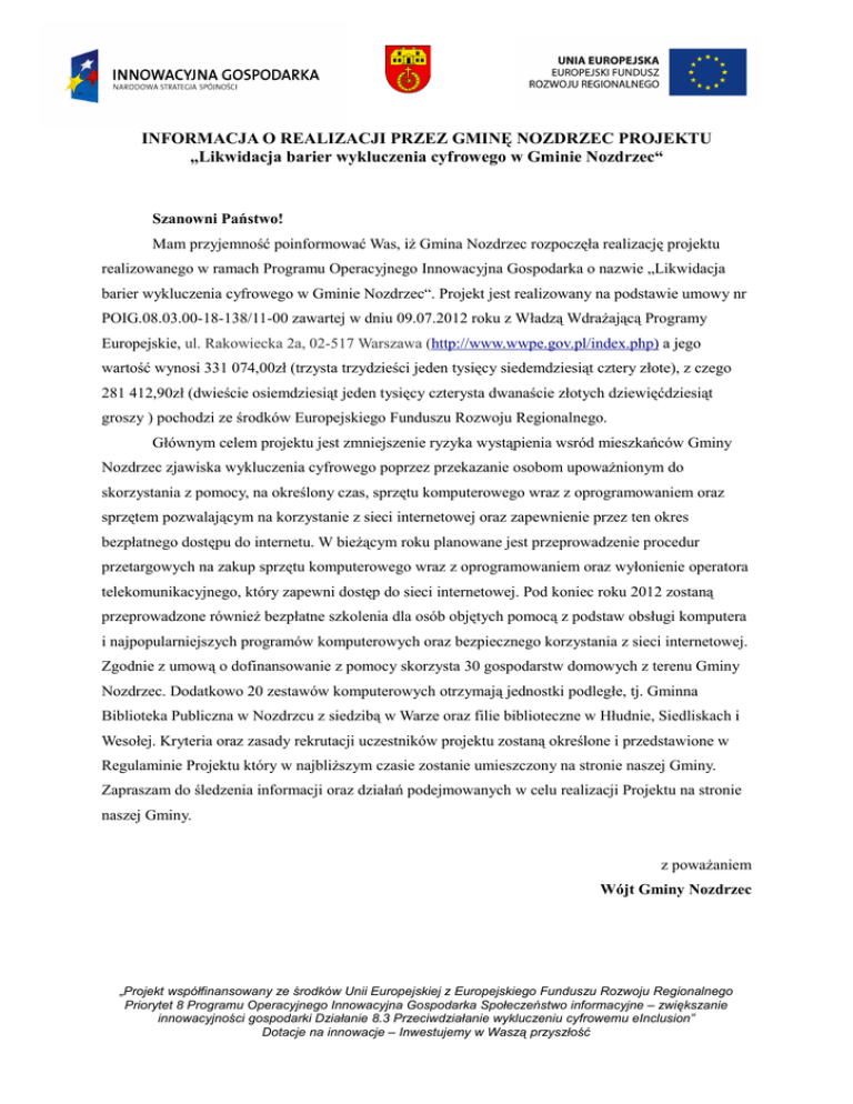 INFORMACJA O REALIZACJI PRZEZ GMINĘ NOZDRZEC PROJEKTU „Likwidacja barier wykluczenia cyfrowego w Gminie Nozdrzec“ Szanowni Państwo! Mam przyjemność poinformować Was, iż Gmina Nozdrzec rozpoczęła realizację projektu realizowanego w ramach Programu Operacyjnego Innowacyjna Gospodarka o nazwie „Likwidacja barier wykluczenia cyfrowego w Gminie Nozdrzec“. Projekt jest realizowany na podstawie umowy nr POIG.08.03.00-18-138/11-00 zawartej w dniu 09.07.2012 roku z Władzą Wdrażającą Programy Europejskie, ul. Rakowiecka 2a, 02-517 Warszawa (http://www.wwpe.gov.pl/index.php) a jego wartość wynosi 331 074,00zł (trzysta trzydzieści jeden tysięcy siedemdziesiąt cztery złote), z czego 281 412,90zł (dwieście osiemdziesiąt jeden tysięcy czterysta dwanaście złotych dziewięćdziesiąt groszy ) pochodzi ze środków Europejskiego Funduszu Rozwoju Regionalnego. Głównym celem projektu jest zmniejszenie ryzyka wystąpienia wsród mieszkańców Gminy Nozdrzec zjawiska wykluczenia cyfrowego poprzez przekazanie osobom upoważnionym do skorzystania z pomocy, na określony czas, sprzętu komputerowego wraz z oprogramowaniem oraz sprzętem pozwalającym na korzystanie z sieci internetowej oraz zapewnienie przez ten okres bezpłatnego dostępu do internetu. W bieżącym roku planowane jest przeprowadzenie procedur przetargowych na zakup sprzętu komputerowego wraz z oprogramowaniem oraz wyłonienie operatora telekomunikacyjnego, który zapewni dostęp do sieci internetowej. Pod koniec roku 2012 zostaną przeprowadzone również bezpłatne szkolenia dla osób objętych pomocą z podstaw obsługi komputera i najpopularniejszych programów komputerowych oraz bezpiecznego korzystania z sieci internetowej. Zgodnie z umową o dofinansowanie z pomocy skorzysta 30 gospodarstw domowych z terenu Gminy Nozdrzec. Dodatkowo 20 zestawów komputerowych otrzymają jednostki podległe, tj. Gminna Biblioteka Publiczna w Nozdrzcu z siedzibą w Warze oraz filie biblioteczne w Hłudnie, Siedliskach i Wesołej. Kryteria oraz zasady rekrutacji uczestników projektu zostaną określone i przedstawione w Regulaminie Projektu który w najbliższym czasie zostanie umieszczony na stronie naszej Gminy. Zapraszam do śledzenia informacji oraz działań podejmowanych w celu realizacji Projektu na stronie naszej Gminy. z poważaniem Wójt Gminy Nozdrzec „Projekt współfinansowany ze środków Unii Europejskiej z Europejskiego Funduszu Rozwoju Regionalnego Priorytet 8 Programu Operacyjnego Innowacyjna Gospodarka Społeczeństwo informacyjne – zwiększanie innowacyjności gospodarki Działanie 8.3 Przeciwdziałanie wykluczeniu cyfrowemu eInclusion” Dotacje na innowacje – Inwestujemy w Waszą przyszłość