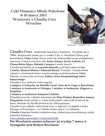 Cykl Flamenco Młode Pokolenie 8-10 marca 2013 Warsztaty z Claudia Cruz Wrocław Ilustracja 1: Claudia Cruz Claudia Cruz- znakomita tancerka z Kadyksu. Urodziła się w 1986r. Rozpoczęla naukę już w wieku 5 lat, w Akadami Cibayi pod kierunkiem Charo Cruz. Przez wiele lat doskonaliła swoje umiejetnosci taneczne u takich artystow jak: Juana Amaya, Javier Latorre, La Chana,Belen Maya, Rafaela Carrasco i wielu innych. Claudia kształcila swoj warsztat aktorski, pod kierunkiem Caco Castelo, Manuel Moron i Eduardo Bernal. Ponadto Claudia brala udzial w warsztatch tańca wspolczesnego pod kierunkiem Mijita Dakota, uczeszczala na kursy baletu i kurs hiszpańskiego tańca klasycznego. Claudia Cruz zdobyła wiele nagród. 1 miejsce w kokursie im Matilde Coral i Jose de la Vega w Barcelonie, 1 miejsce w konkursie w Ubrique, 1 miejsce w konkursie Alegrias w Kadyksie 1 miejsce w konkursie Estepona Cantora. Współpracowala z takimi artystami jak Nina Pastori, Remedios Amaya, Duquende, brala udzial w wielu festiwalach, takich jak Festiwal de Jerez, Bennale de Sevilla,Festiwal de Alburquerque. Claudia Cruz odbyła wiele turne m:in w Japonii, wystąpiła u boku Enrique el Extremeno , La Tobala, Pedro sierra i La Moneta. Claudia Cruz jest bardzo utalentowaną, obdarzoną niecodzienną urodą tancerką flamenco. www.youtube.com/watch?v=UoyLNouVt5M We Wrocławiu można zobaczyć jej występ 7 marca w Synagodze pod Białym Bocianem. Program warsztatów Nauka tańca na trzech poziomach zaawansowania, technika stepowania, układy choreograficzne, praca nad wyrazem artystycznym. Lekcje po 1 godz.30 min w sumie 4 godz. 30 min każda grupa: Solea por bulerias - grupa zaawansowana Guajiras z wachlarzem --grupa średnia* Bulerias de Cadiz - grupa początkująca • można u mnie wypożyczyć lub zamówić wachlarz • Dla osób zainteresowanych śpiewem flamenco możliwość lekcji śpiewu ze śpiewakiem , który przyjeżdża na koncert 6-7 marca ,lekcje w małych grupach, cena w zależności od ilości osób, proszę o kontakt Rozkład zajęć Piątek 17.30 -19.00 grupa początkująca 19.00-20.30 grupa średnia 20.30-22.00 grupa zaawansowana sobota i niedziela 10.00 – 11.30 grupa zaawansowana 11.30 - 13.00 grupa średnia 13.00 - 14.30 grupa początkująca Miejsce : Szkoła „Tropical Dance „ul. Świdnicka 19 IV piętro zapisy tel :507329844 mail : [email protected] Ceny: Jeden kurs 380 zł dwa kursy 600 zł trzy kursy 800 zł Wpłaty całej kwoty do końca lutego! na konto: Arte Flamenco Katarzyna Małecka Przybyszewskiego 15/3 51-151 Wrocław 06 1500 1155 1211 50061 951 0000ia K O/Wrocław, pl .Solny 14 Numer konta : 06 1500 1155 1211 5006 1951 0000 Filia KB SA nr.2 we Wrocławiu I O/Wrocław, pl .Solny 14 Numer konta : 06 1500 1155 1211 5006 1951 0000„ ARTE FLAMENCO ” Filia KB SA nr.2 we Wrocławiu I O/Wrocław, pl .Solny 14 Numer konta : 06 1500 1155 1211 5006 1951 0000 Filia KB SA nr.2 we Wrocławiu I O/Wrocław, pl .Solny 14 Numer konta : 06 1500 1155 1211 5006 1951 00