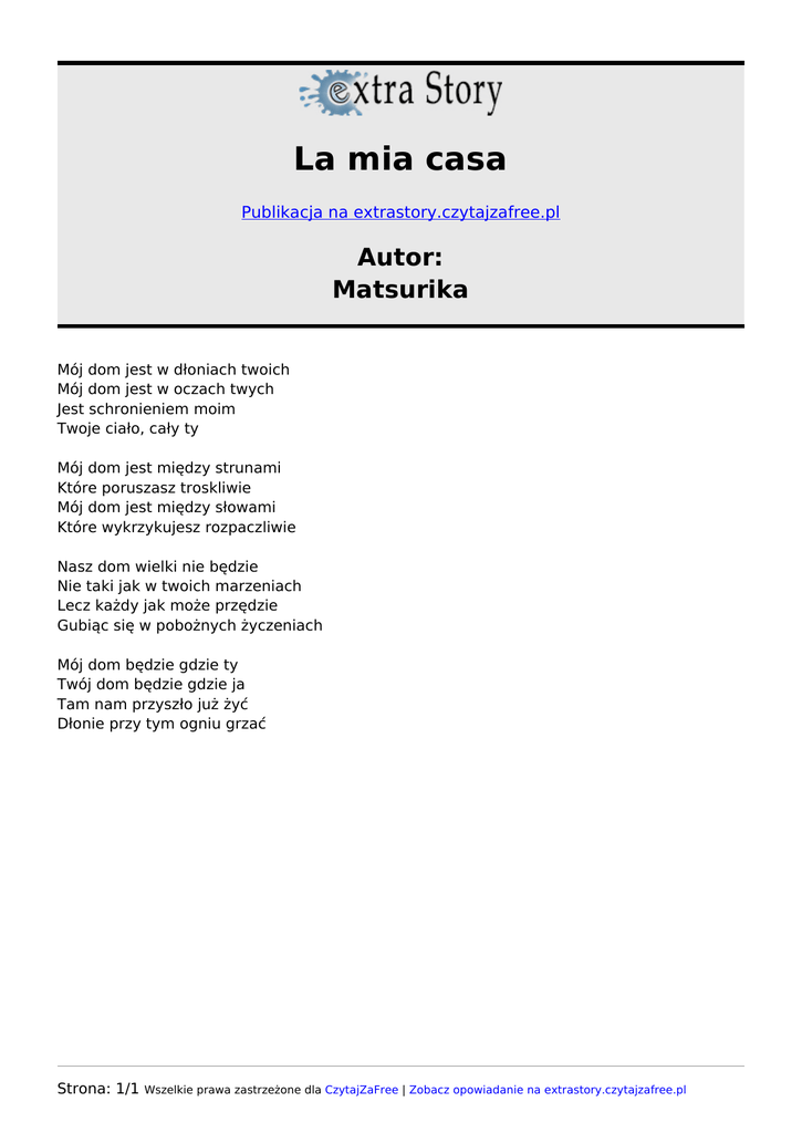 La mia casa Publikacja na extrastory.czytajzafree.pl Autor: Matsurika Mój dom jest w dłoniach twoich Mój dom jest w oczach twych Jest schronieniem moim Twoje ciało, cały ty Mój dom jest między strunami Które poruszasz troskliwie Mój dom jest między słowami Które wykrzykujesz rozpaczliwie Nasz dom wielki nie będzie Nie taki jak w twoich marzeniach Lecz każdy jak może przędzie Gubiąc się w pobożnych życzeniach Mój dom będzie gdzie ty Twój dom będzie gdzie ja Tam nam przyszło już żyć Dłonie przy tym ogniu grzać Strona: 1/1 Wszelkie prawa zastrzeżone dla CzytajZaFree | Zobacz opowiadanie na extrastory.czytajzafree.pl