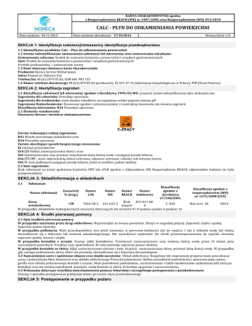 KARTA CHARAKTERYSTYKI zgodna z Rozporządzeniem REACH (WE) nr 1907/2006 oraz Rozporządzeniem (WE) 453/2010 CALC - PŁYN DO ODKAMIENIANIA POWIERZCHNI Data wydania: 04.11.2013 Data ostatniej aktualizacji: 17.10.2014 Strona/stron 1/5 SEKCJA 1: Identyfikacja substancji/mieszaniny identyfikacja przedsiębiorstwa 1.1 Identyfikator produktu: Calc – Płyn do odkamieniania powierzchni 1.2 Istotne zidentyfikowane zastosowania substancji lub mieszaniny oraz zastosowania odradzane: Zastosowania zalecane: Środek do usuwania kamienia z powierzchni i urządzeń gastronomicznych Opis: Środek do usuwania kamienia z powierzchni i urządzeń gastronomicznych Produkt profesjonalny – zastosowanie ręczne 1.3 Dane dotyczące dostawcy karty charakterystyki Producent Horeca Service Michał Janiec Adres Poznań ul. Skibowa 43a Telefon/fax 48 (61) 879 85 82; GSM 601 983 155 1.4 Numer telefonu alarmowego 48 (61) 879 85 82 (producent), 42 631 47 24 (informacja toksykologiczna w Polsce), 998 (Straż Pożarna) SEKCJA 2: Identyfikacja zagrożeń 2.1 Klasyfikacja substancji lub mieszaniny zgodnie z Dyrektywą 1999/45/WE: preparat został zaklasyfikowany jako niebezpieczny Zagrożenia dla człowieka: Powoduje oparzenia Zagrożenia dla środowiska: może działać szkodliwie na organizmy wodne poprzez zmianę pH Zagrożenia fizykochemiczne: Stosowany zgodnie z przeznaczeniem i z instrukcją stosowania nie stwarza zagrożeń Klasyfikacja mieszaniny: R34 Powoduje oparzenia 2.2 Elementy oznakowania Oznaczenia literowe i określenie niebezpieczeństwa C-ŻRĄCY Zwroty wskazujące rodzaj zagrożenia: R41 Ryzyko poważnego uszkodzenia oczu R34 Powoduje oparzenia Zwroty określające sposób bezpiecznego stosowania: S2 Chronić przed dziećmi S24/25 Unikać zanieczyszczenia skóry i oczu S26 Zanieczyszczone oczy przemyć natychmiast dużą ilością wody i zasięgnąć porady lekarza S36/37/39 – nosić odpowiednią odzież ochronną, rękawice ochronne i okulary lub ochronę twarzy S46 W razie połknięcia zasięgnąć porady lekarza, jeżeli to możliwe, pokaż etykietę 2.3 Inne zagrożenia: Brak informacji na temat spełnienia kryteriów PBT lub vPvB zgodnie z Załącznikiem XIII Rozporządzenia REACH, odpowiednie badania nie były przeprowadzone SEKCJA 3: Skład/Informacja o składnikach 3.1 Substancje: Nazwa substancji: Zawartość % [wag.] Numer CAS Numer WE Numer REACH Numer indeksowy Klasyfikacja zgodnie z dyrektywą 67/548/EWG Kwas Brak 015-011-00>30 7664-38-2 231-633-2 C: R34 ortofosforowy danych 6 W przypadku składników niebezpiecznych znaczenie dotyczących ich zwrotów R i H podane zostało w punkcie 16 Klasyfikacja zgodnie z rozporządzeniem (WE) nr 1272/2008 [CLP] Skin Corr. 1B H314 SEKCJA 4: Środki pierwszej pomocy 4.1 Opis środków pierwszej pomocy W przypadku narażenia przez drogi oddechowe: Wyprowadzić na świeże powietrze. Ułożyć w wygodnej pozycji. Zapewnić ciepło i spokój. Zapewnić pomoc lekarską W przypadku połknięcia: Mało prawdopodobne, lecz jeżeli zaistnieje, w pierwszej kolejności dać do wypicia 1 lub 2 szklanki wody lub mleka, skontaktować się z lekarzem lub centrum toksykologicznego. Nie wywoływać wymiotów. Do chwili przetransportowania do szpitala choremu zapewnić spokój, leżenie i ciepło. W przypadku kontaktu z oczami: Usunąć szkła kontaktowe. Przemywać zanieczyszczone oczy większą ilością wody przez 15 minut, przy wywiniętych powiekach. Przykryć oczy opatrunkiem. W razie potrzeby zapewnić pomoc okulisty. W przypadku kontaktu ze skórą: Zdjąć zanieczyszczone ubranie i buty. Oczyścić zanieczyszczoną skórę, przemyć dużą ilością wody. W przypadku, gdy wystąpi podrażnienie skóry, które nie przemija, skonsultować się z lekarzem dermatologiem. 4.2 Najważniejsze ostre i opóźnione objawy oraz skutki narażenia: Układ oddechowy: Rozpylony lub rozpraszany preparat może powodować urazy i podrażnienia błon śluzowych oraz układu oddechowego Przewód pokarmowy: Będzie powodował podrażnienia i oparzenia jamy ustnej , gardła oraz układu pokarmowego Kontakt z oczami: Może powodować podrażnienia , zaczerwienienia a także nieodwracalne uszkodzenia jeśli zaraz po kontakcie oczy nie zostaną natychmiast przemyte wodą Kontakt ze skórą: Powoduje oparzenia i zaczerwienienia. 4.3 Wskazania dotyczące wszelkiej natychmiastowej pomocy lekarskiej i szczególnego postępowania z poszkodowanym Decyzję o sposobie postępowania podejmuje lekarz po ocenie stanu poszkodowanego SEKCJA 5: Postępowanie w przypadku pożaru KARTA CHARAKTERYSTYKI zgodna z Rozporządzeniem REACH (WE) nr 1907/2006 oraz Rozporządzeniem (WE) 453/2010 CALC - PŁYN DO ODKAMIENIANIA POWIERZCHNI Data wydania: 04.11.2013 Data ostatniej aktualizacji: 17.10.2014 Strona/stron 2/5 5.1 Środki gaśnicze Odpowiednie środki gaśnicze: Stosować standardowe metody gaśnicze odpowiednie do warunków otoczenia: woda, ditlenek wegla CO2, proszki gaśnicze, piana gaśnicza odporna na alkohol Niewłaściwe środki gaśnicze: Nie sprecyzowano 5.2 Szczególne zagrożenia związane z substancją lub mieszaniną Produkty spalania: Podczas spalania mogą się tworzyć tlenki węgla i azotu 5.3 Informacje dla straży pożarnej Pojemniki znajdujące się w strefie pożaru chłodzić rozproszonym strumieniem wody, o ile jest to możliwe usunąć ze strefy zagrożenia. W przypadku pożaru w zamkniętym pomieszczeniu należy stosować odzież ochronną i aparat oddechowy na sprężone powietrze. Nie dopuszczać do przedostania się wody gaśniczej do wód powierzchniowych, gruntowych i kanalizacji. SEKCJA 6: Postępowanie w przypadku niezamierzonego uwolnienia do środowiska 6.1 Indywidualne środki ostrożności, wyposażenie ochronne i procedury w sytuacjach awaryjnych Osoby udzielające pomocy powinny ubrania robocze ze zwartej tkaniny, rękawice ochronne, okulary ochronne w szczelnej obudowie, ochrony dróg oddechowych. W przypadku niezamierzonego rozlewu nakazać opuszczenie obszaru dz