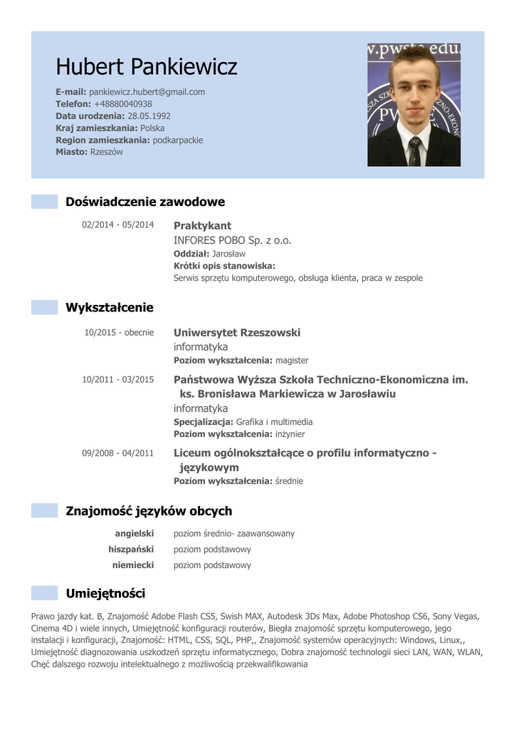 Hubert Pankiewicz E-mail: [email protected] Telefon: +48880040938 Data urodzenia: 28.05.1992 Kraj zamieszkania: Polska Region zamieszkania: podkarpackie Miasto: Rzeszów Doświadczenie zawodowe 02/2014 - 05/2014 Praktykant INFORES POBO Sp. z o.o. Oddział: Jarosław Krótki opis stanowiska: Serwis sprzętu komputerowego, obsługa klienta, praca w zespole Wykształcenie 10/2015 - obecnie Uniwersytet Rzeszowski informatyka Poziom wykształcenia: magister 10/2011 - 03/2015 Państwowa Wyższa Szkoła Techniczno-Ekonomiczna im. ks. Bronisława Markiewicza w Jarosławiu informatyka Specjalizacja: Grafika i multimedia Poziom wykształcenia: inżynier 09/2008 - 04/2011 Liceum ogólnokształcące o profilu informatyczno językowym Poziom wykształcenia: średnie Znajomość języków obcych angielski poziom średnio- zaawansowany hiszpański poziom podstawowy niemiecki poziom podstawowy Umiejętności Prawo jazdy kat. B, Znajomość Adobe Flash CS5, Swish MAX, Autodesk 3Ds Max, Adobe Photoshop CS6, Sony Vegas, Cinema 4D i wiele innych, Umiejętność konfiguracji routerów, Biegła znajomość sprzętu komputerowego, jego instalacji i konfiguracji, Znajomość: HTML, CSS, SQL, PHP,, Znajomość systemów operacyjnych: Windows, Linux,, Umiejętność diagnozowania uszkodzeń sprzętu informatycznego, Dobra znajomość technologii sieci LAN, WAN, WLAN, Chęć dalszego rozwoju intelektualnego z możliwością przekwalifikowania Kursy, szkolenia i certyfikaty 09/2010 CISCO IT Essentials Organizator: Cisco Szkolenia dotyczące komunikacji interpersonalnej Organizator: Krzysztof Janowski Szkolenia dotyczące baz danych Organizator: Państwowa Wyższa Szkoła Techniczno-Ekonomiczna im. ks. Bronisława Markiewicza w Jarosławiu Szkolenie dotyczące stron WWW Organizator: Państwowa Wyższa Szkoła Techniczno-Ekonomiczna im. ks. Bronisława Markiewicza w Jarosławiu Szkolenie z przedsiębiorczości Organizator: Państwowa Wyższa Szkoła Techniczno-Ekonomiczna im. ks. Bronisława Markiewicza w Jarosławiu Organizacje, aktywności i stowarzyszenia 09/2008 - 03/2011 Grupa administrująca stroną WWW Miejsce: Bircza Zainteresowania Informatyka, Grafika 3D, Sport, Literatura, Muzyka, Nowe technologie Wyrażam zgodę na przetwarzanie danych osobowych zawartych w mojej aplikacji dla potrzeb niezbędnych do realizacji procesów rekrutacyjnych zgodnie z ustawą z dnia 29 sierpnia1997 r. o ochronie danych osobowych (tj. Dz. U. z 2014 r. poz. 1182).
